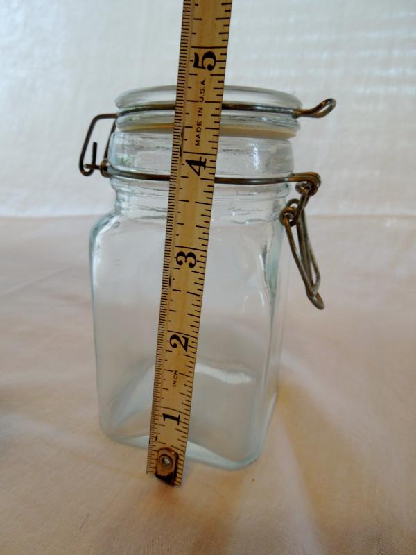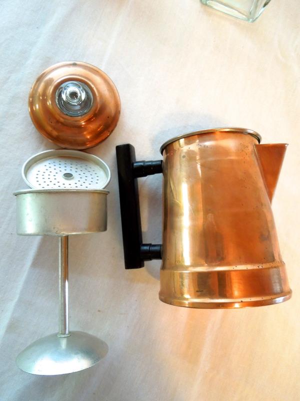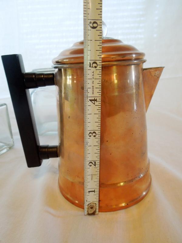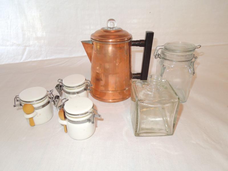 3 small covered latching storage containers with 2 wood spoons; 1 vintage clean copper coffee pot with insert; clear glass latching storage keeper and a clear glass square jar no lid.