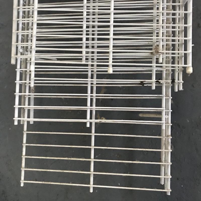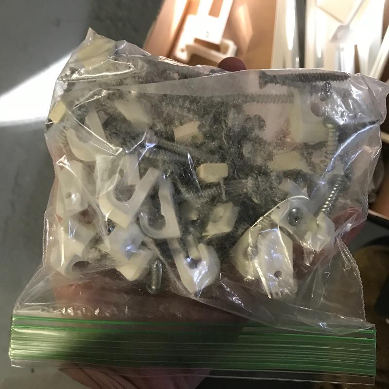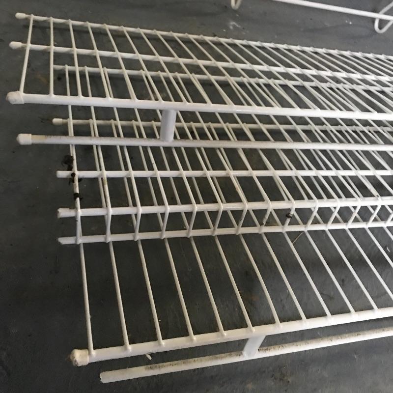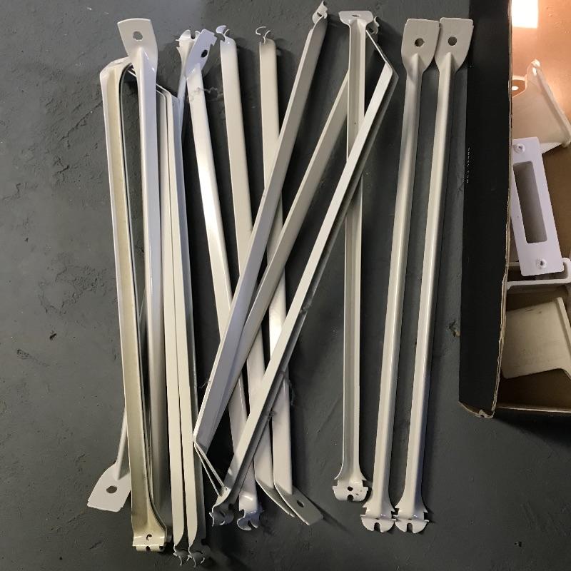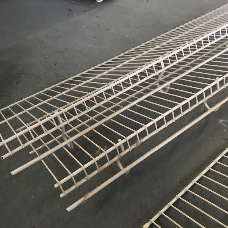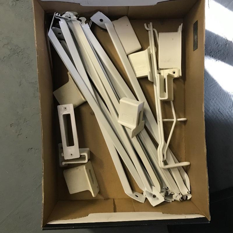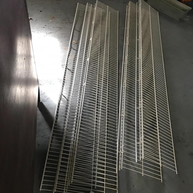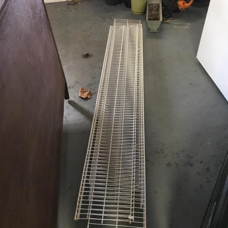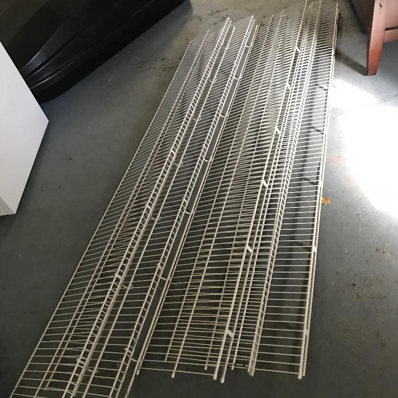 Five white metal wire shelves perfect for closets, work shops or where ever you need. All five are 7’ x 1’. Two have hooks every foot with a lower wire rack perfect for hangers. Fifteen metal brackets with other hardware included in lot. See photos. Local pick up only.
