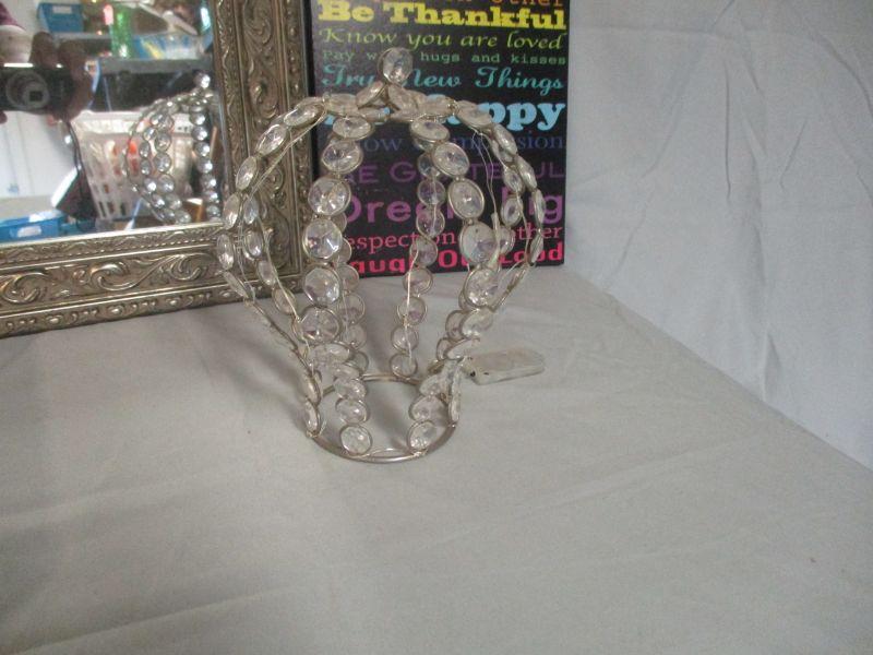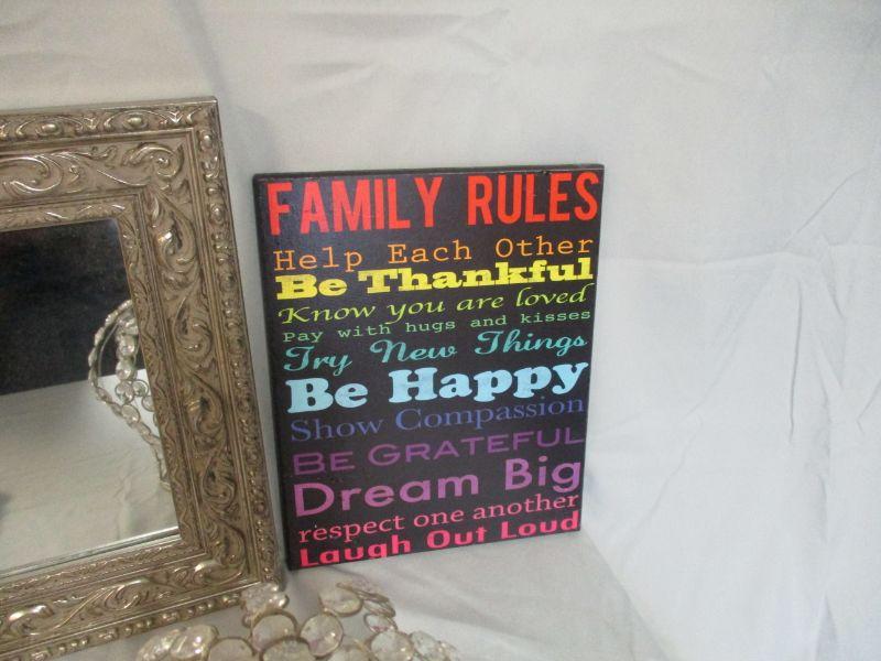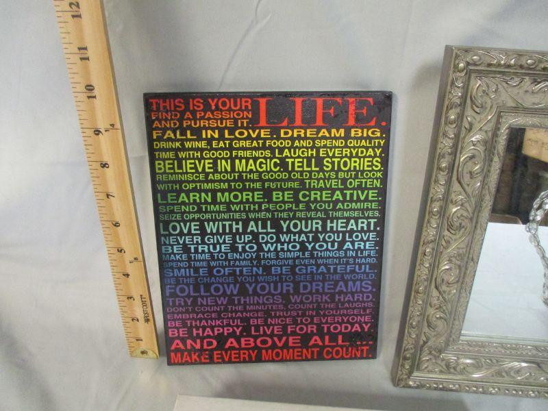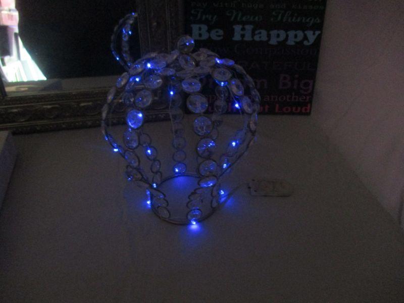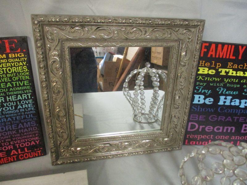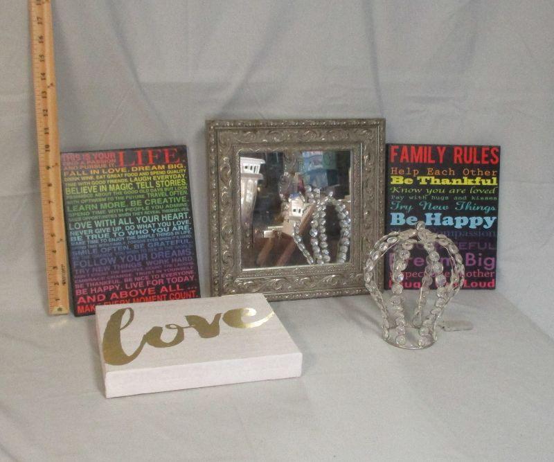The mirror is about 11.75" square and all of the pieces are in very good condition. The one piece uses batteries and lights up with blue lights when switched on.