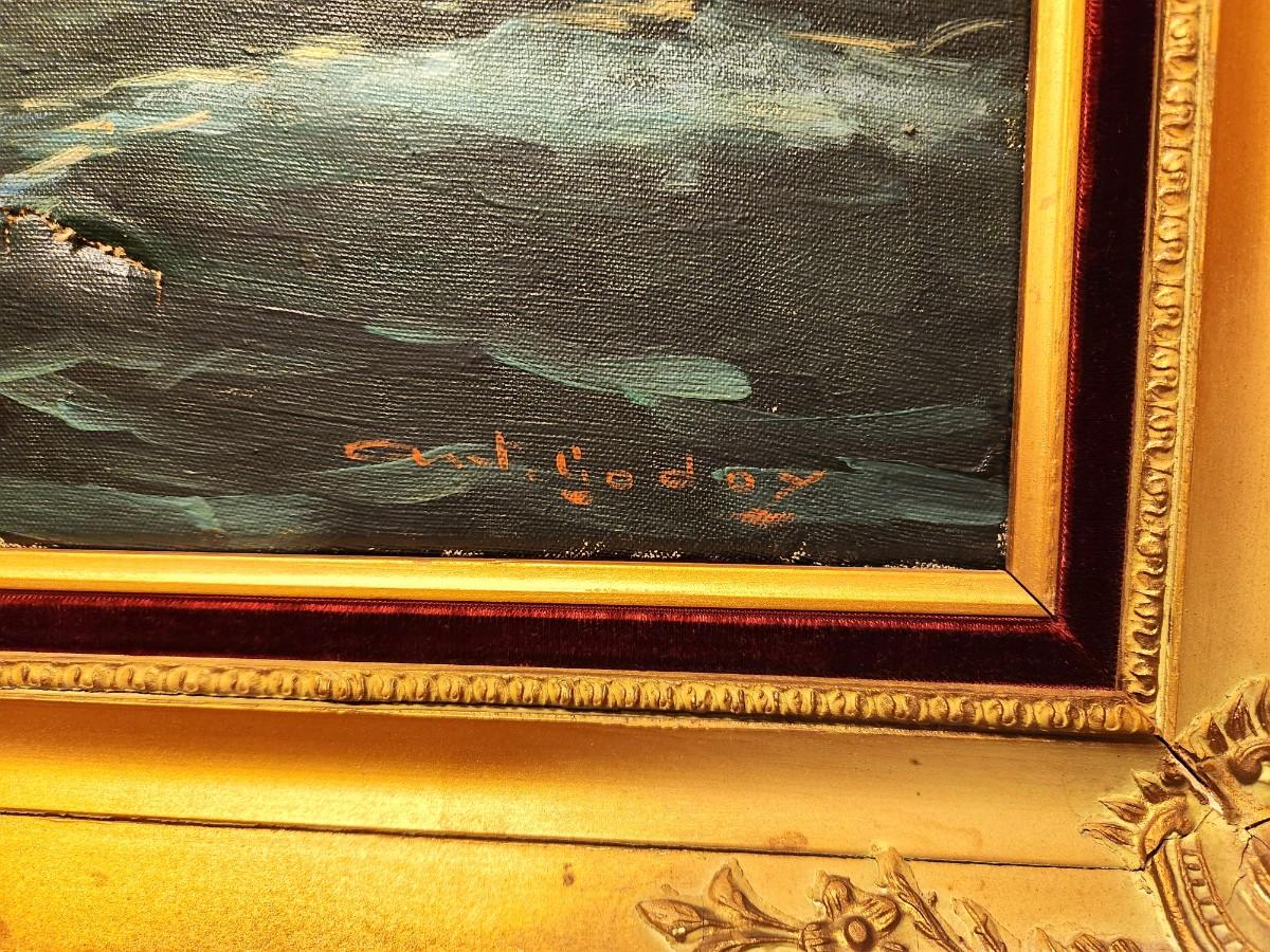 Well executed painting of a ship at sea - handsome frame - signed GODOY - Note: canvas has a puncture (shown). Measures 35.5" across, 28" tall. The frame alone is worth the money.