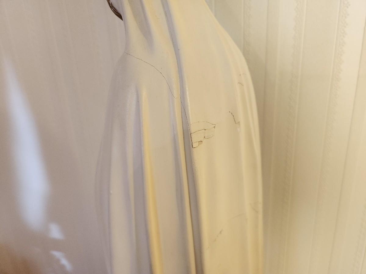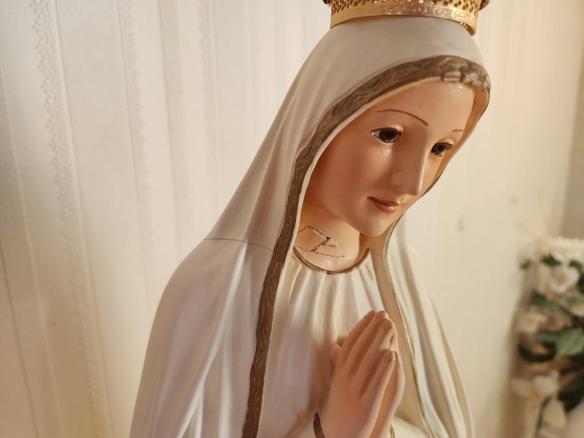Our Lady of Fatima plaster statue - 31" tall with crown on base. Note: She is broken about the head and shoulders and has been repaired. Please see photos.