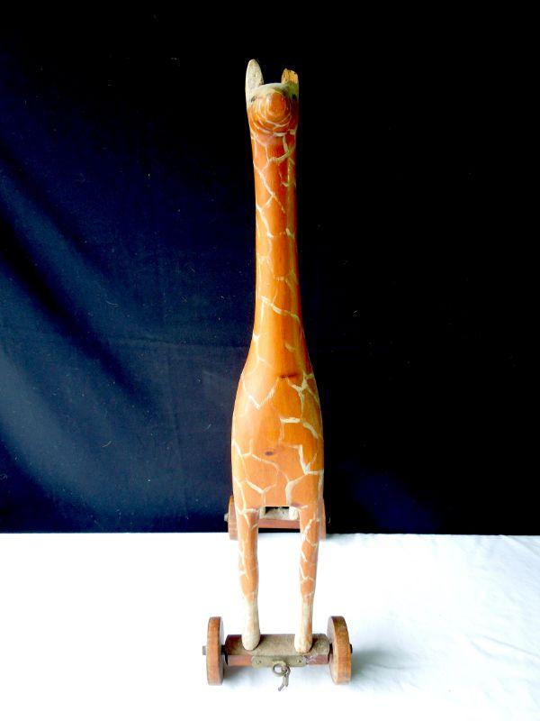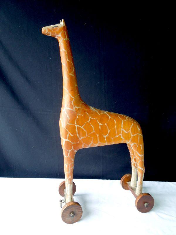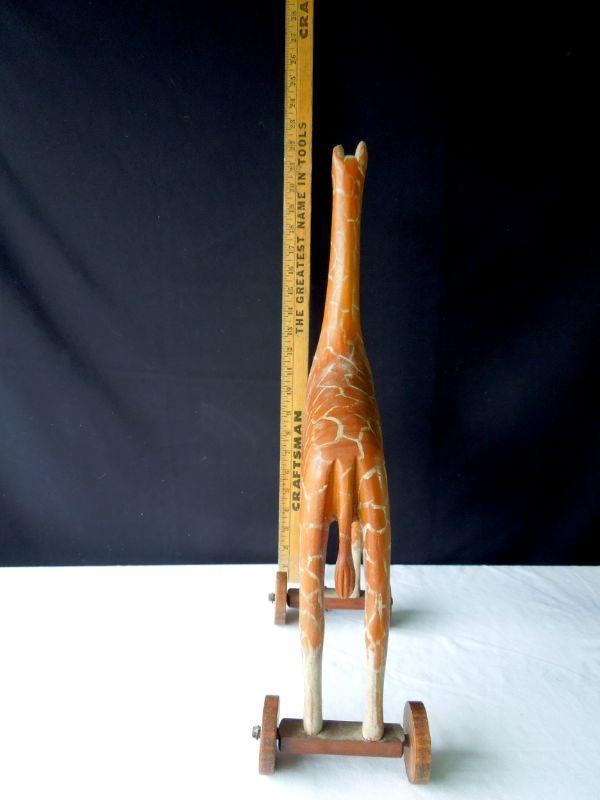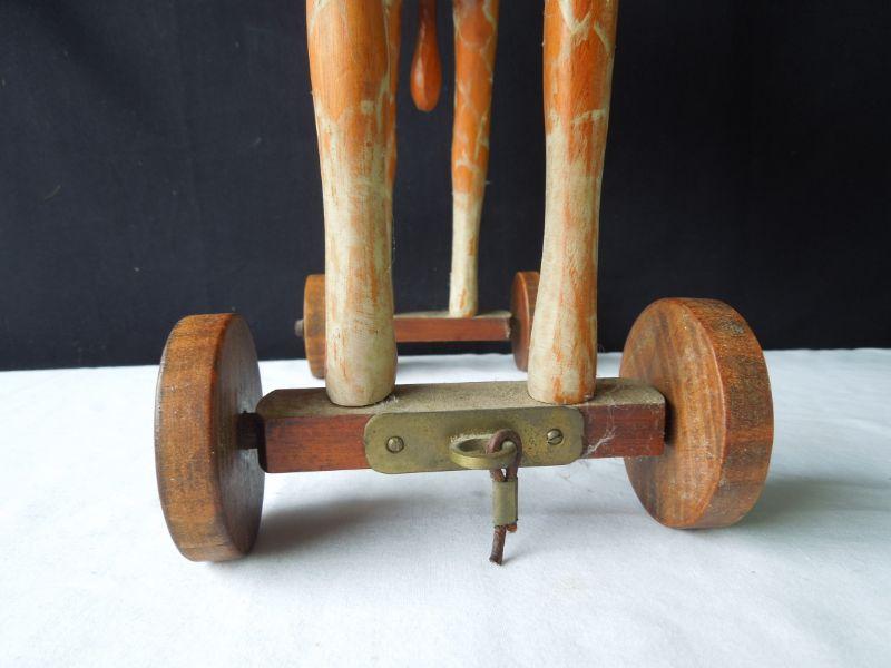 21" H x 11" L x 5.5" D. Brass hardware on front. Wheels roll well. Damage to one ear. Age and origin unknown.
