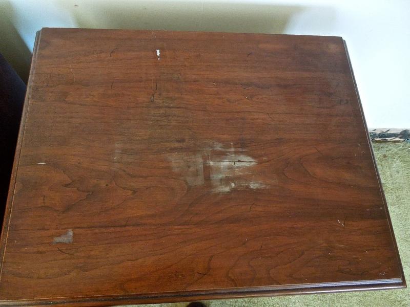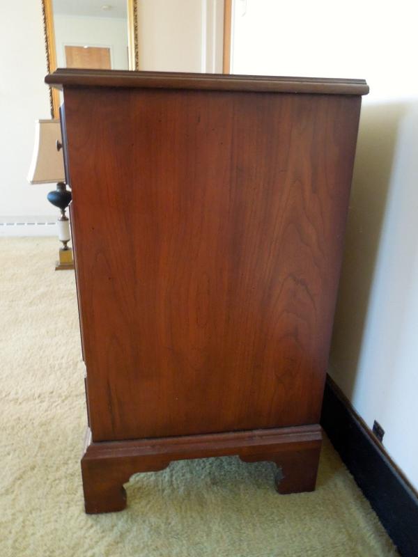Made in Virginia of Black Cherry. Batwing brass hardware. Chippendale early american style. Dovetailed drawers. Minimal surface scratches. 22" L x 17" W x 29" H. Hinged door lowers for storage. Lower drawer on one has sticky jelly like substance that needs wiping clean. Top of one is also coated with residue. Scratches on top. Matches dressers being sold separately.