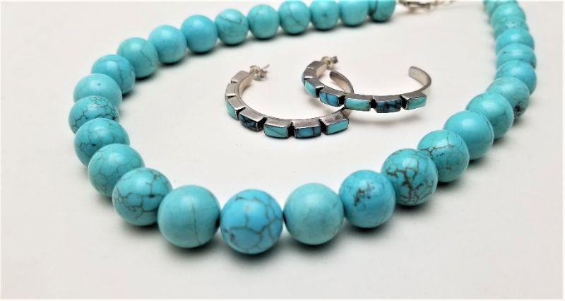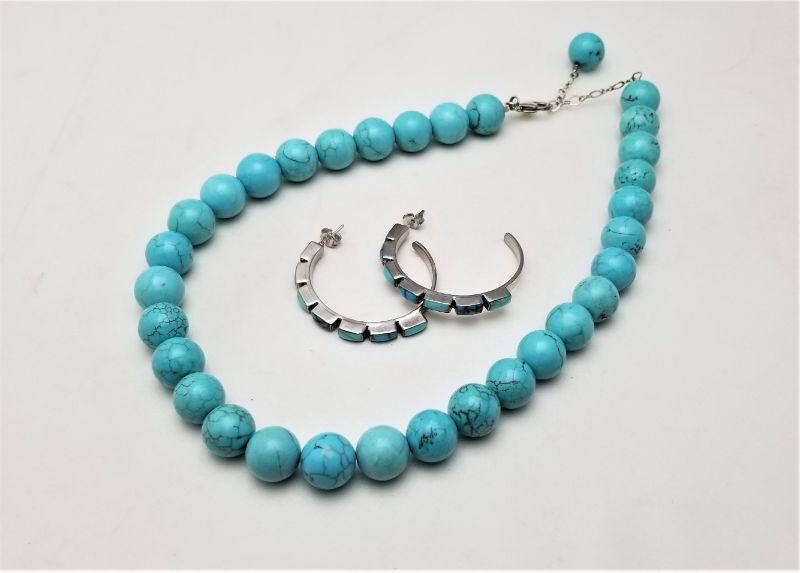 Nice two-piece lot here - polished natural turquoise bead necklace with sterling clasp - pair of pierced earrings done in sterling silver with natural turquoise accents. Necklace is 17" long and is adjustable. Earrings measure 1.75" across. Gently worn.