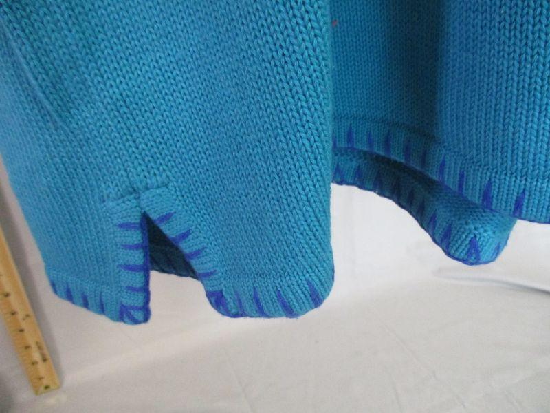 This sweater looks brand new. It is made of 55% Acrylic and 45% Cotton and can be hand washed.