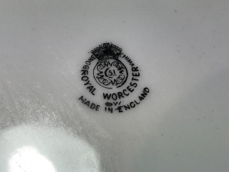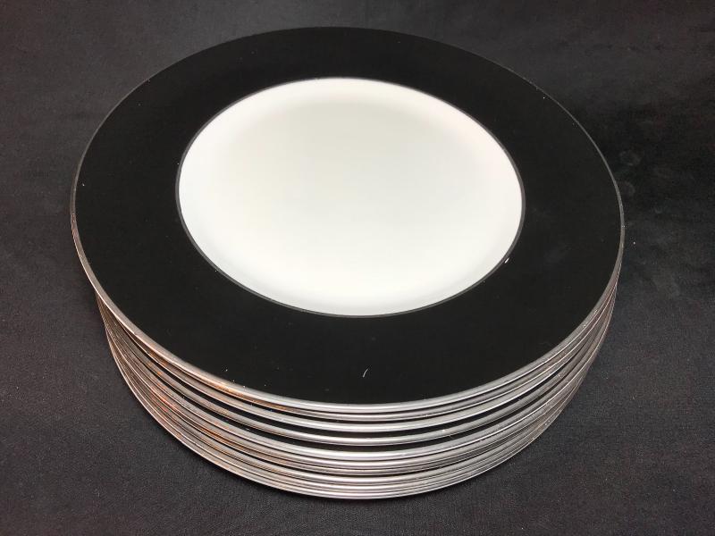 Great set of Royal Worcester dinner plates. Black rim on white ground with silver banding. Excellent condition. 10 1/2" D.