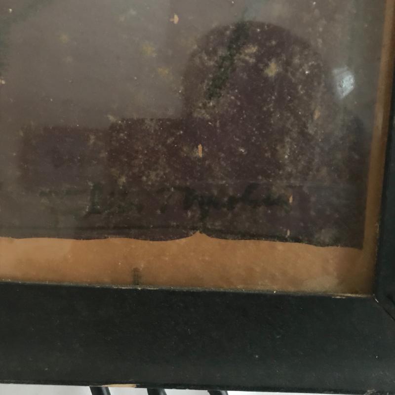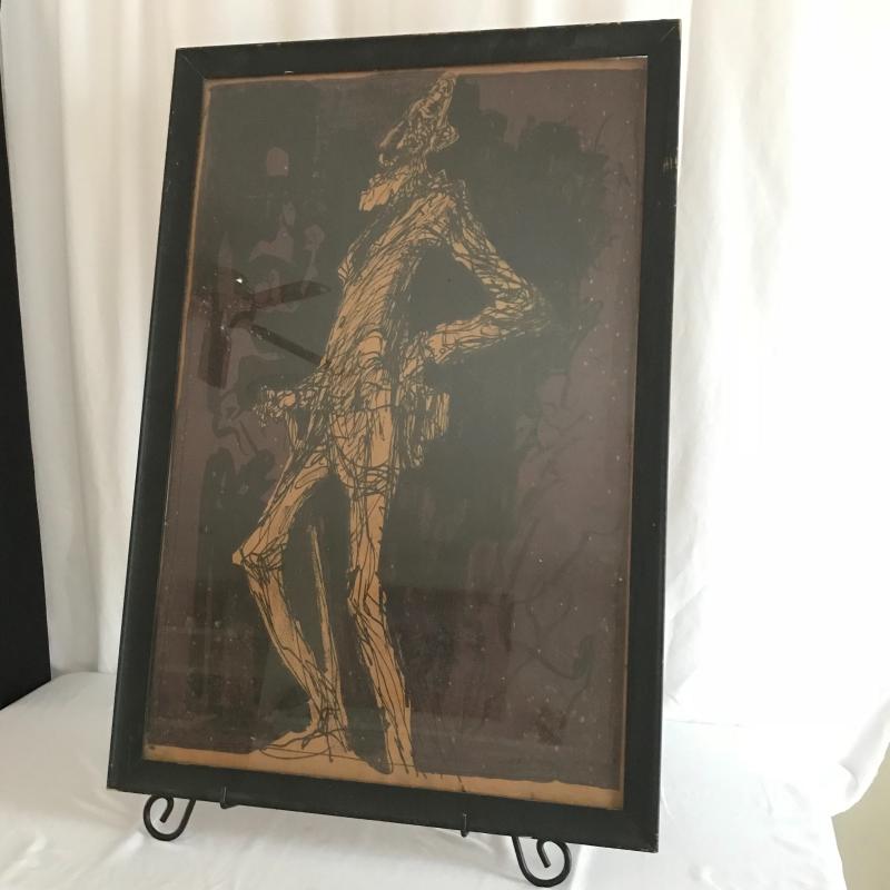 Black framed artwork. Appears to be brown paper with black ink on a plum color background. Artist signed but unable to identify. Frame needs reinforcing. Piece measures 36.5” x25”. This Lot is available for shipping or local pick up in Asheville, NC.
