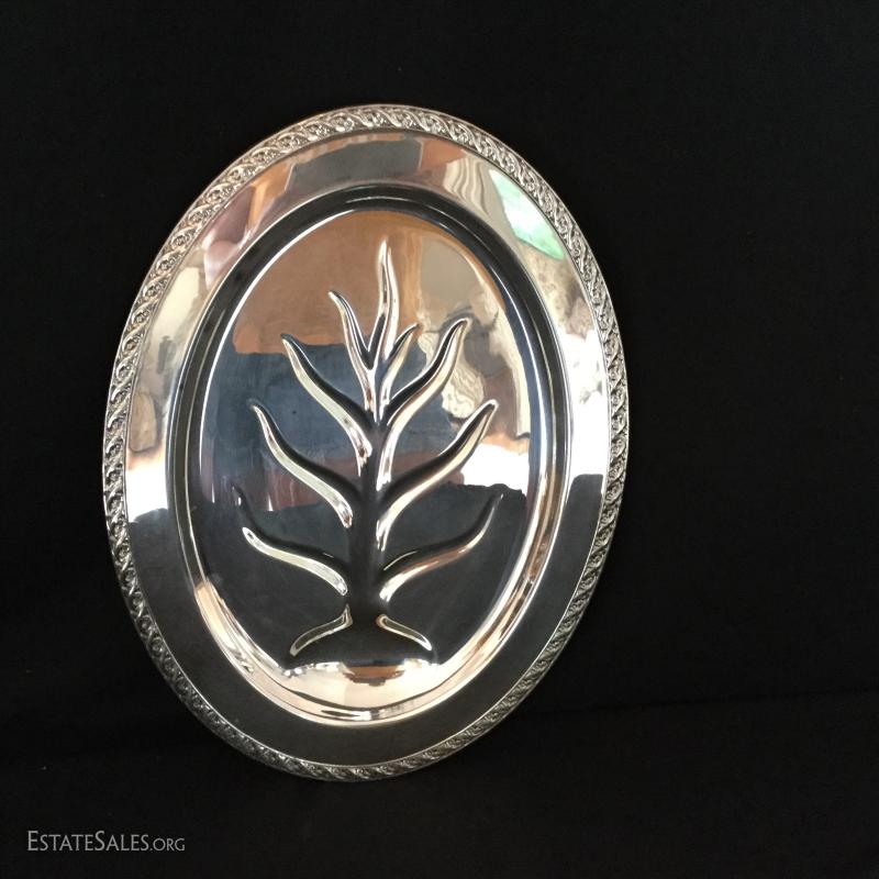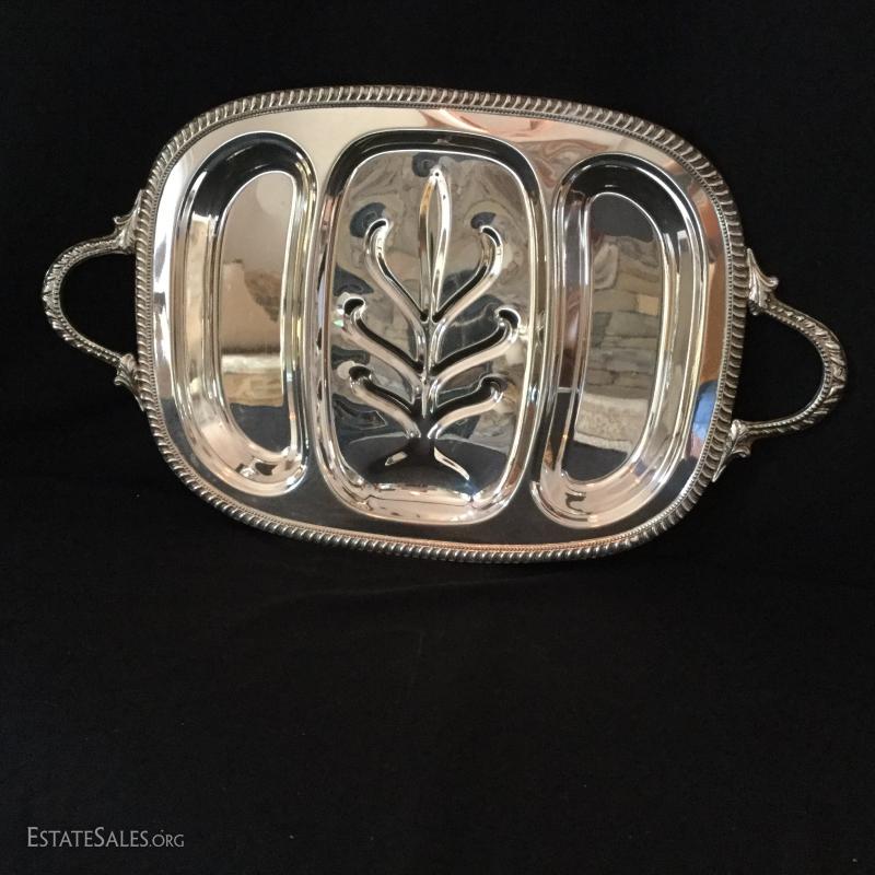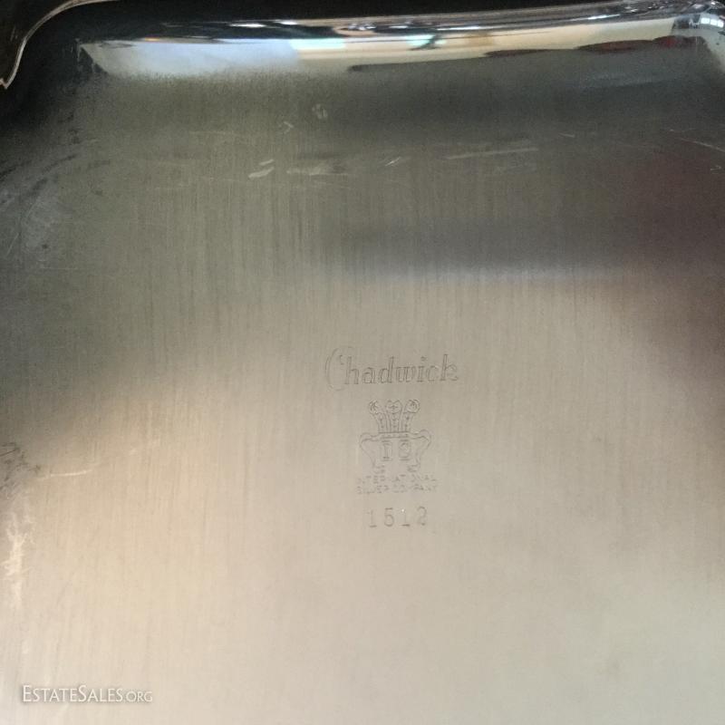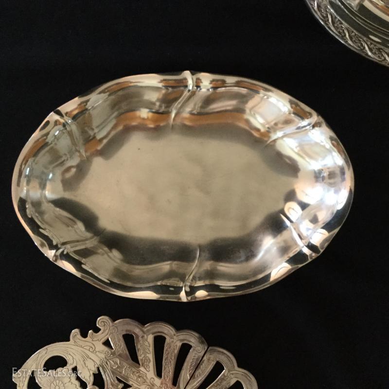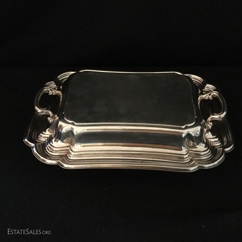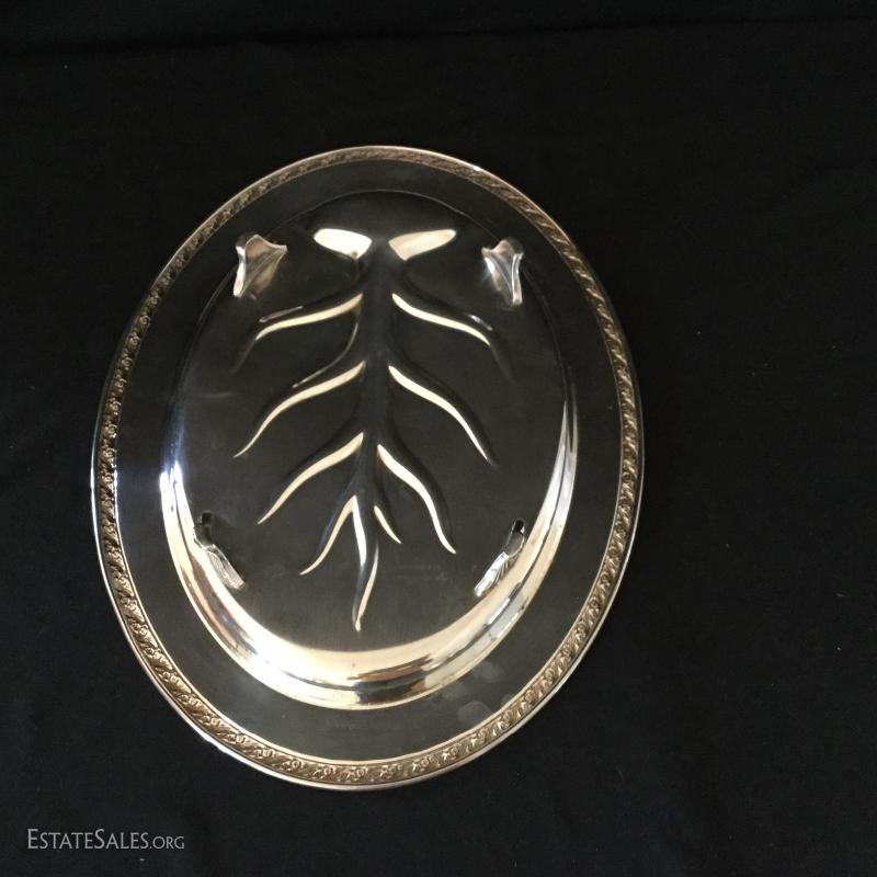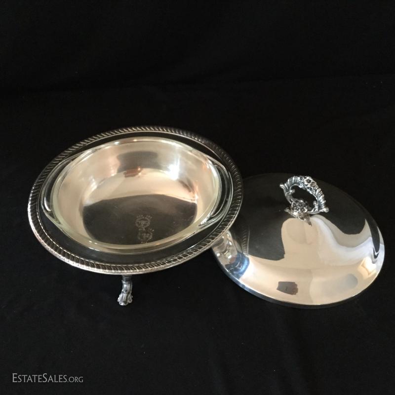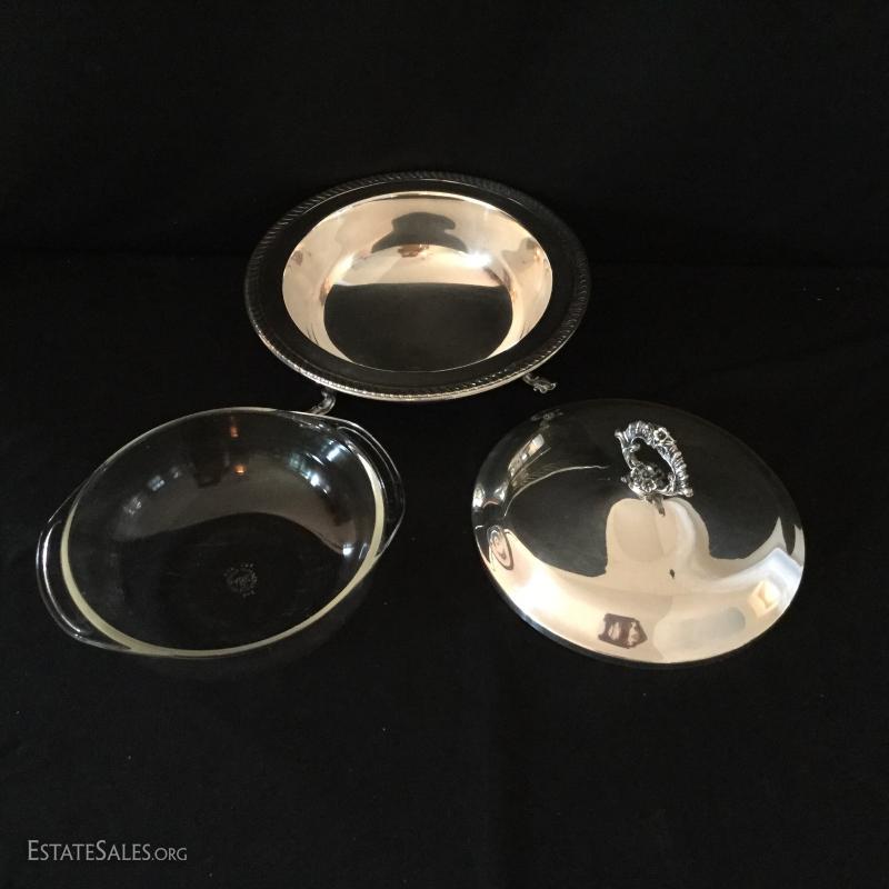 Silver Platters and covered dishes. Largest is 22.5"l x 13.5"w. Expandable silver trivet by Wallace. Chippendale dish. Ikora dish. Carlton baby cup. Rectangular covered dish by Chadwick. F.B. Rogers. Round covered dish with Pyrex glass insert. Four serving spoons.
