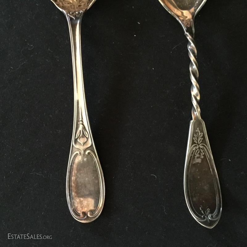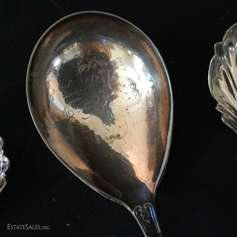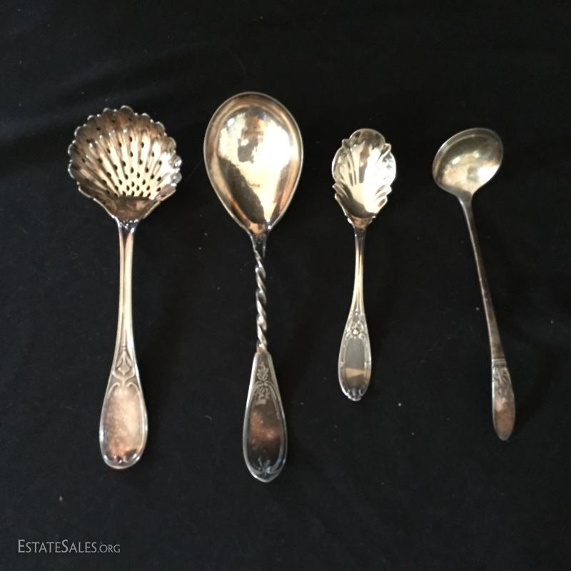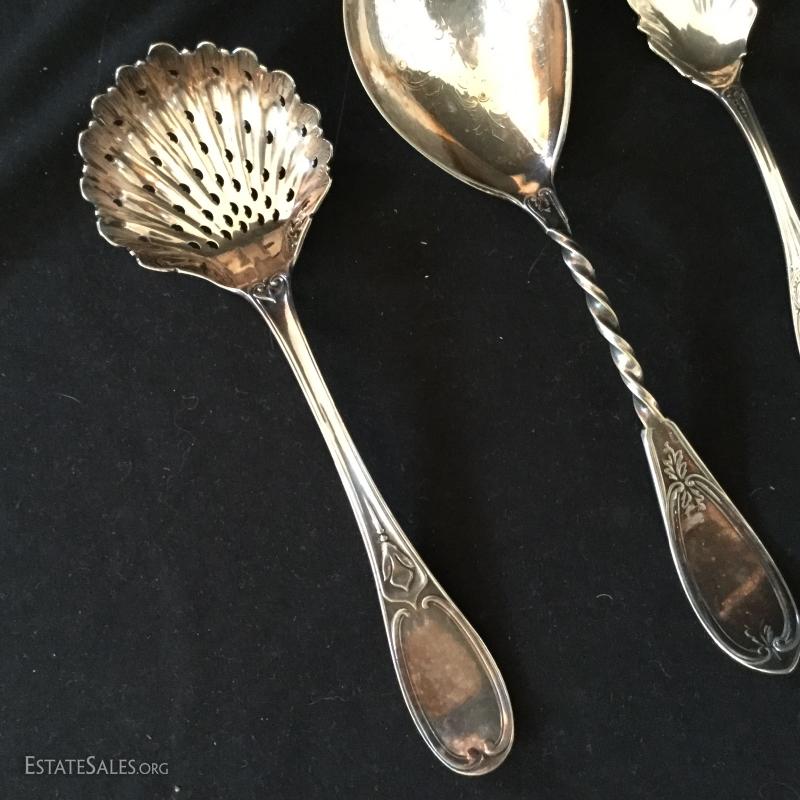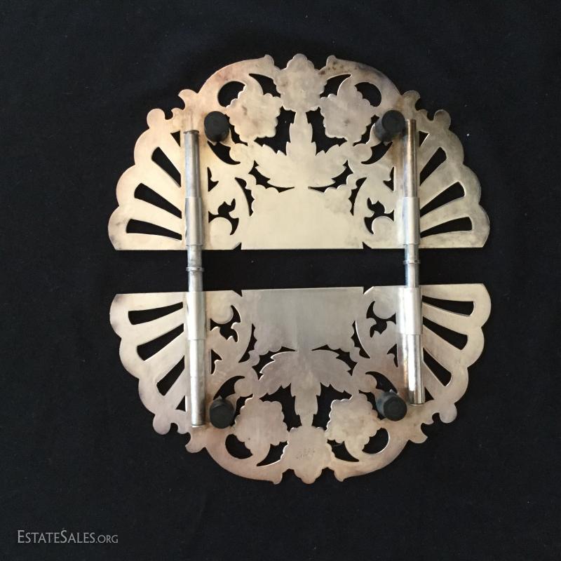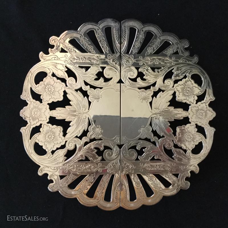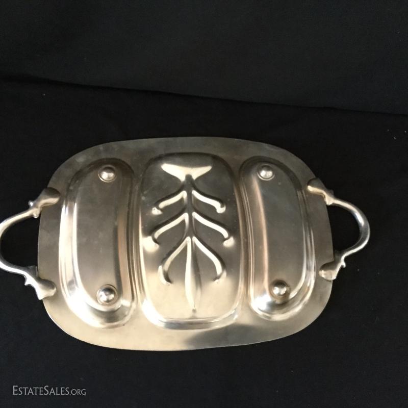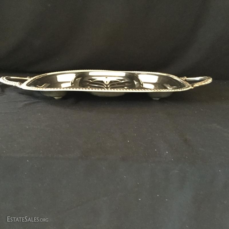 Silver Platters and covered dishes. Largest is 22.5"l x 13.5"w. Expandable silver trivet by Wallace. Chippendale dish. Ikora dish. Carlton baby cup. Rectangular covered dish by Chadwick. F.B. Rogers. Round covered dish with Pyrex glass insert. Four serving spoons.