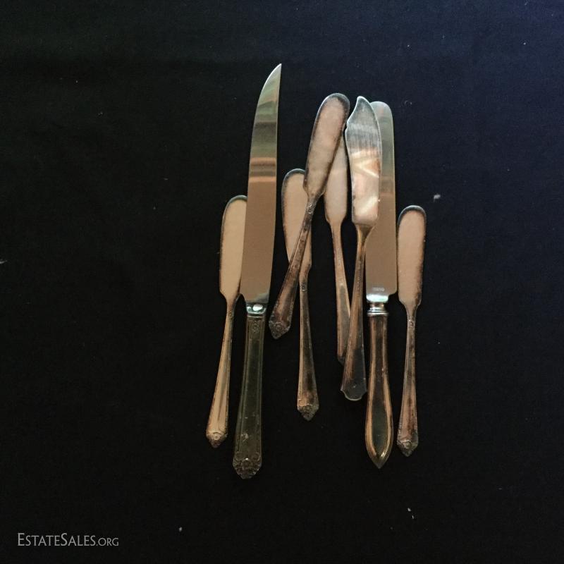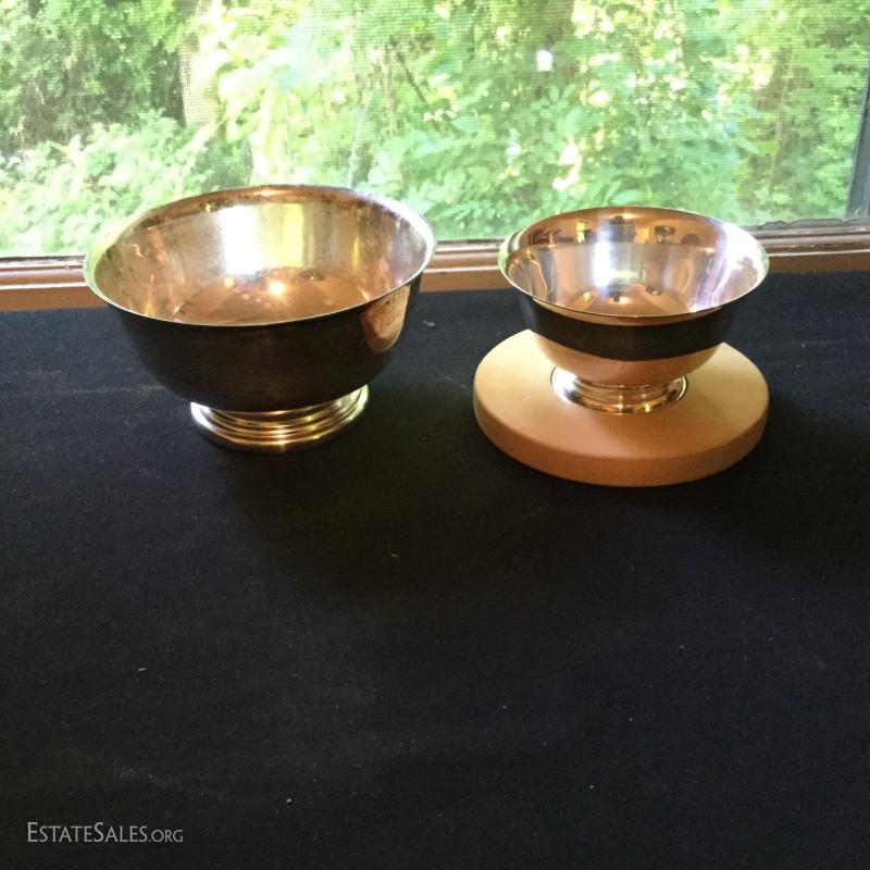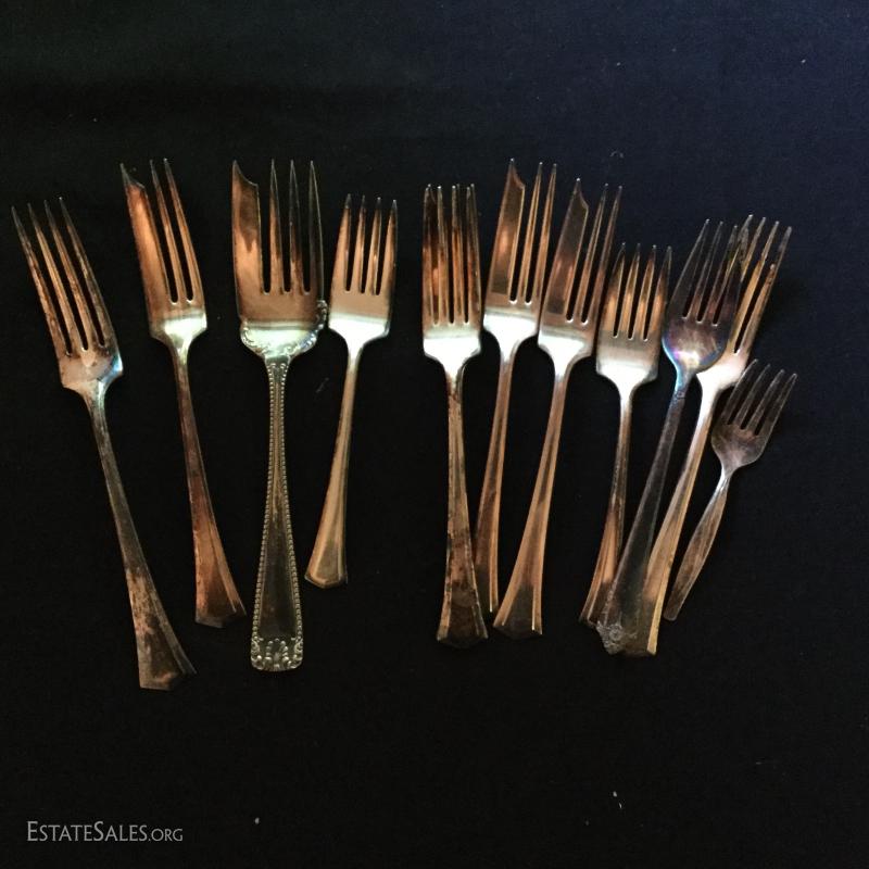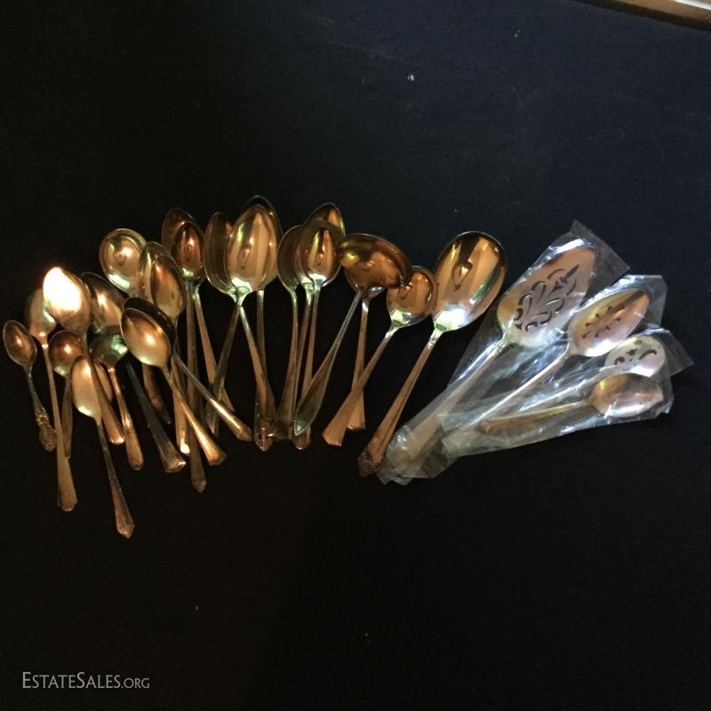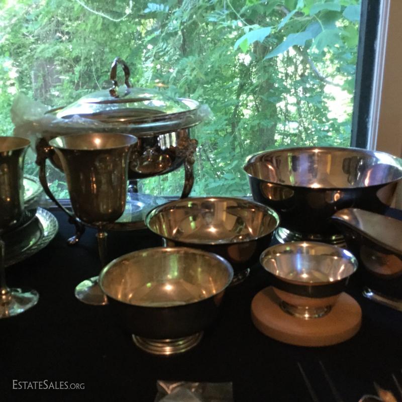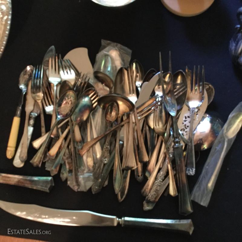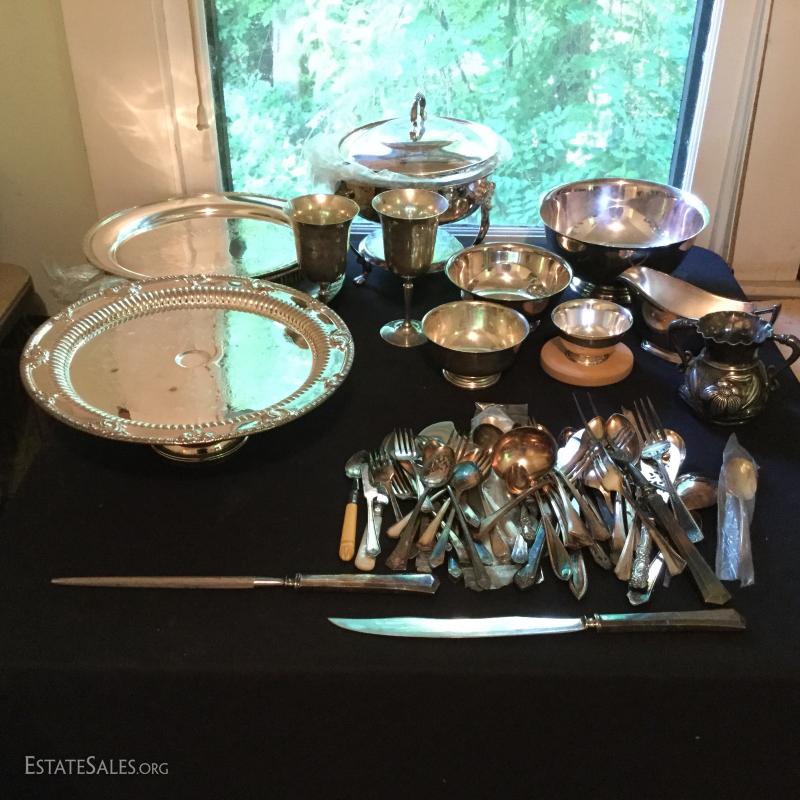 Fabulous Silver Plated Lot. Includes silverware, serving pieces, pitchers, cups, trays, and bowls. Also includes glass salt bowls. See pic for details.
