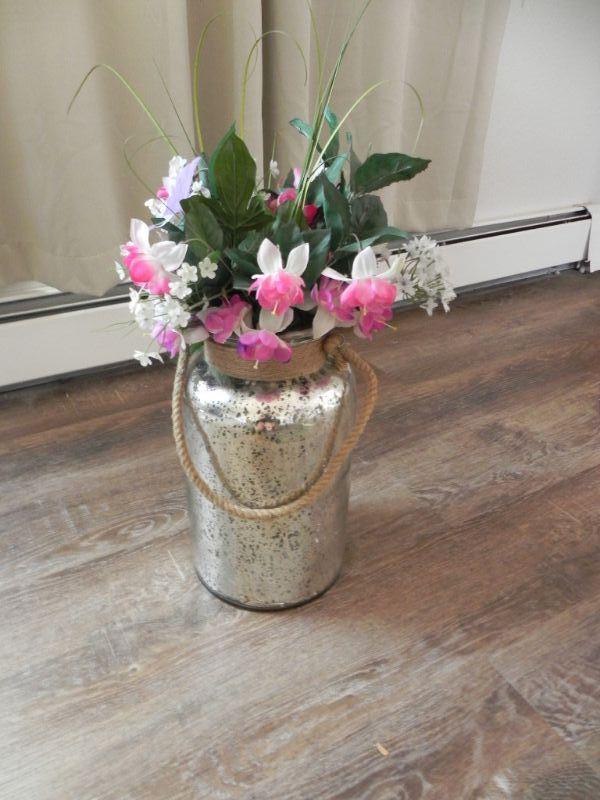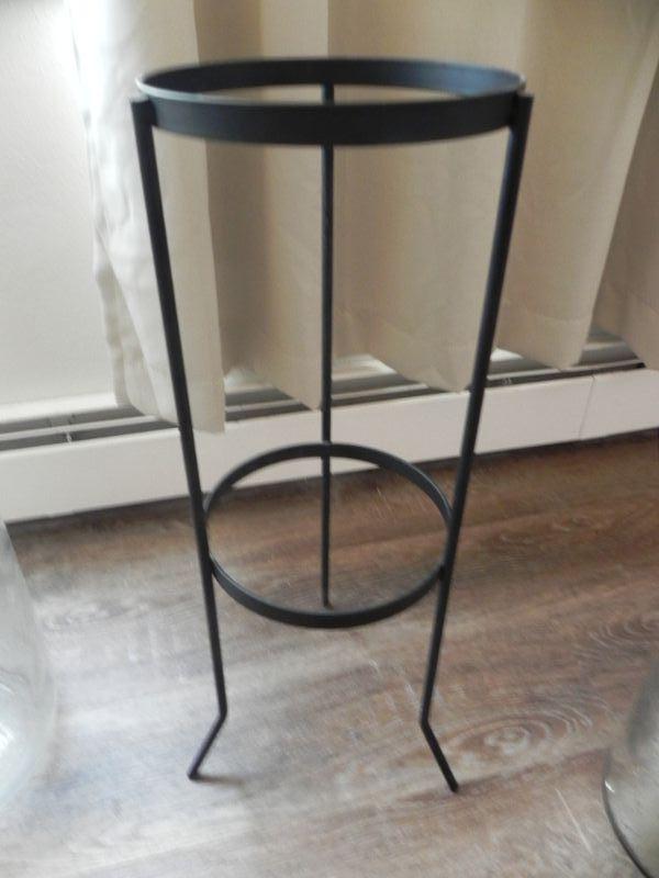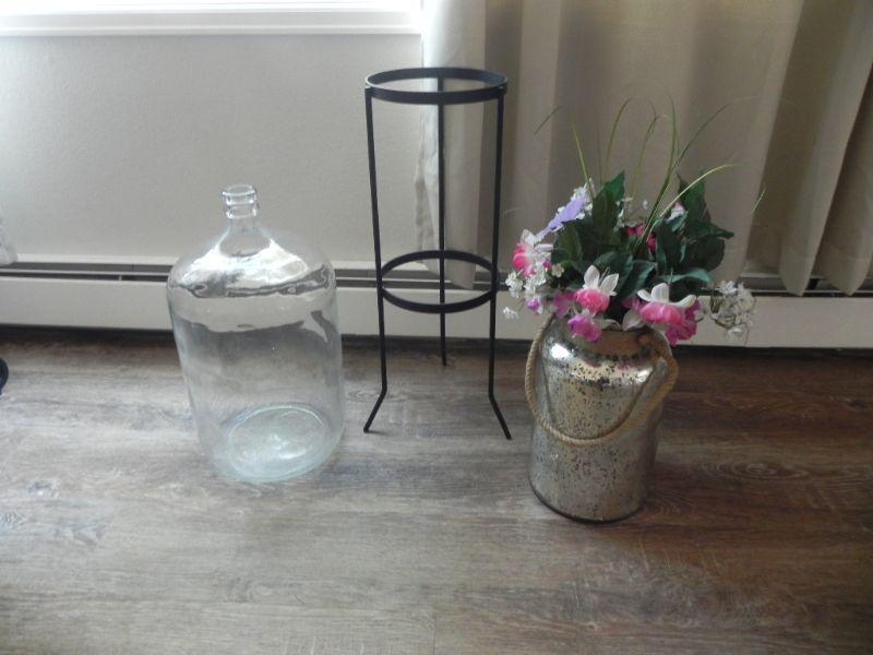 IRON PLANT STAND, GLASS VASE WITH HANDEL AND GLASS BOTTLE WITH "CRISA" ON BOTTOM