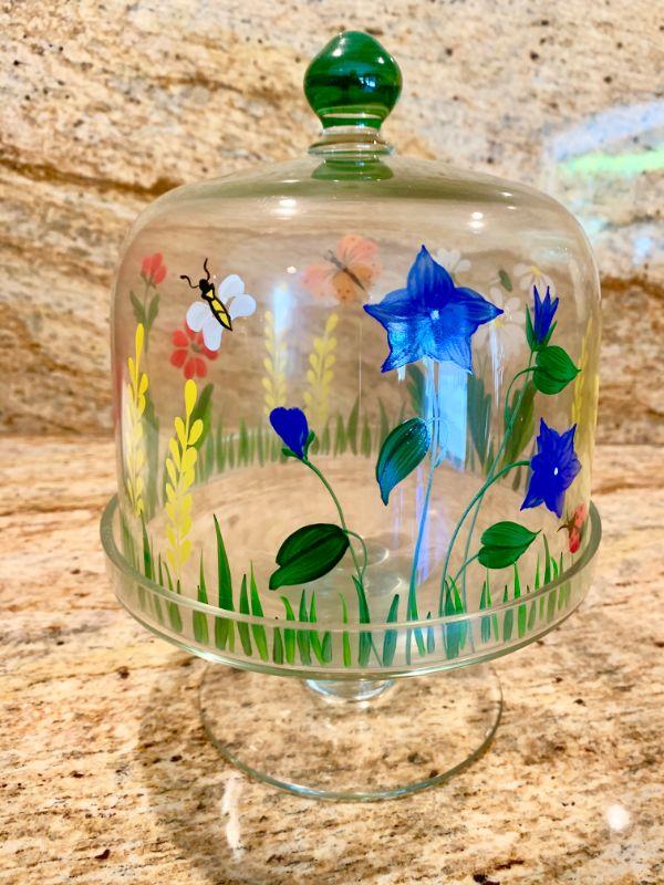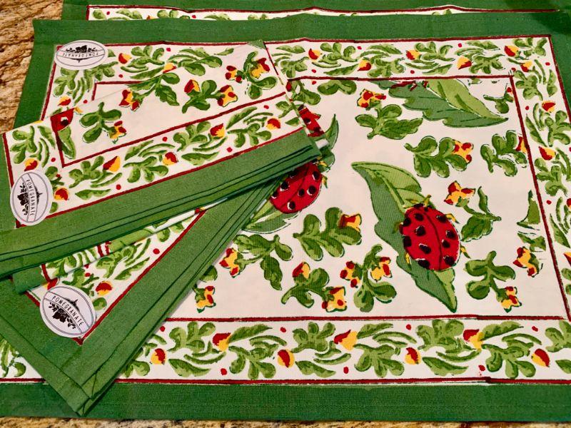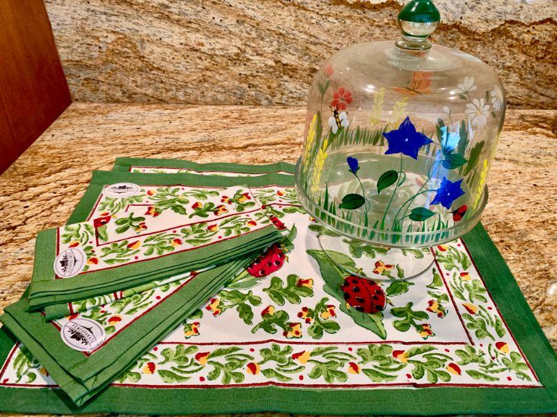 Group of lady bug table linens, 2 placemats & 2 napkins and a lovely hand painted petite covered cake stand.