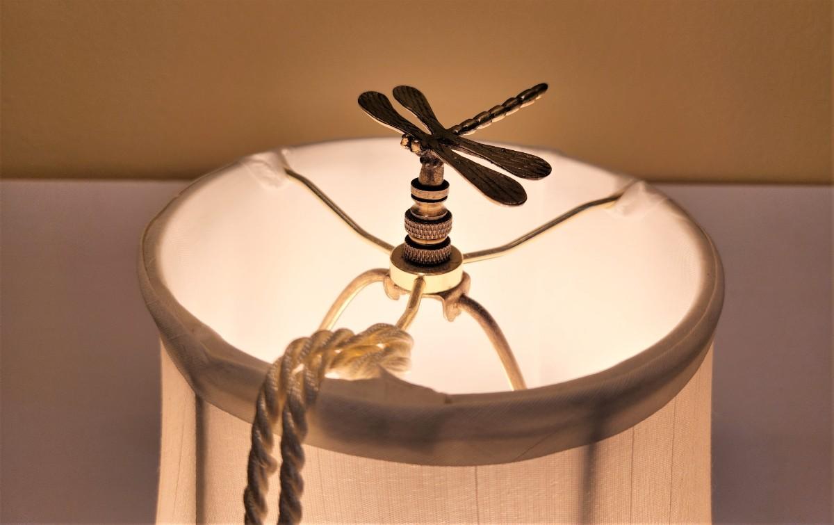 Very pretty, good working condition - vintage table lamp with opalescent green glass base - contemporary dragonfly finial. 24" tall - good vintage condition.