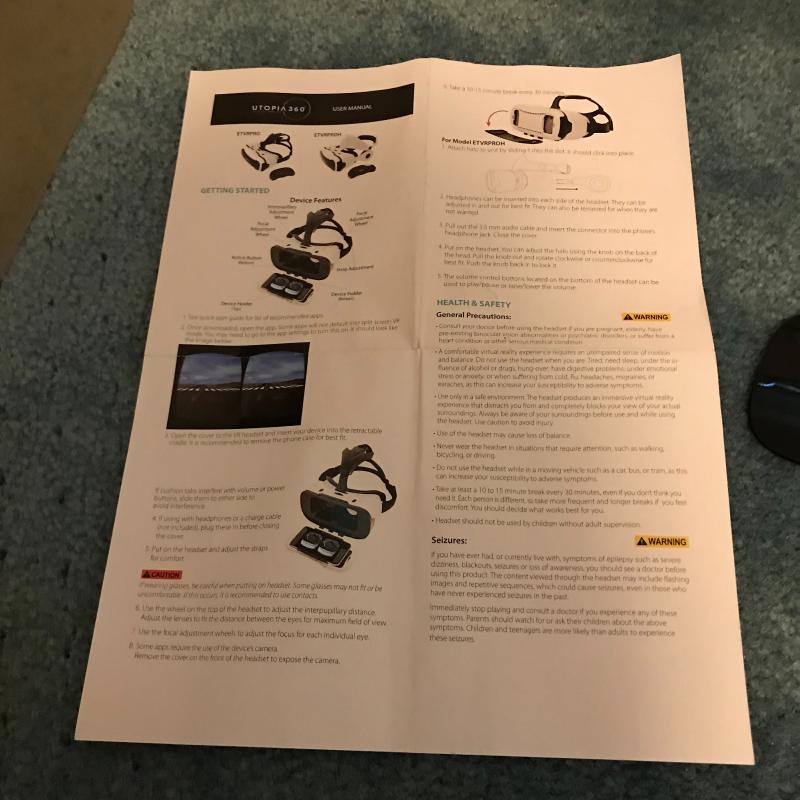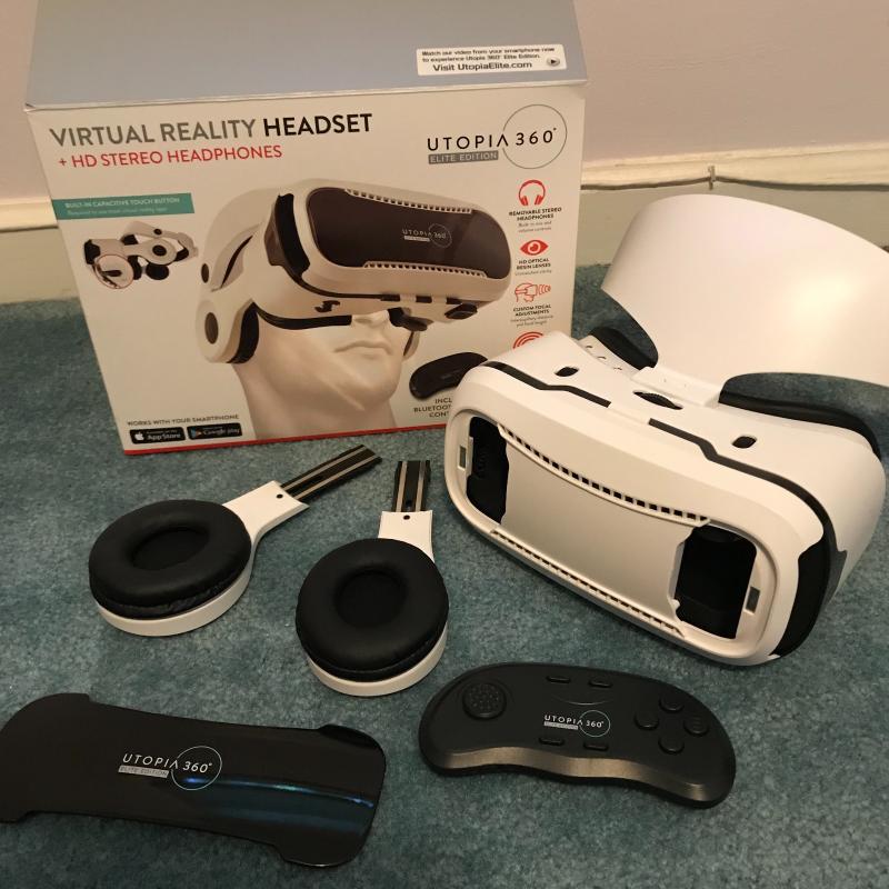 Utopía 360 virtual reality headset. All parts appear to be included but we cannot verify functionality. Box and instructions are included. Like new. Shipping available or local pickup in Arden, NC.