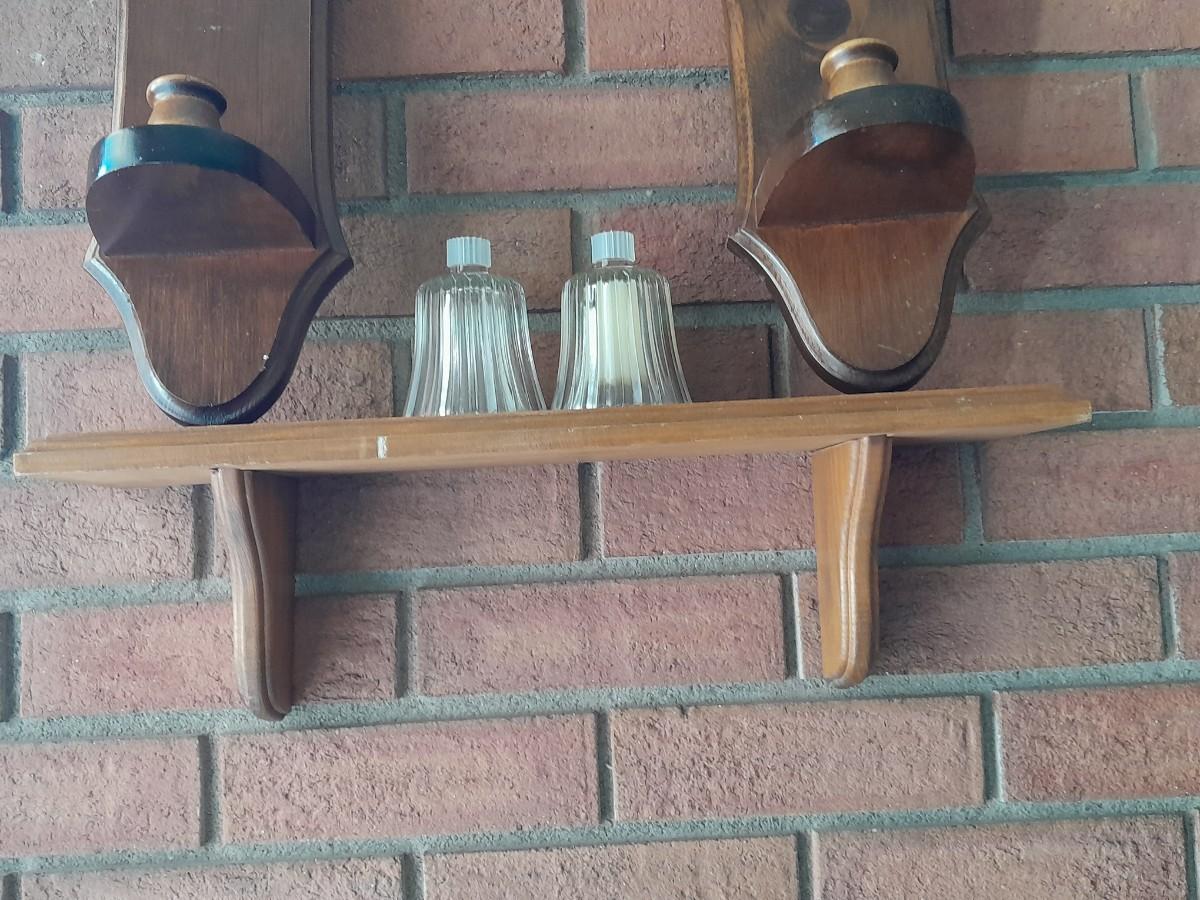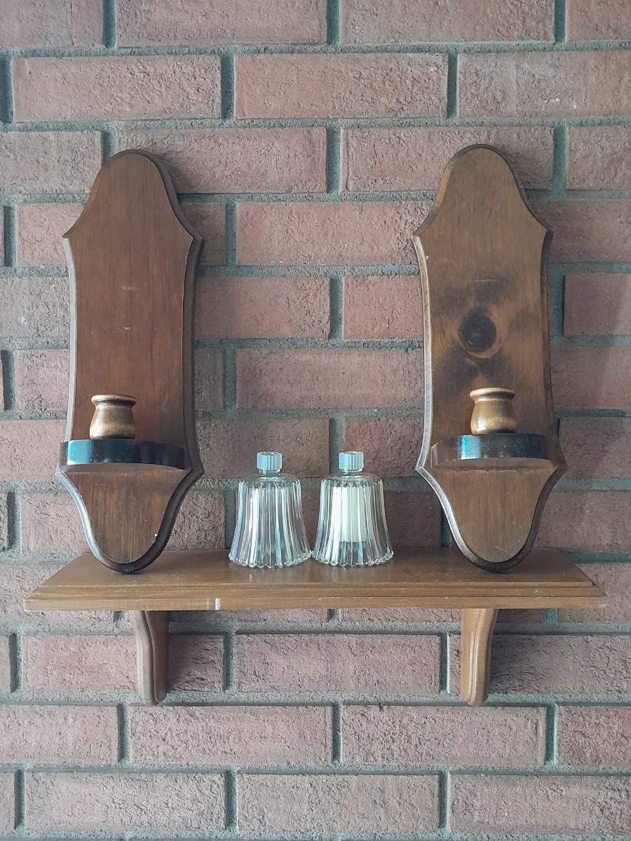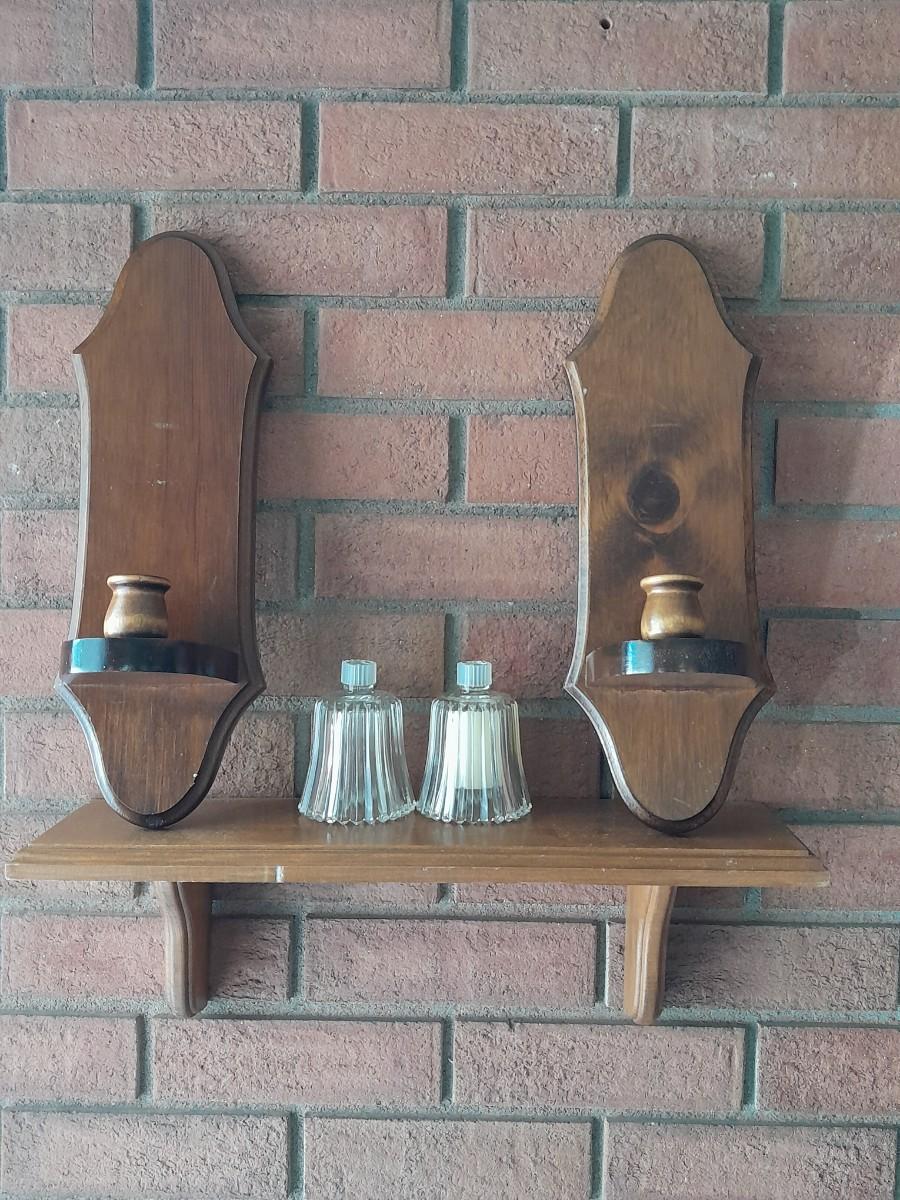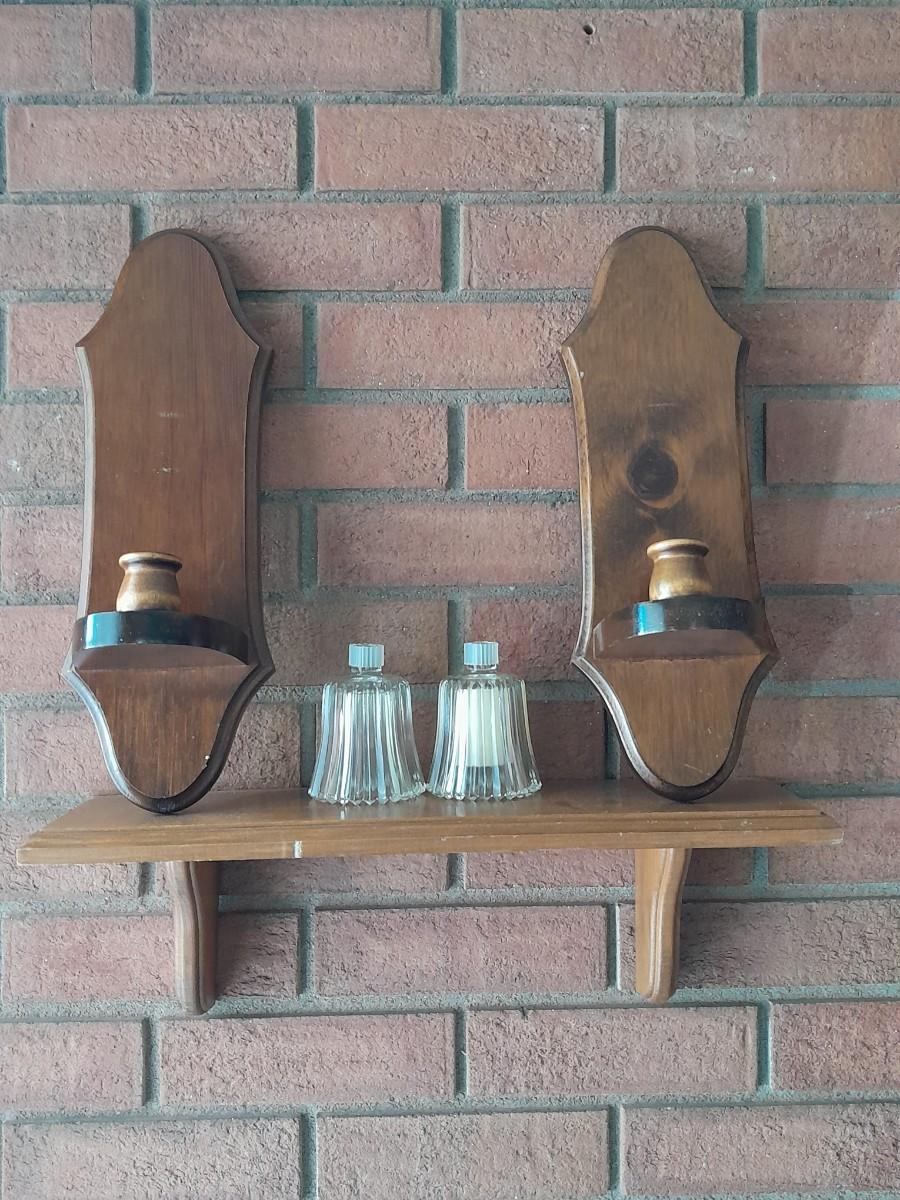 LOT 74 WOODEN SHELF, CANDLE SCONCES AND A VASE WITH TWIGS