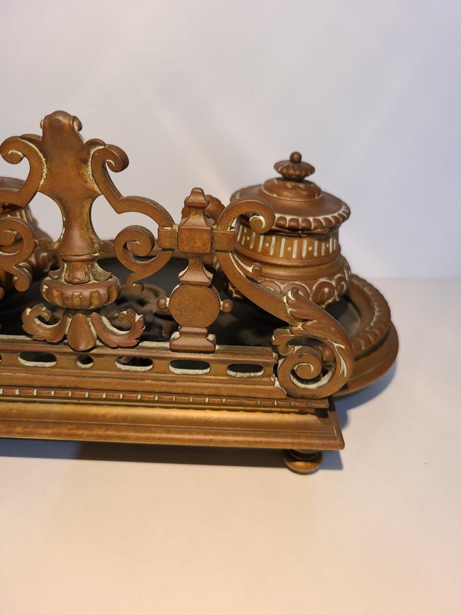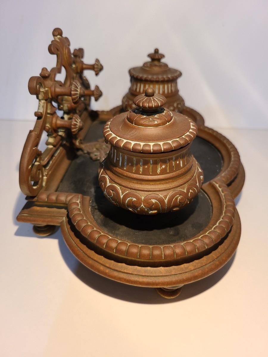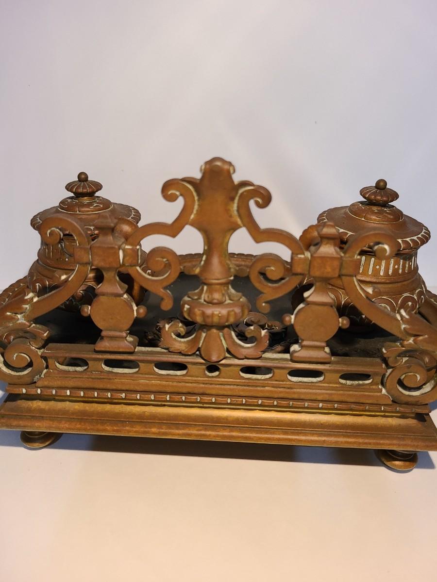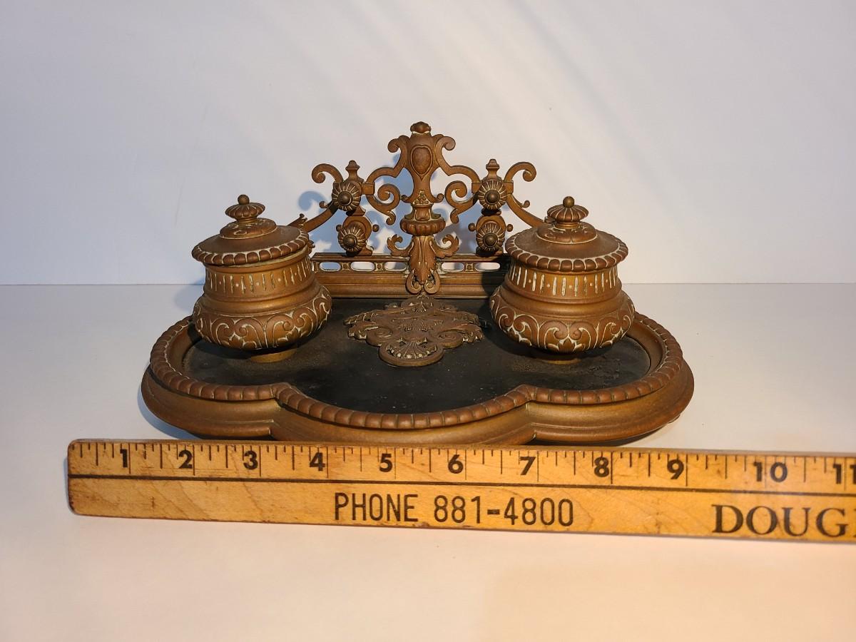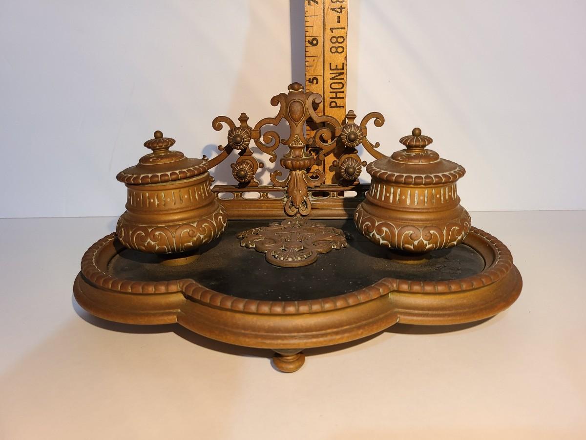 LOT 3: Stunning Antique Brass Double Inkwell, Heavy & Ornate