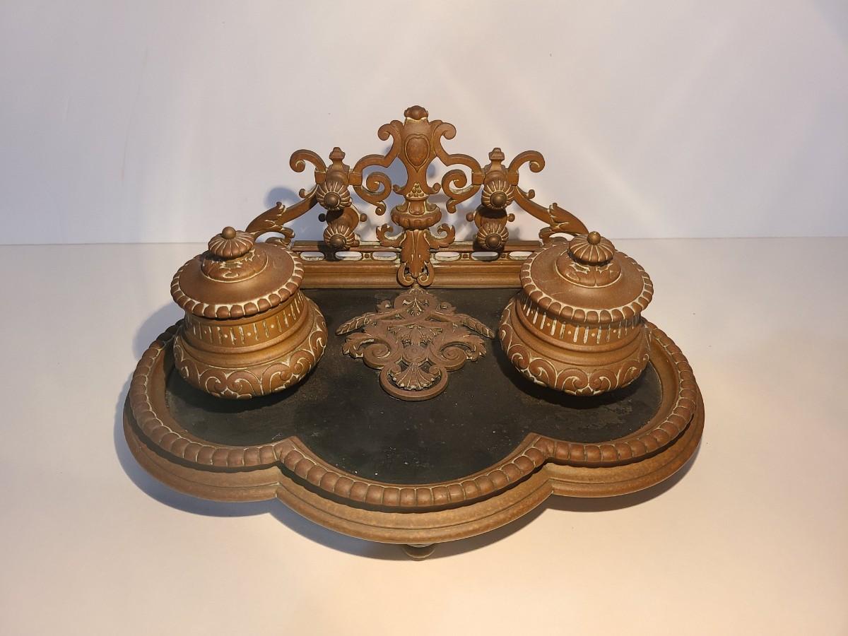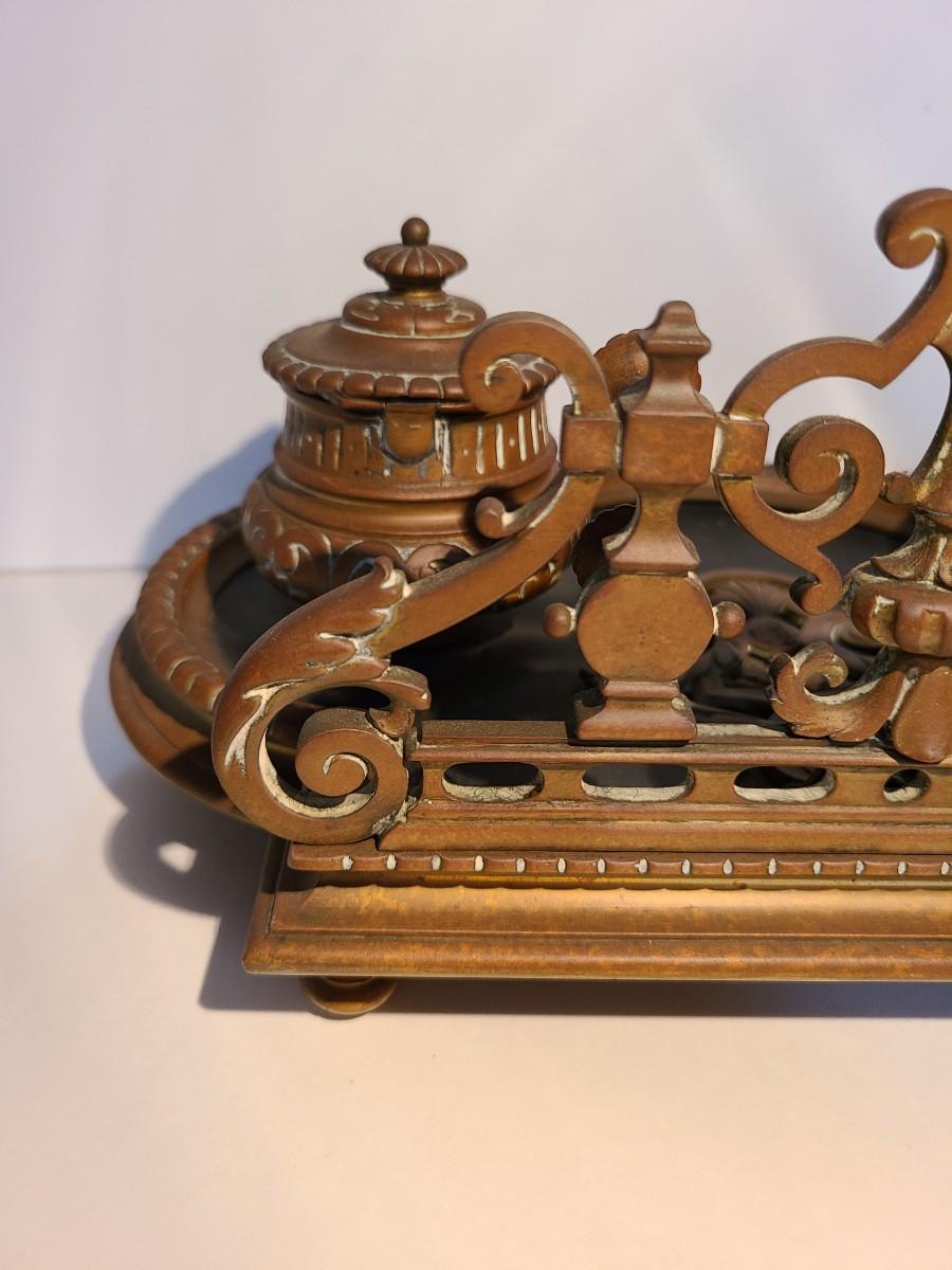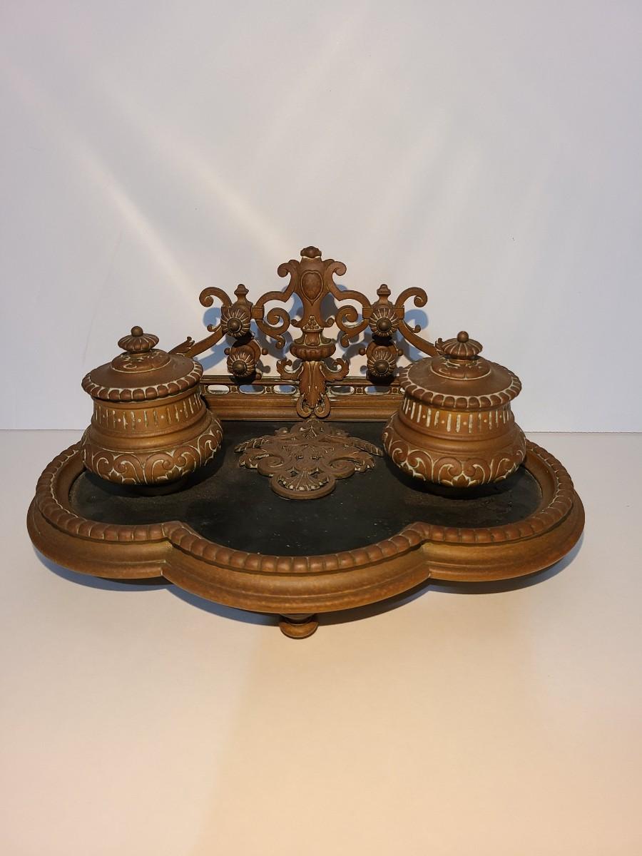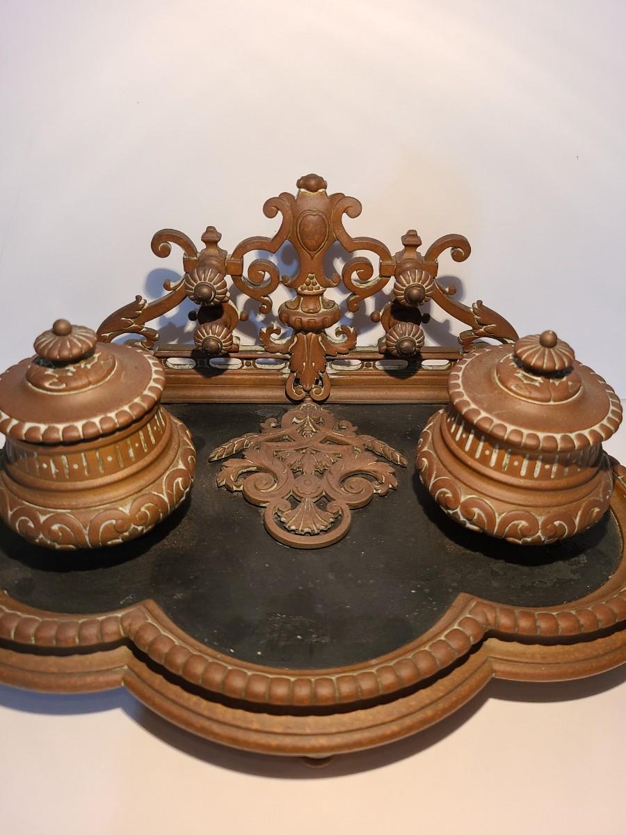 LOT 3: Stunning Antique Brass Double Inkwell, Heavy & Ornate