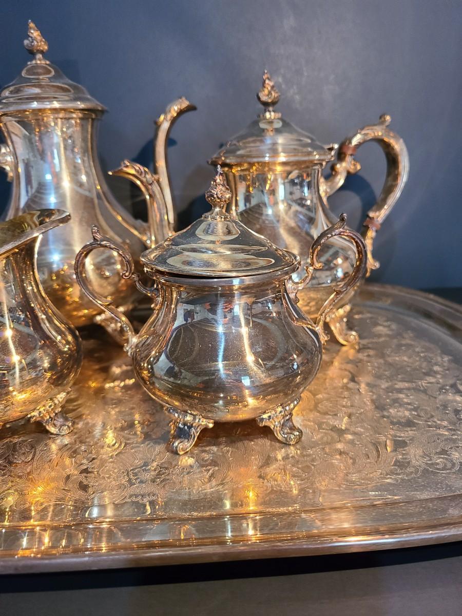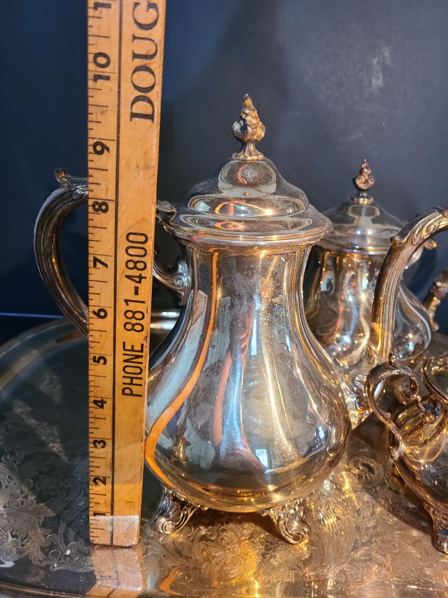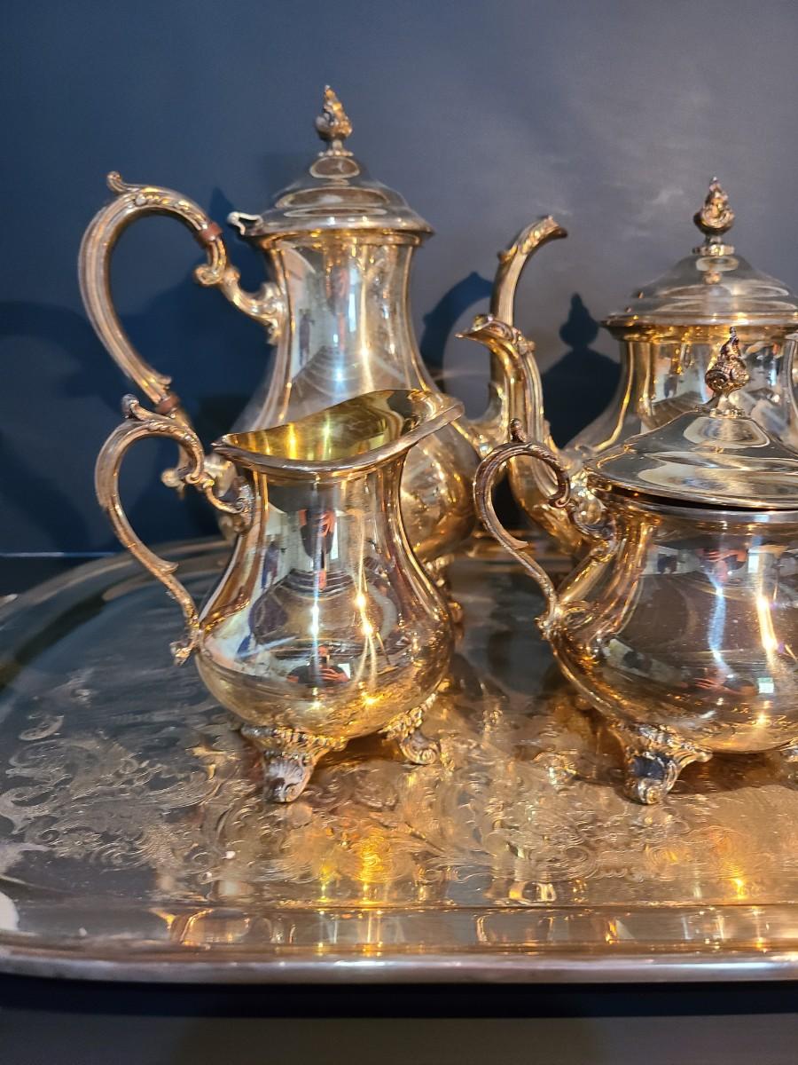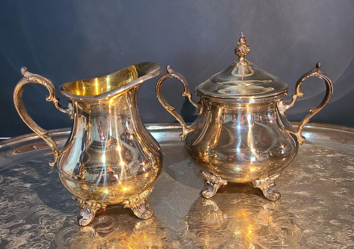 Lovely set. Solid in design. Needs to be cleaned. The interior of the creamer has a gold tone. Please see all pictures as they are the best representation of the items. The pictures show condition, measurements if taken, and what is included in the lot. Due to the large amount that we photograph and the time frame, we are not always able to take measurements. All items unless noted, are pre-owned and have been used. If you purchased furniture, you must bring help. We do not allow one person to carry large furniture out on their own. Bring help, tools and a truck for the safety of our client’s homes, and your personal safety. Any damages that result to the property including walls, and floors due to moving of the furniture will be charged to the buyer. Company policy. Thank you.