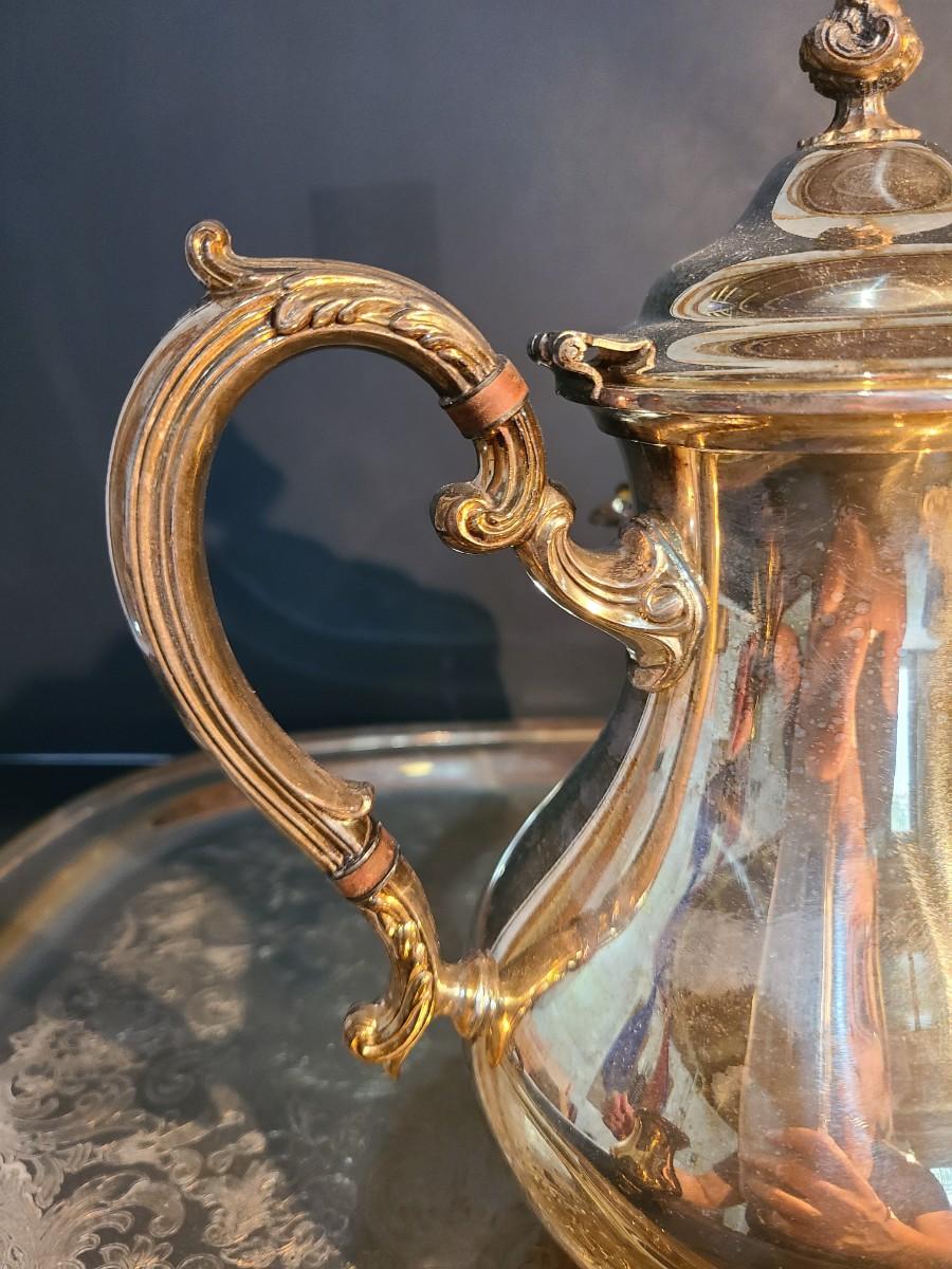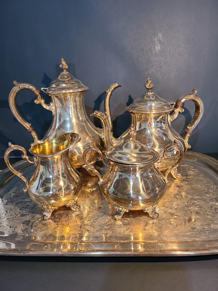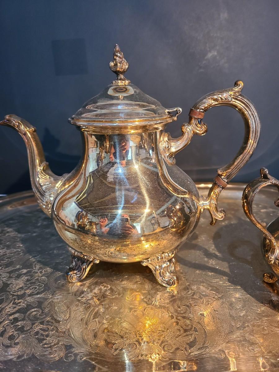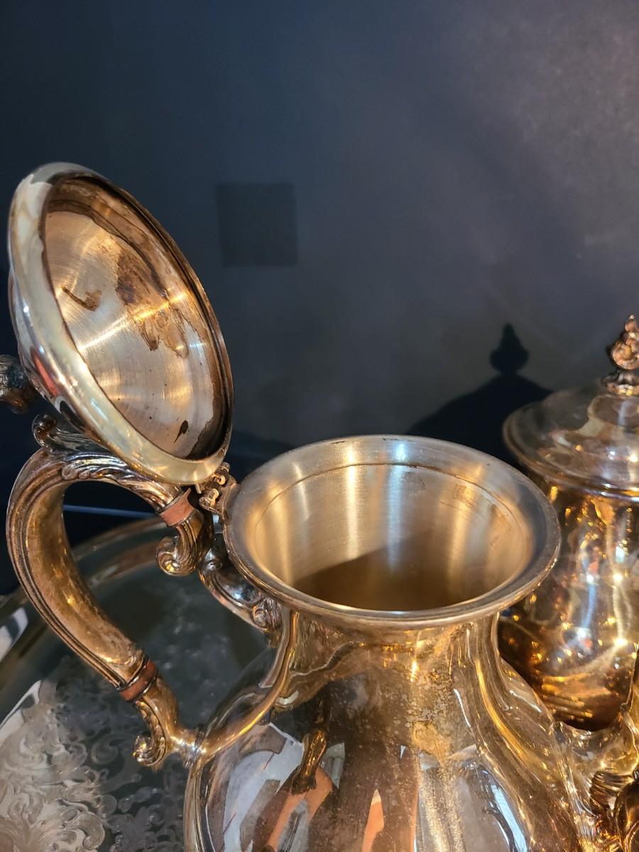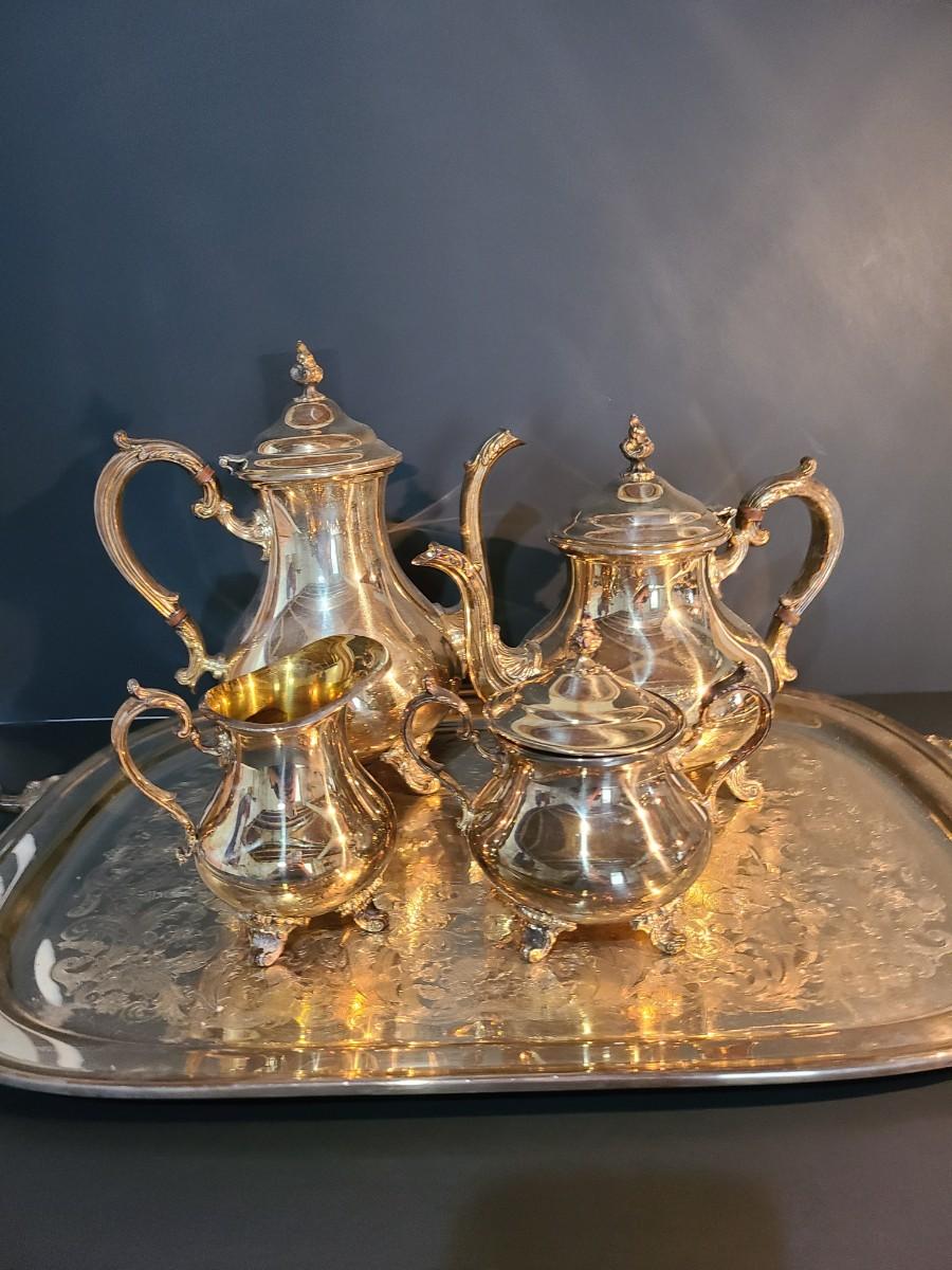 Lovely set. Solid in design. Needs to be cleaned. The interior of the creamer has a gold tone. Please see all pictures as they are the best representation of the items. The pictures show condition, measurements if taken, and what is included in the lot. Due to the large amount that we photograph and the time frame, we are not always able to take measurements. All items unless noted, are pre-owned and have been used. If you purchased furniture, you must bring help. We do not allow one person to carry large furniture out on their own. Bring help, tools and a truck for the safety of our client’s homes, and your personal safety. Any damages that result to the property including walls, and floors due to moving of the furniture will be charged to the buyer. Company policy. Thank you.