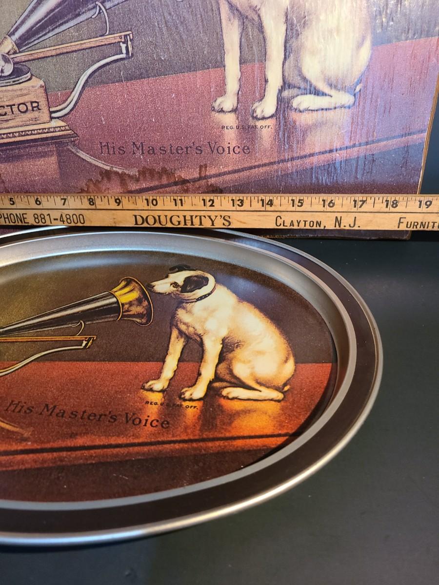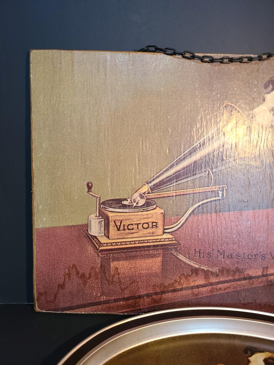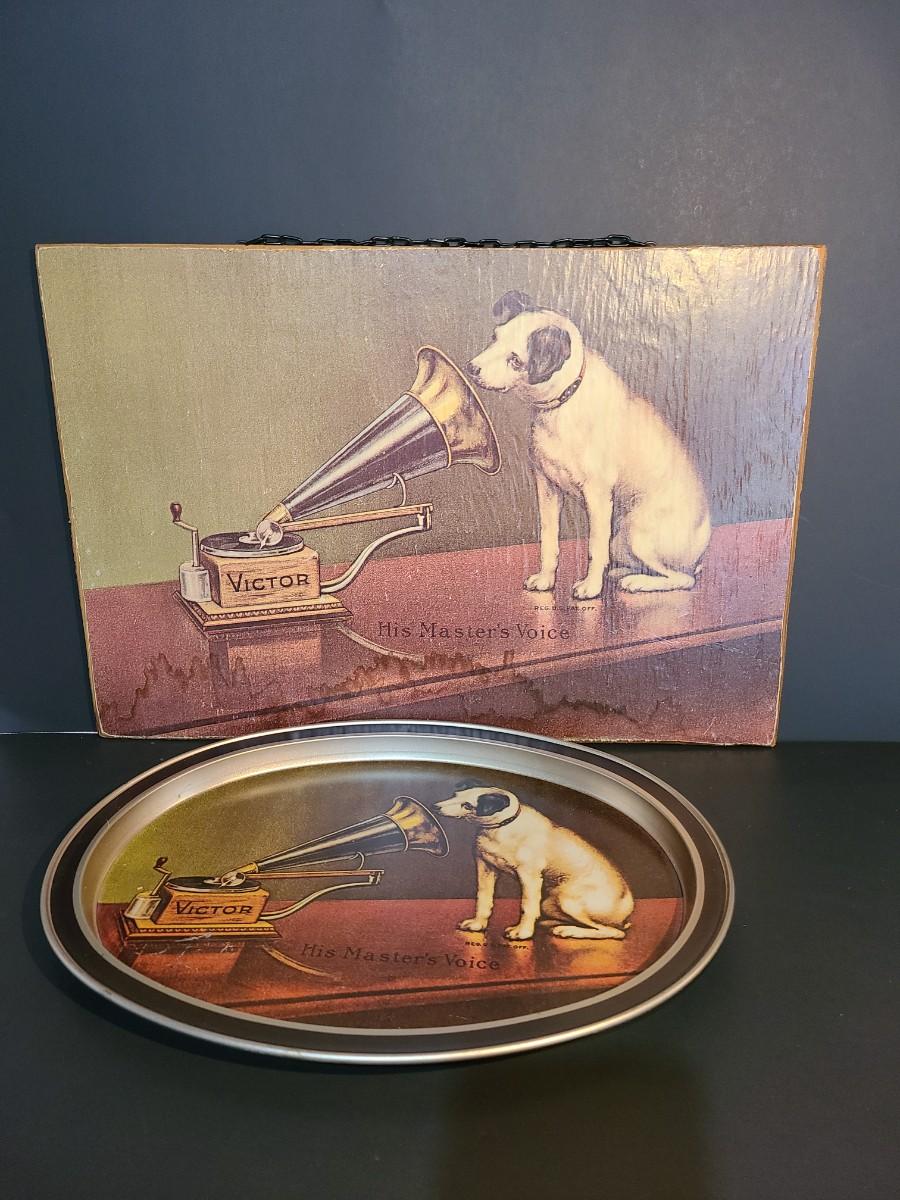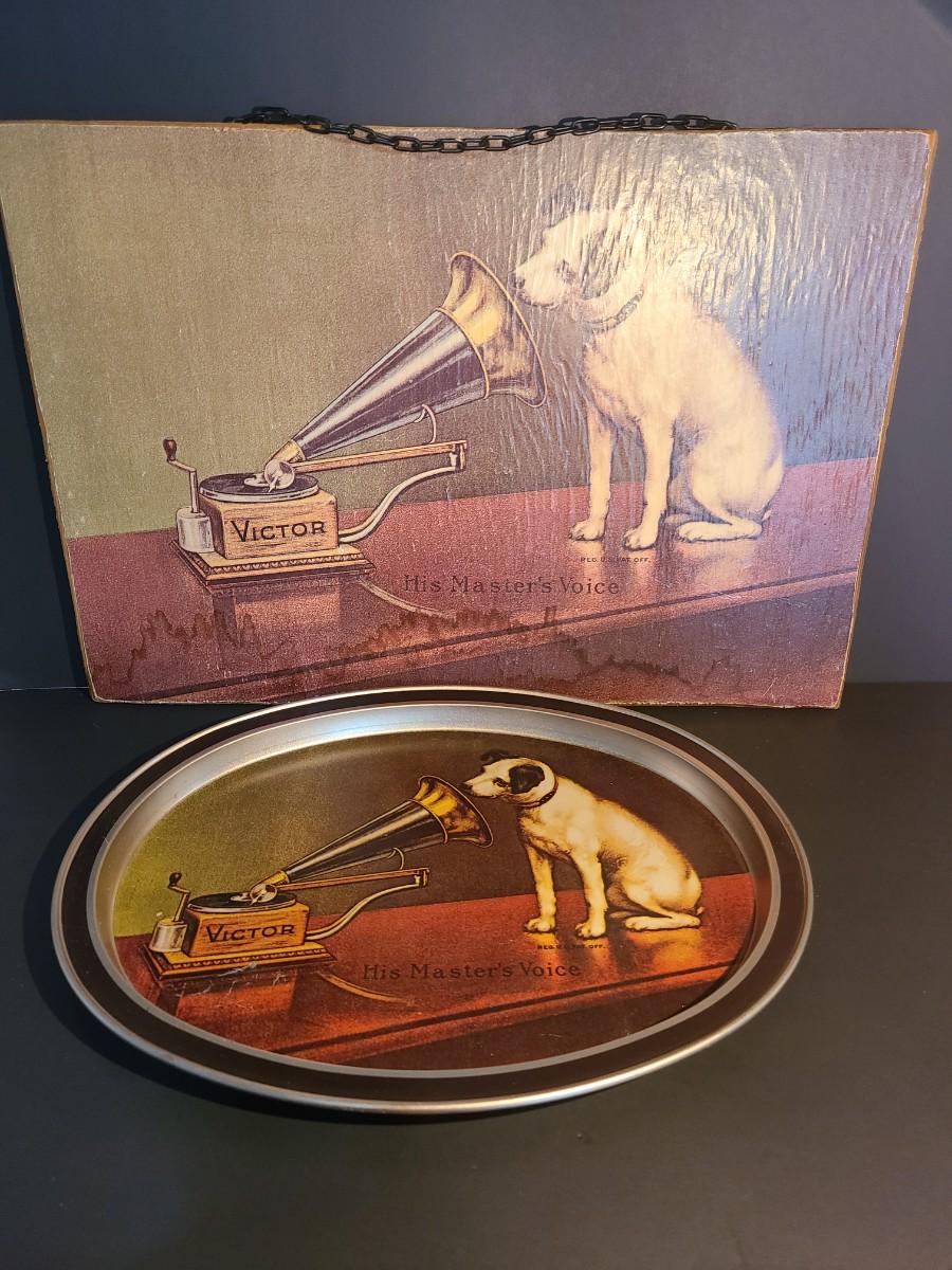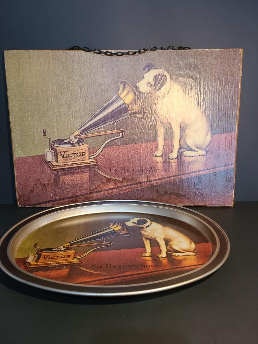 LOT 7: RCA Vintage Wood Sign and Metal Tray