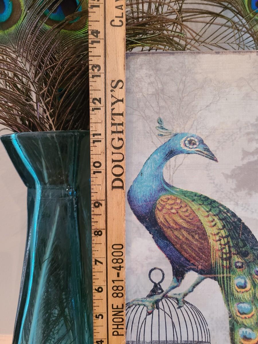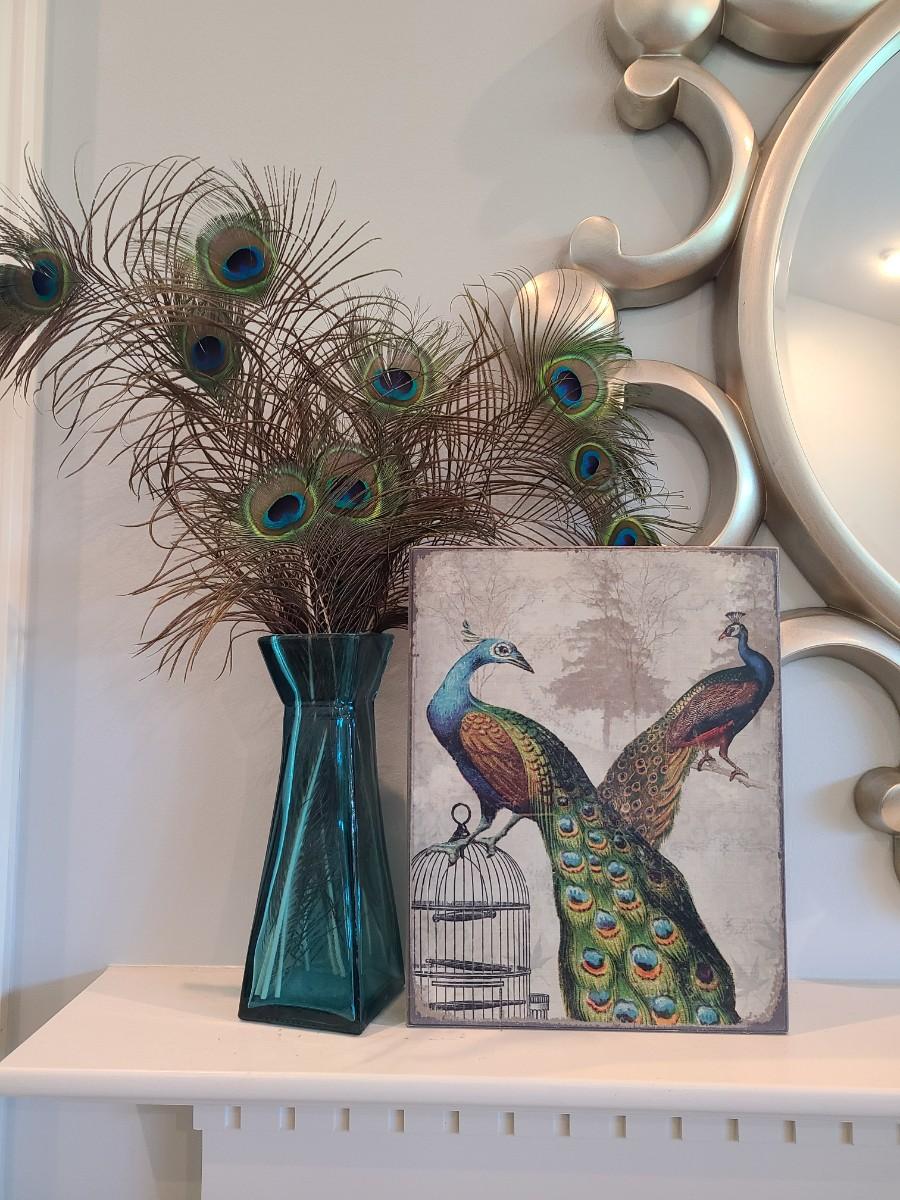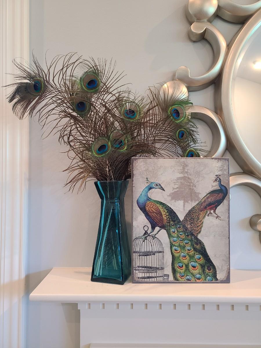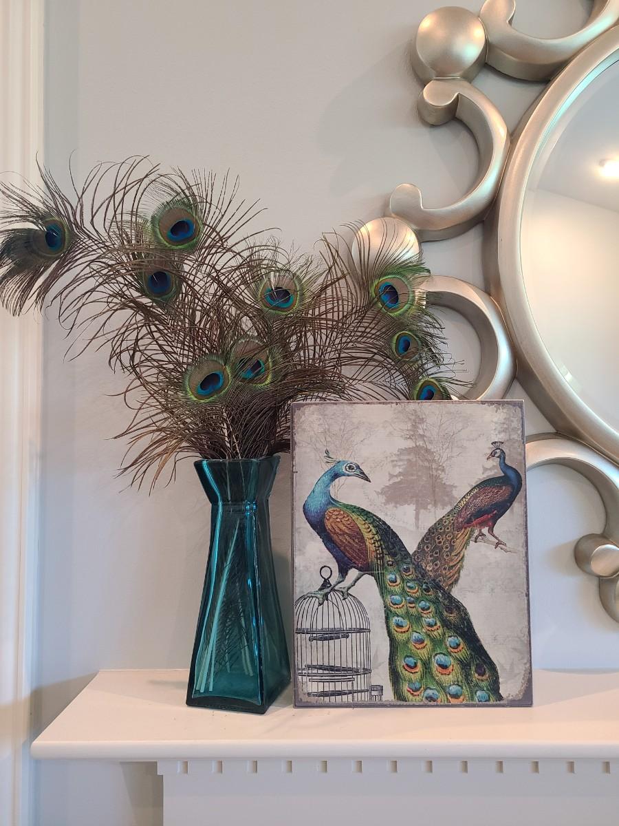 LOT 30: Peacock Home Decor: Reproduction Vintage Print and Vase/Feathers