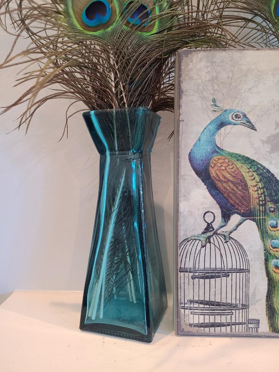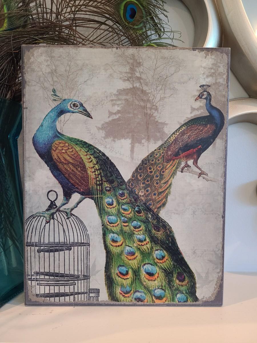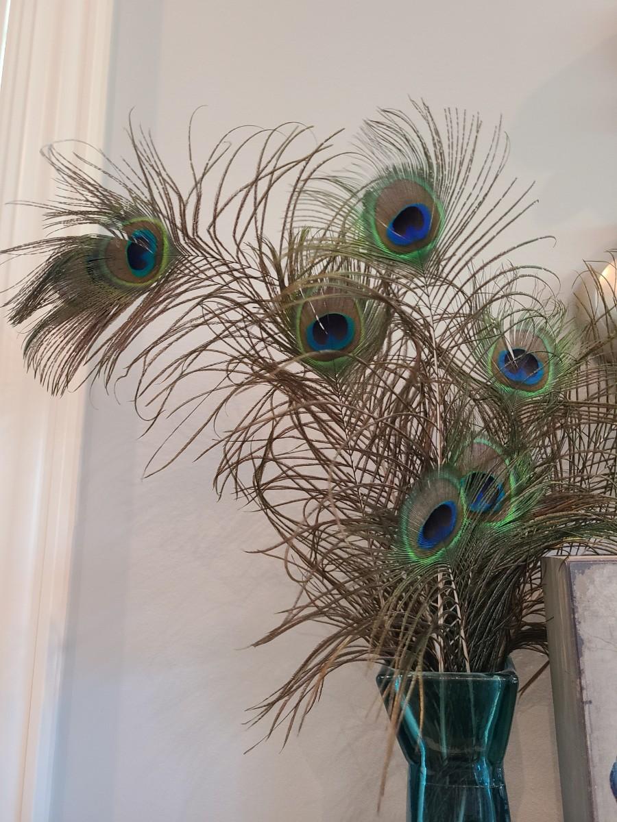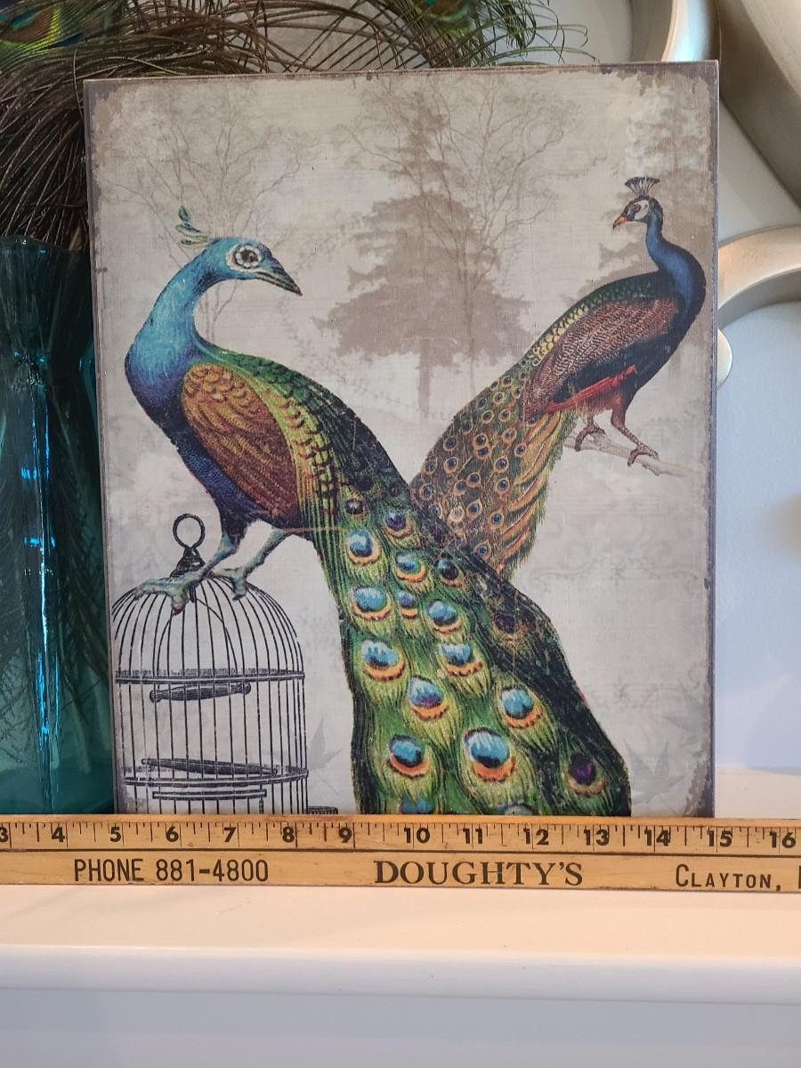 LOT 30: Peacock Home Decor: Reproduction Vintage Print and Vase/Feathers