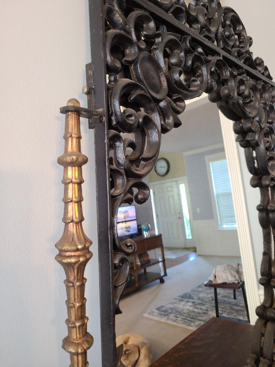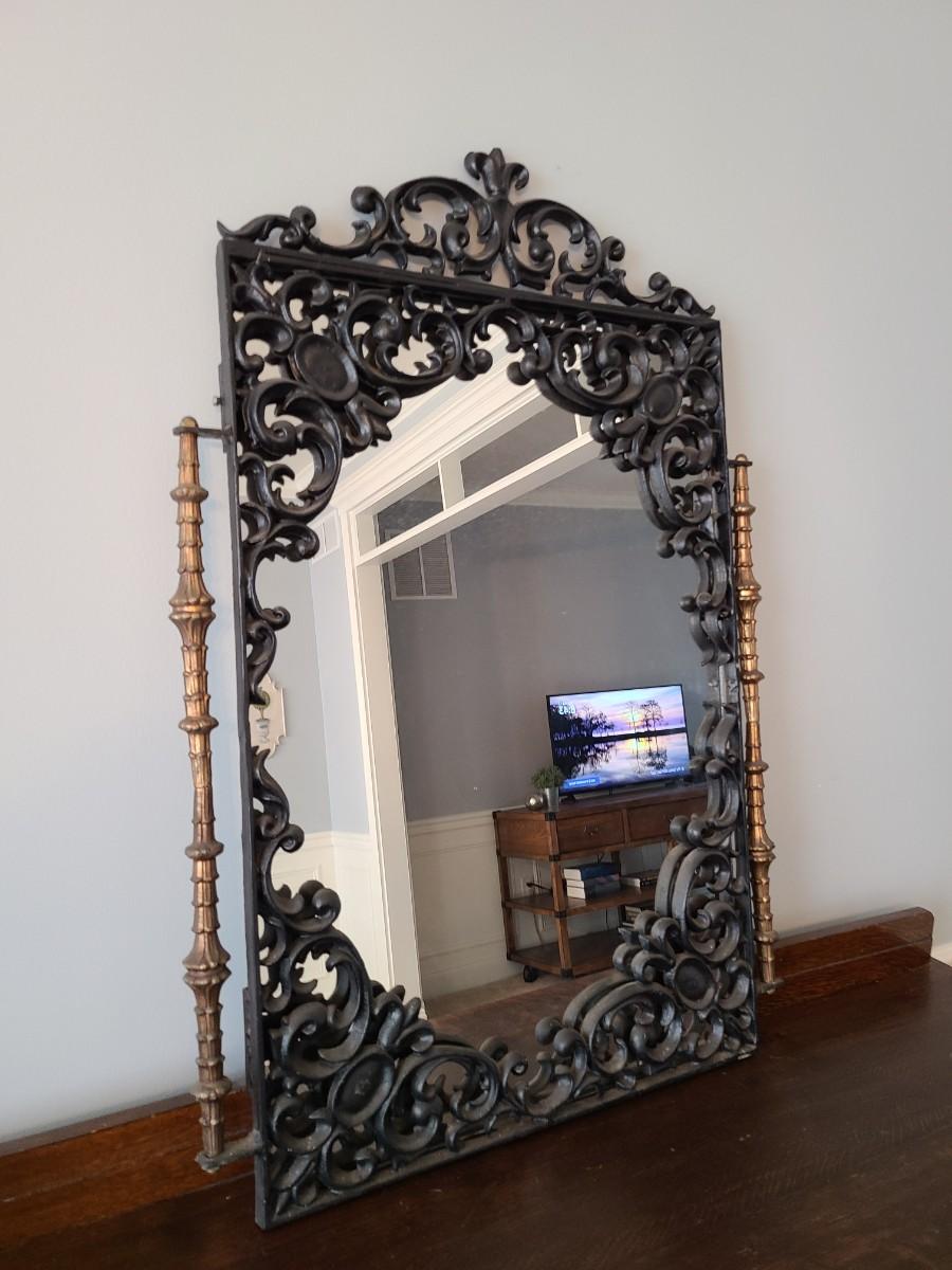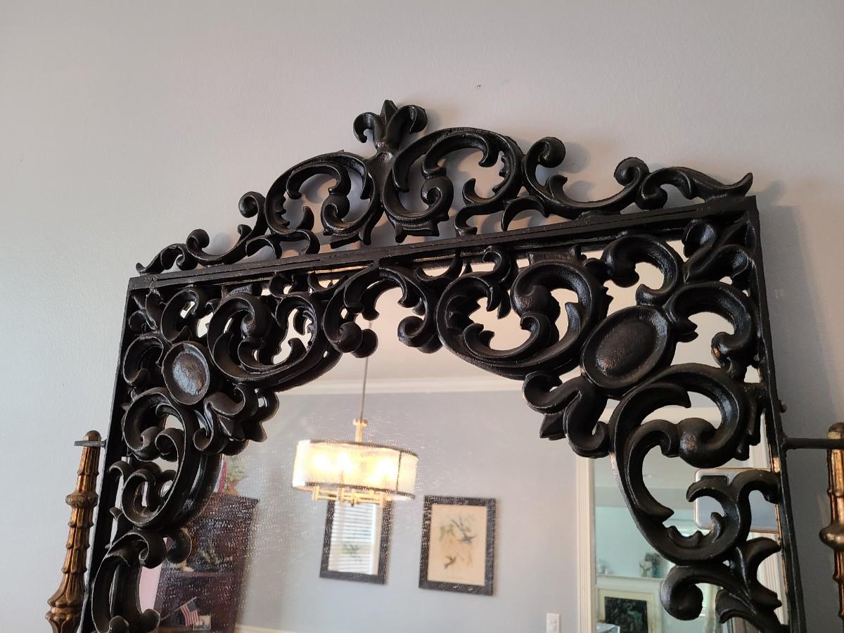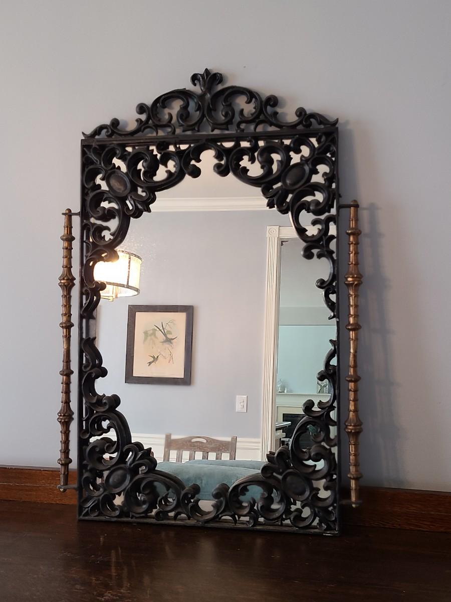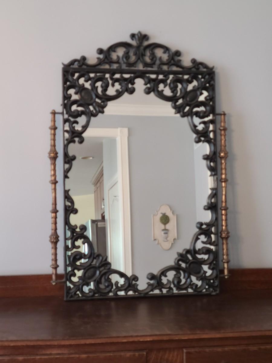 This is a vey unique piece! Can hang on wall or sit on piece. Perfect for any room in the house. This is very heavy! The mirror just slides in and can be replaced for newer one. It is just rectangle not round. Also, you can remove and use alibe. Mirror showing aging and small chips at edges. Please see all pictures as they are the best representation of the items. The pictures show condition, measurements if taken, and what is included in the lot. Due to the large amount that we photograph and the time frame, we are not always able to take measurements. All items unless noted, are pre-owned and have been used. If you purchased furniture, you must bring help. We do not allow one person to carry large furniture out on their own. Bring help, tools and a truck for the safety of our client’s homes, and your personal safety. Any damages that result to the property including walls, and floors due to moving of the furniture will be charged to the buyer. Company policy. Thank you.