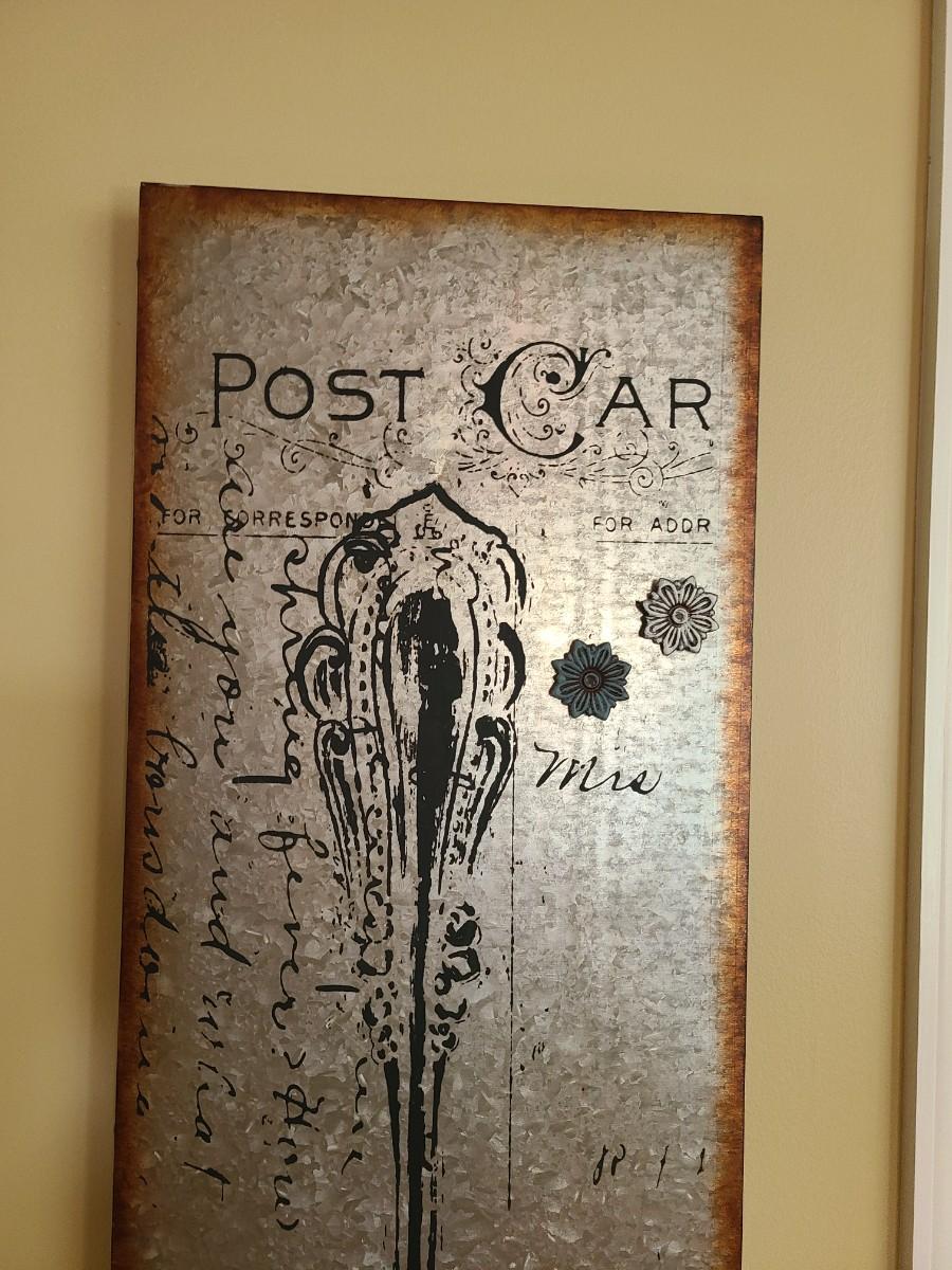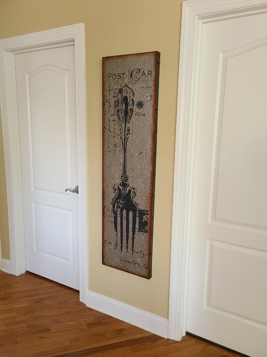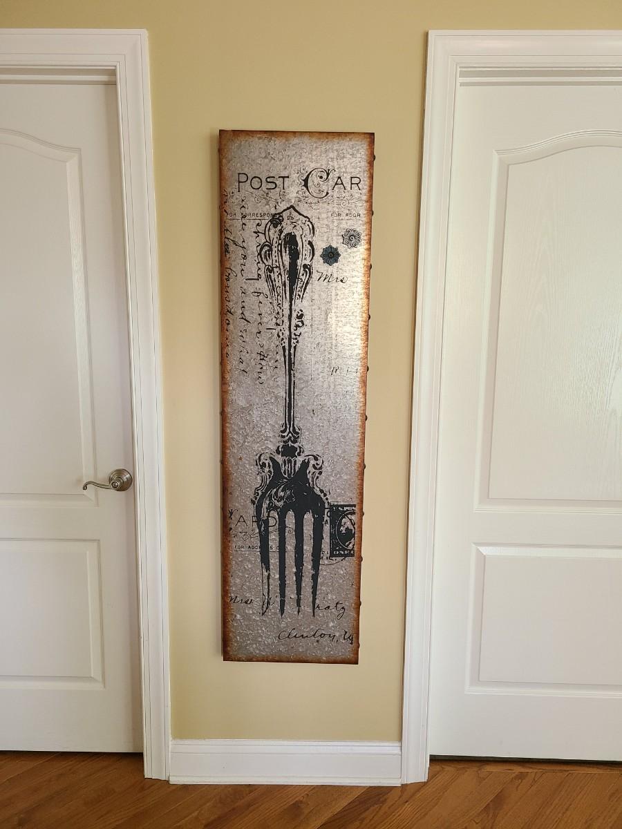 58x16 inches. Large Metal Fork W/French Script Wall Sign Art. Please see all pictures as they are the best representation of the items. The pictures show condition, measurements if taken, and what is included in the lot. Due to the large amount that we photograph and the time frame, we are not always able to take measurements. All items unless noted, are pre-owned and have been used. If you purchased furniture, you must bring help. We do not allow one person to carry large furniture out on their own. Bring help, tools and a truck for the safety of our client’s homes, and your personal safety. Any damages that result to the property including walls, and floors due to moving of the furniture will be charged to the buyer. Company policy. Thank you.