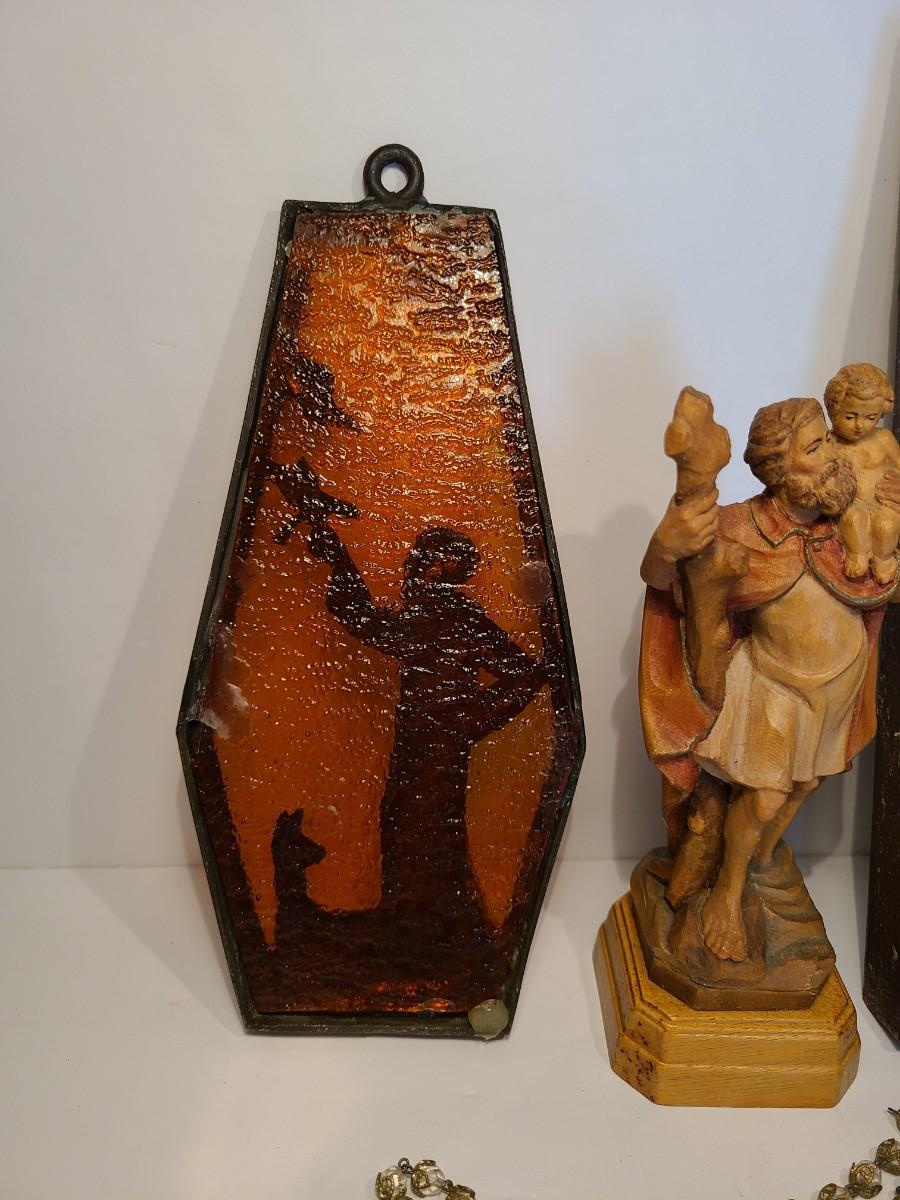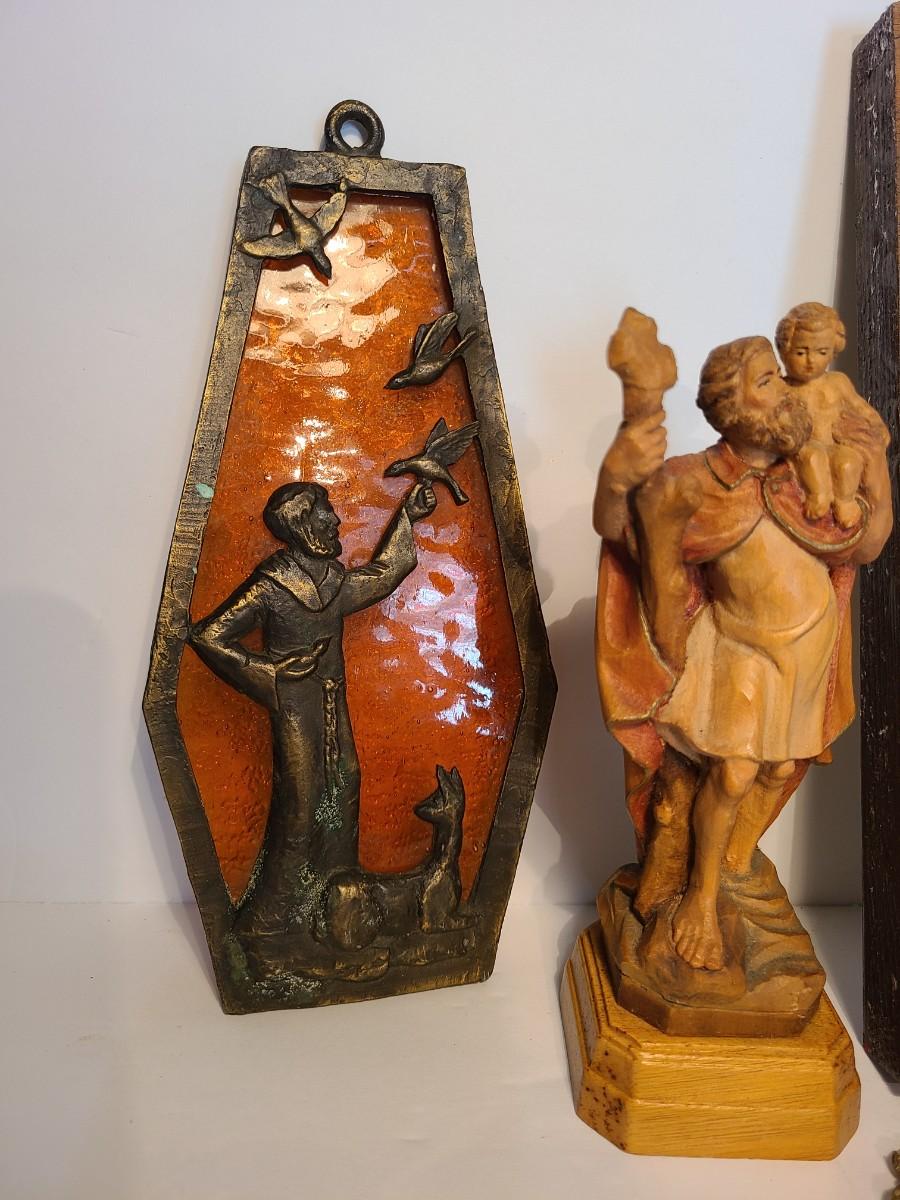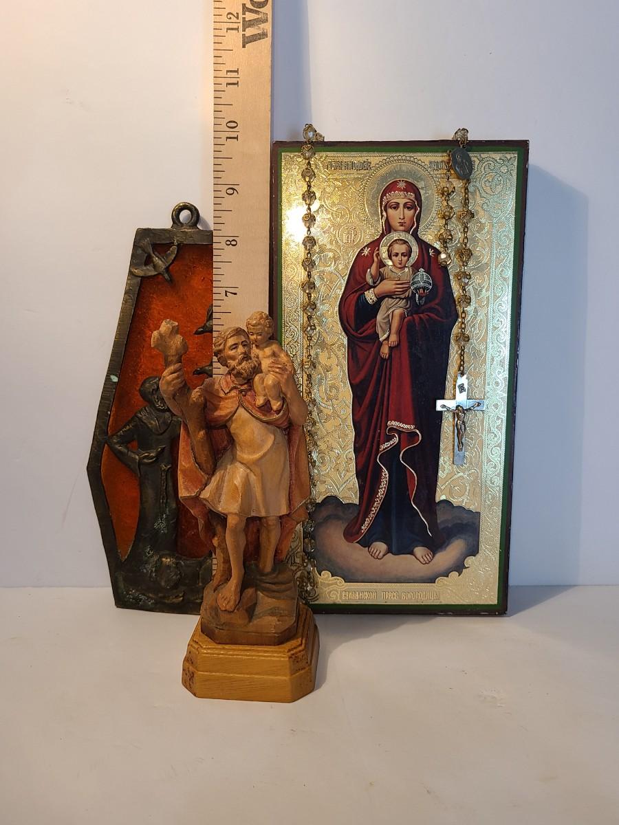 The glass rosary beads needs a repair to reconnect on side. Wood religious plaque, glass/metal Saint wall plaque and wood carved saint by Italian artist Anri. Please see all pictures as they are the best representation of the items. The pictures show condition, measurements if taken, and what is included in the lot. Due to the large amount that we photograph and the time frame, we are not always able to take measurements. All items unless noted, are pre-owned and have been used. If you purchased furniture, you must bring help. We do not allow one person to carry large furniture out on their own. Bring help, tools and a truck for the safety of our client’s homes, and your personal safety. Any damages that result to the property including walls, and floors due to moving of the furniture will be charged to the buyer. Company policy. Thank you.