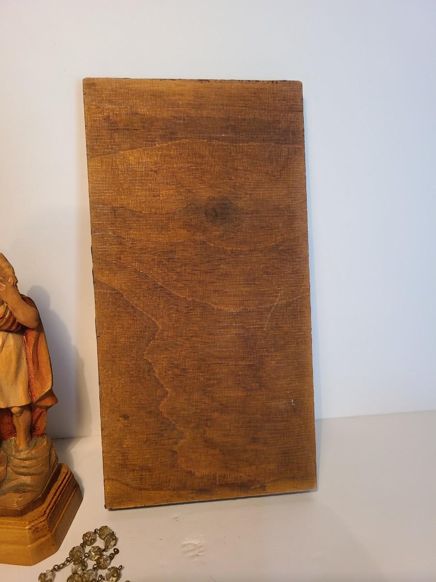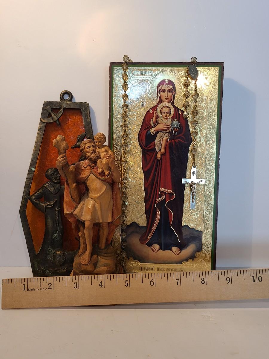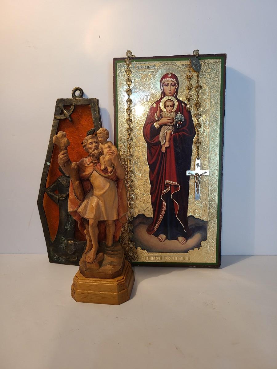 The glass rosary beads needs a repair to reconnect on side. Wood religious plaque, glass/metal Saint wall plaque and wood carved saint by Italian artist Anri. Please see all pictures as they are the best representation of the items. The pictures show condition, measurements if taken, and what is included in the lot. Due to the large amount that we photograph and the time frame, we are not always able to take measurements. All items unless noted, are pre-owned and have been used. If you purchased furniture, you must bring help. We do not allow one person to carry large furniture out on their own. Bring help, tools and a truck for the safety of our client’s homes, and your personal safety. Any damages that result to the property including walls, and floors due to moving of the furniture will be charged to the buyer. Company policy. Thank you.