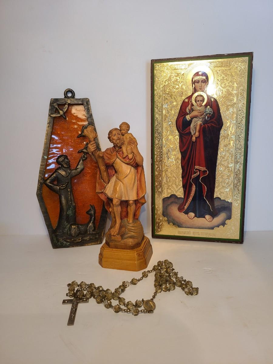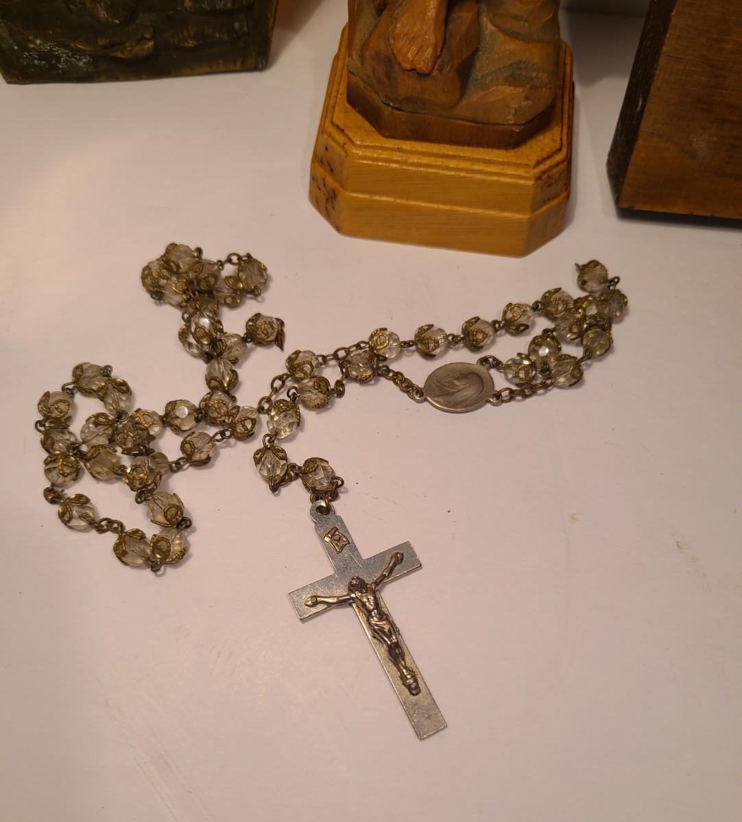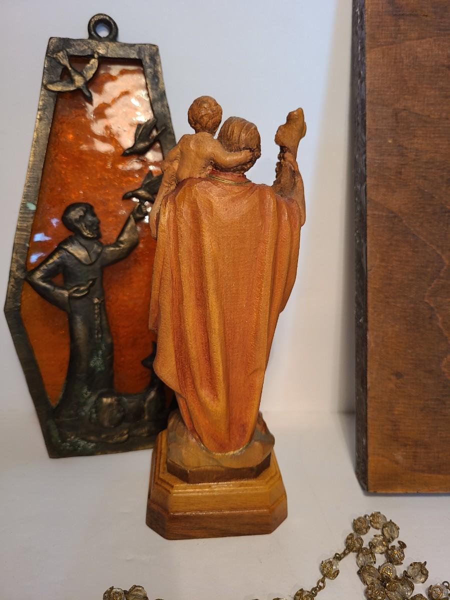 LOT 64: Wood Carved Anri Statue, Vintage Glass Rosary Beads and More