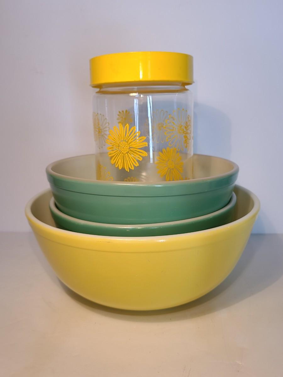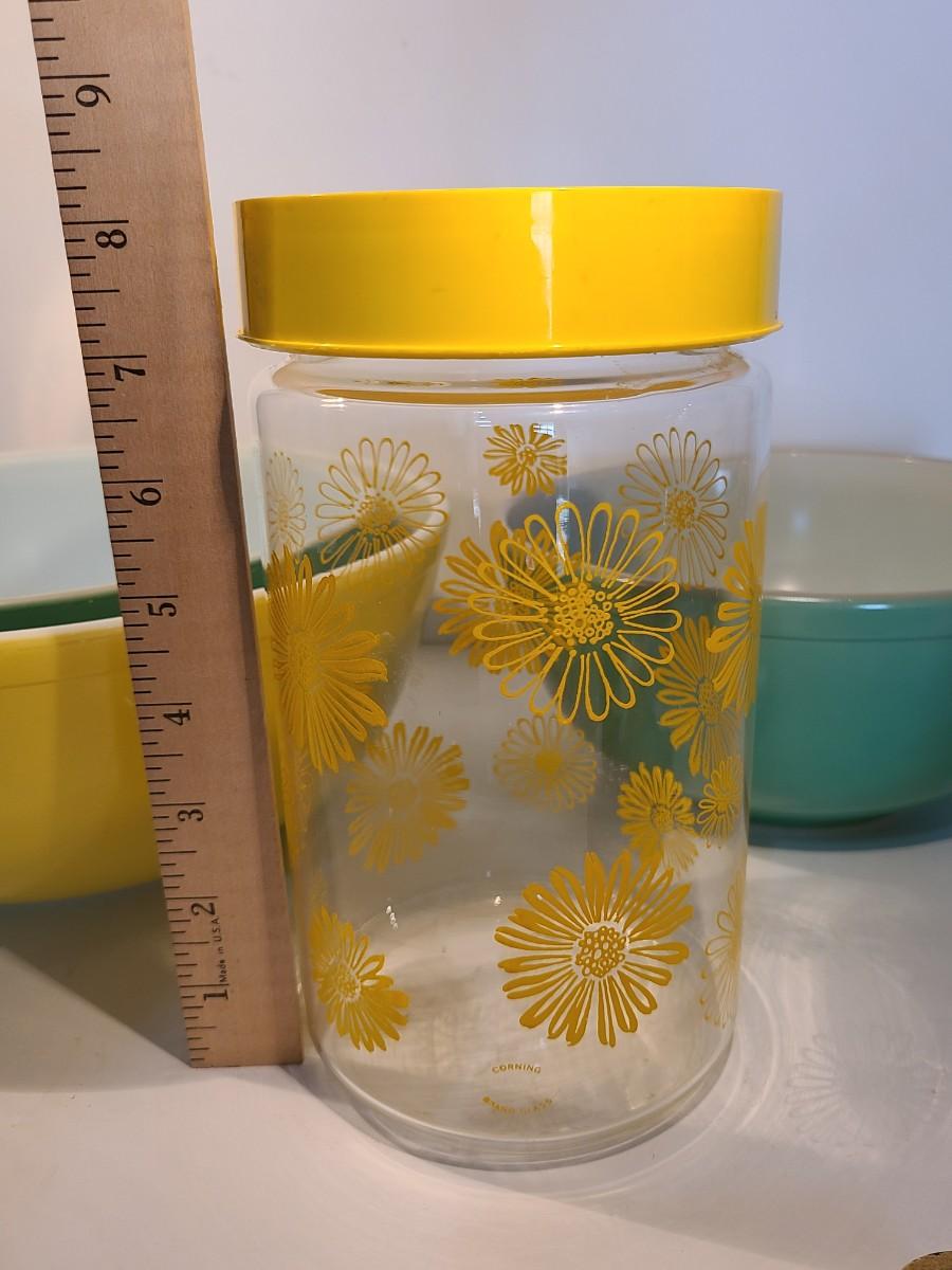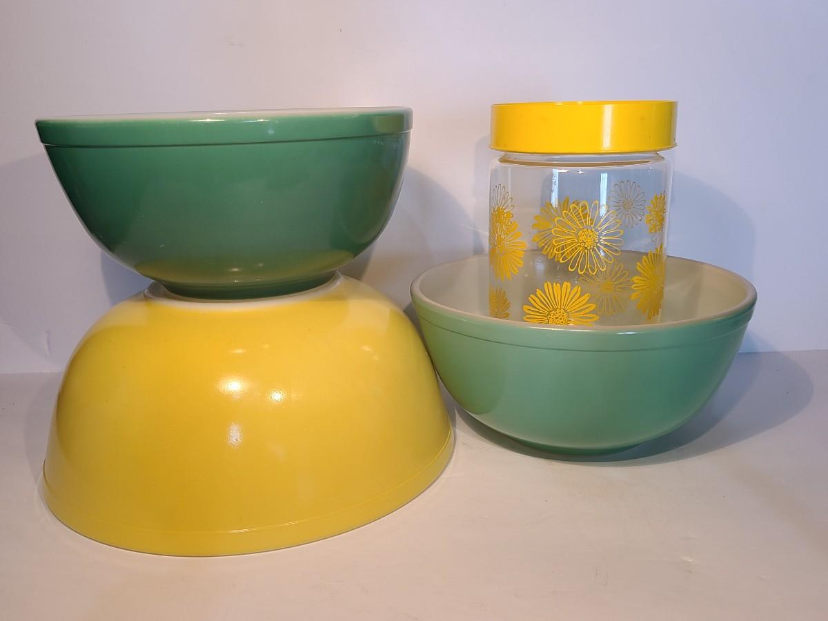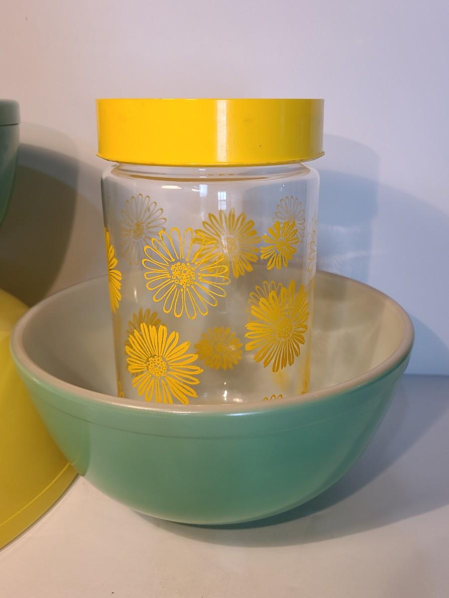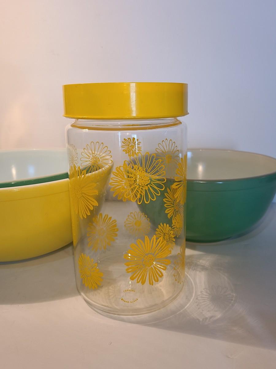 LOT 65:: Pyrex Mixing Bowls & Corning Daisy Canister