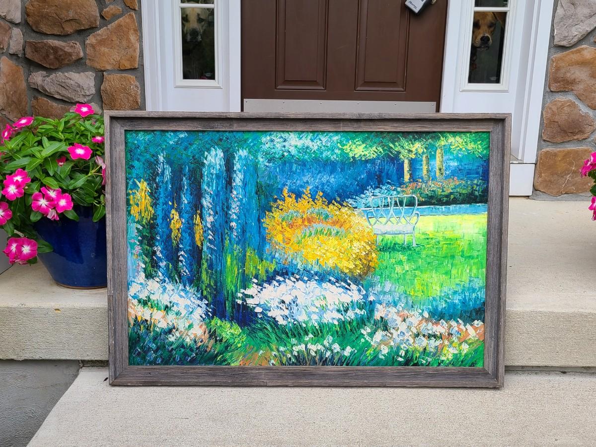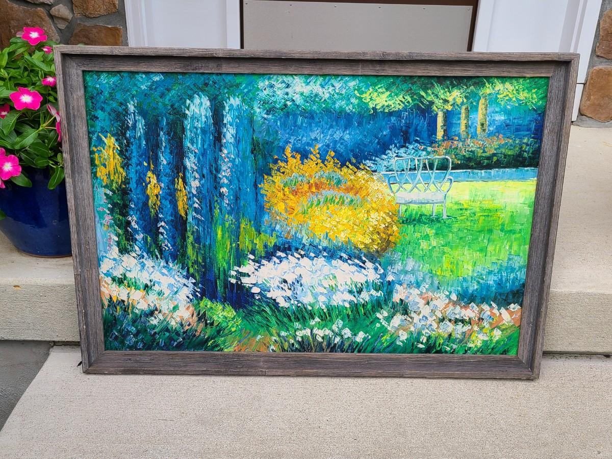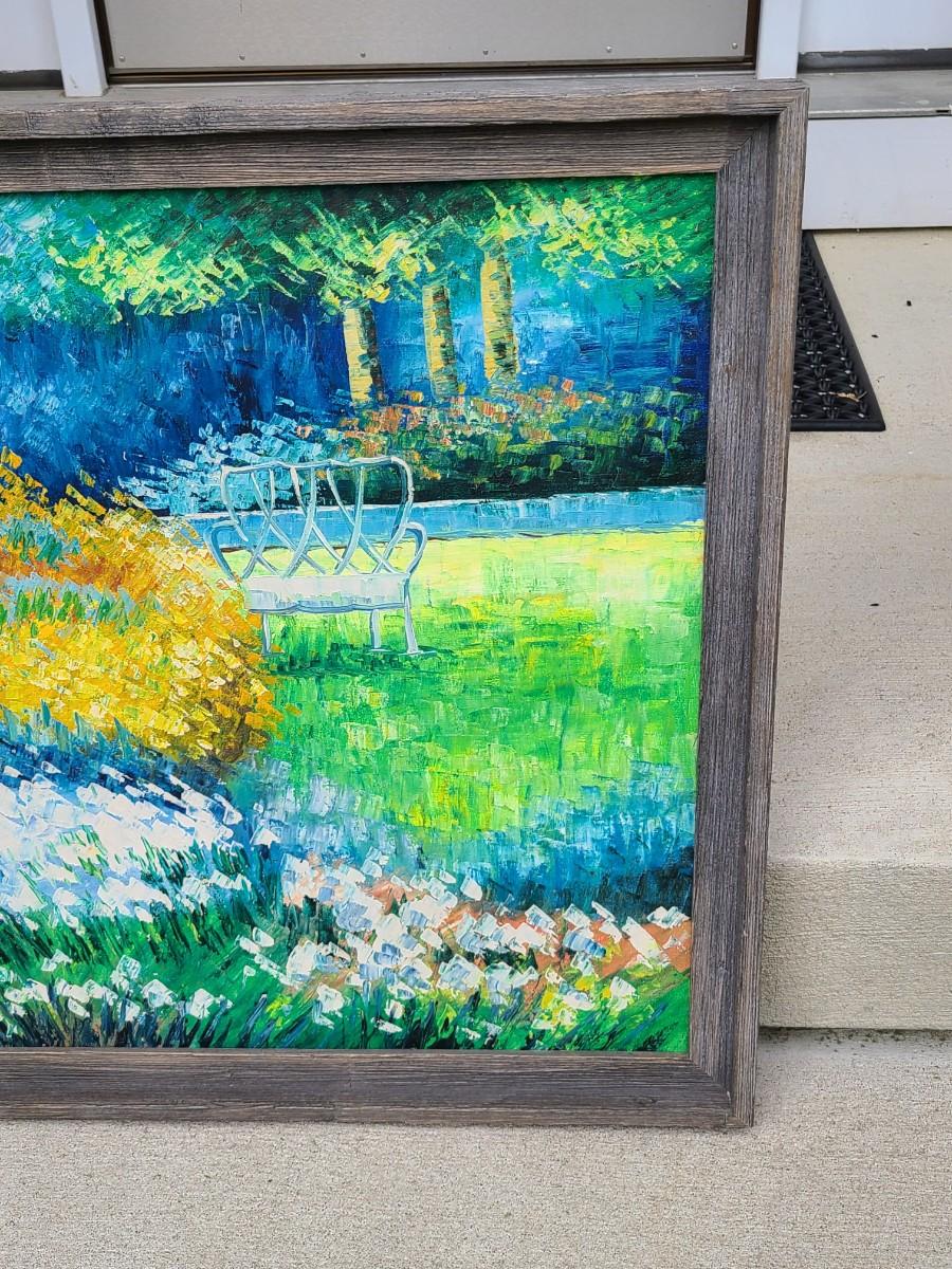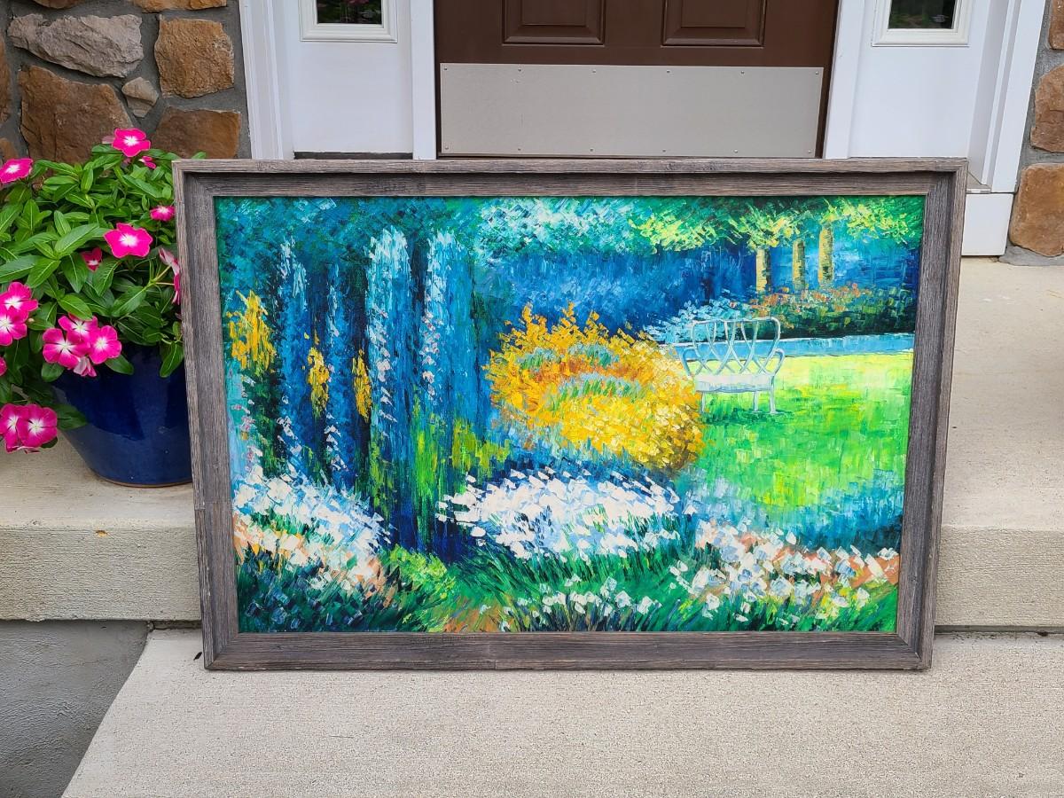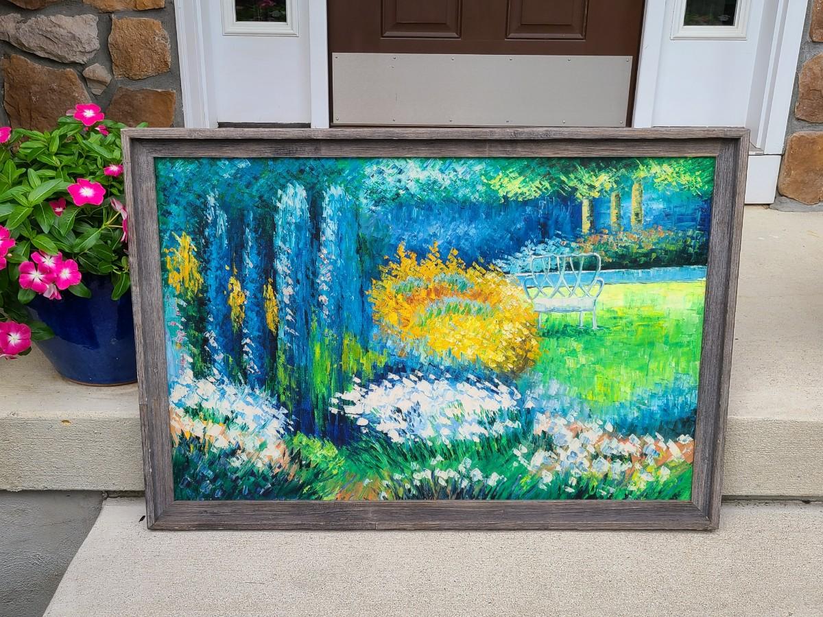 Not sure if oil or acrylics. Absolutely gorgeous. On canvas. Please see all pictures as they are the best representation of the items. The pictures show condition, measurements if taken, and what is included in the lot. Due to the large amount that we photograph and the time frame, we are not always able to take measurements. All items unless noted, are pre-owned and have been used. If you purchased furniture, you must bring help. We do not allow one person to carry large furniture out on their own. Bring help, tools and a truck for the safety of our client’s homes, and your personal safety. Any damages that result to the property including walls, and floors due to moving of the furniture will be charged to the buyer. Company policy. Thank you.
