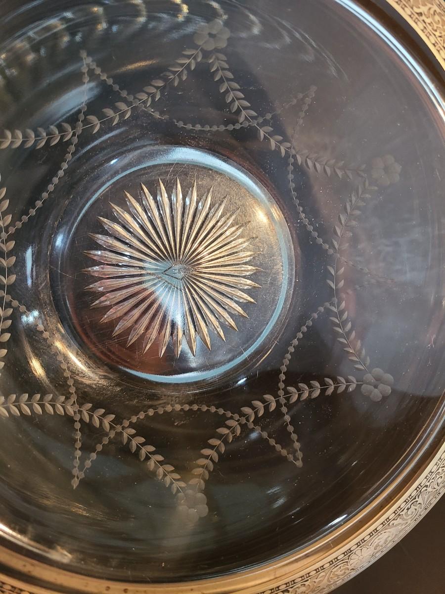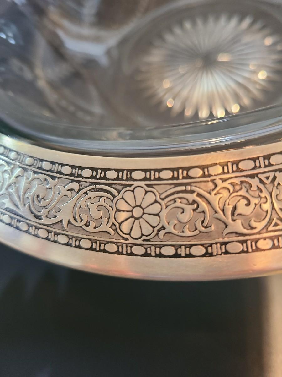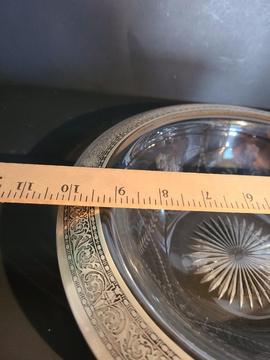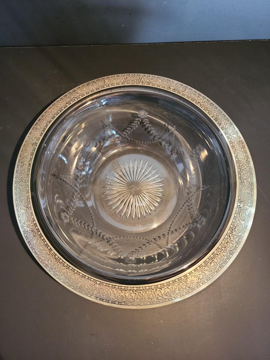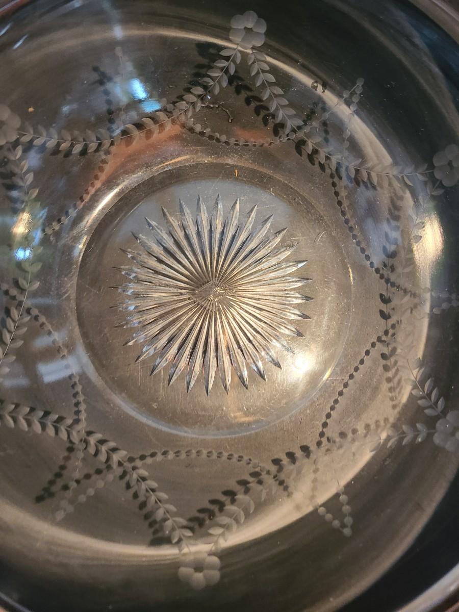 Gorgeous antique bowl with minimal scratches on interior. Sterling rimmed. Marked underneath. Gorgeous details on sterling and etched glass with Heisey Glass diamond/ H