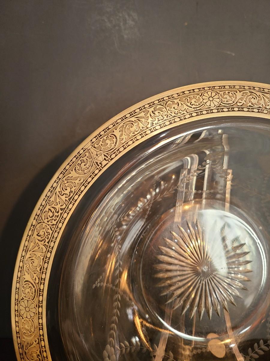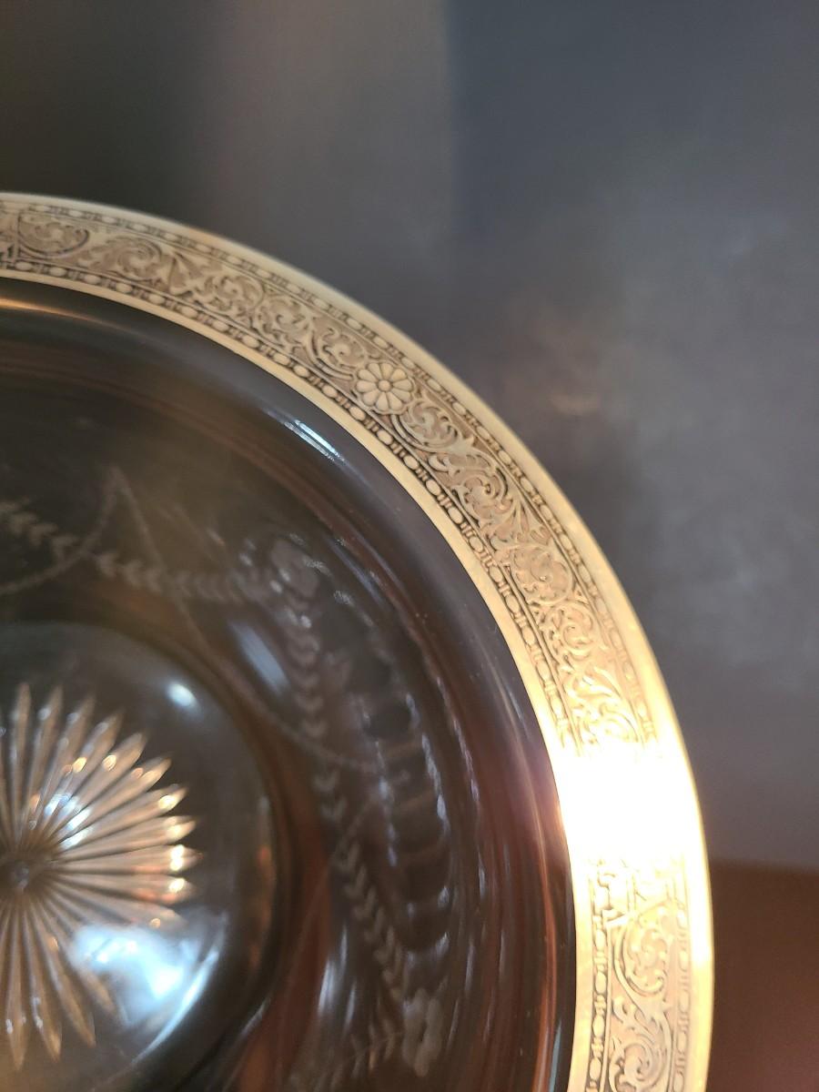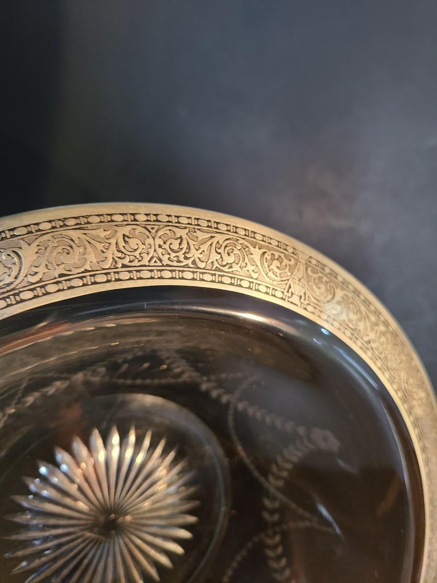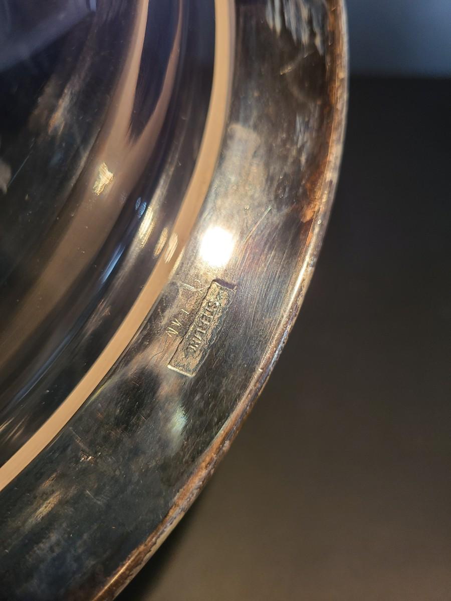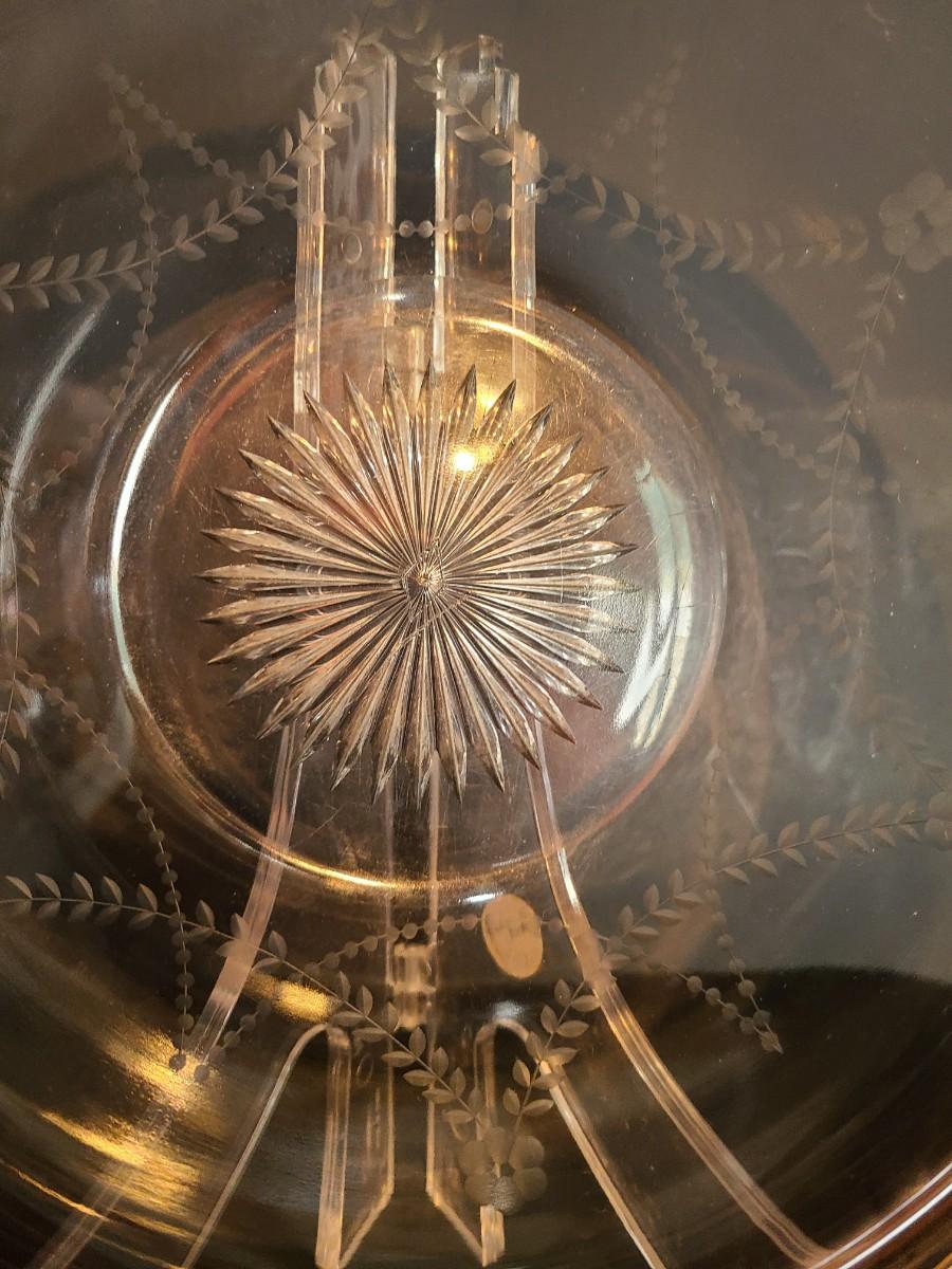 Gorgeous antique bowl with minimal scratches on interior. Sterling rimmed. Marked underneath. Gorgeous details on sterling and etched glass with Heisey Glass diamond/ H