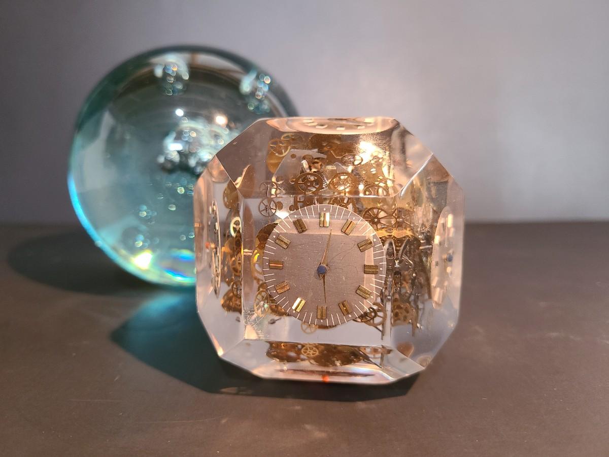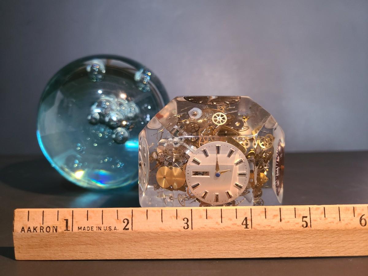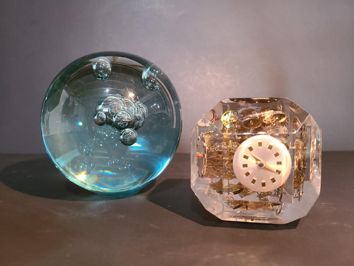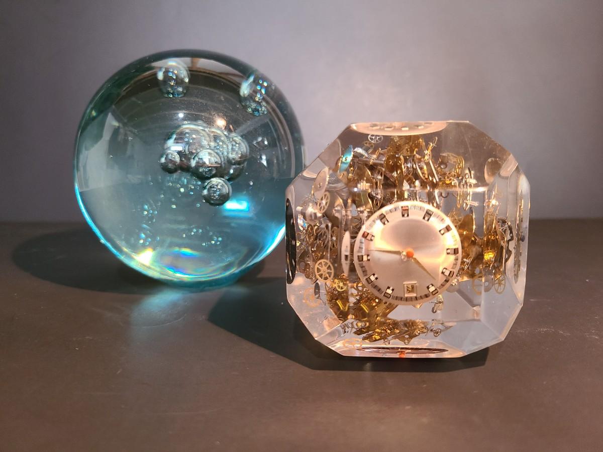 LOT 81: MCM Vintage Paperweights: Acrylic Exploding Watches & Blue Bubble