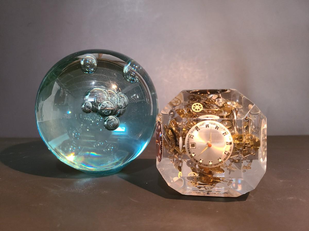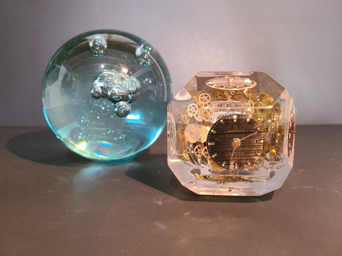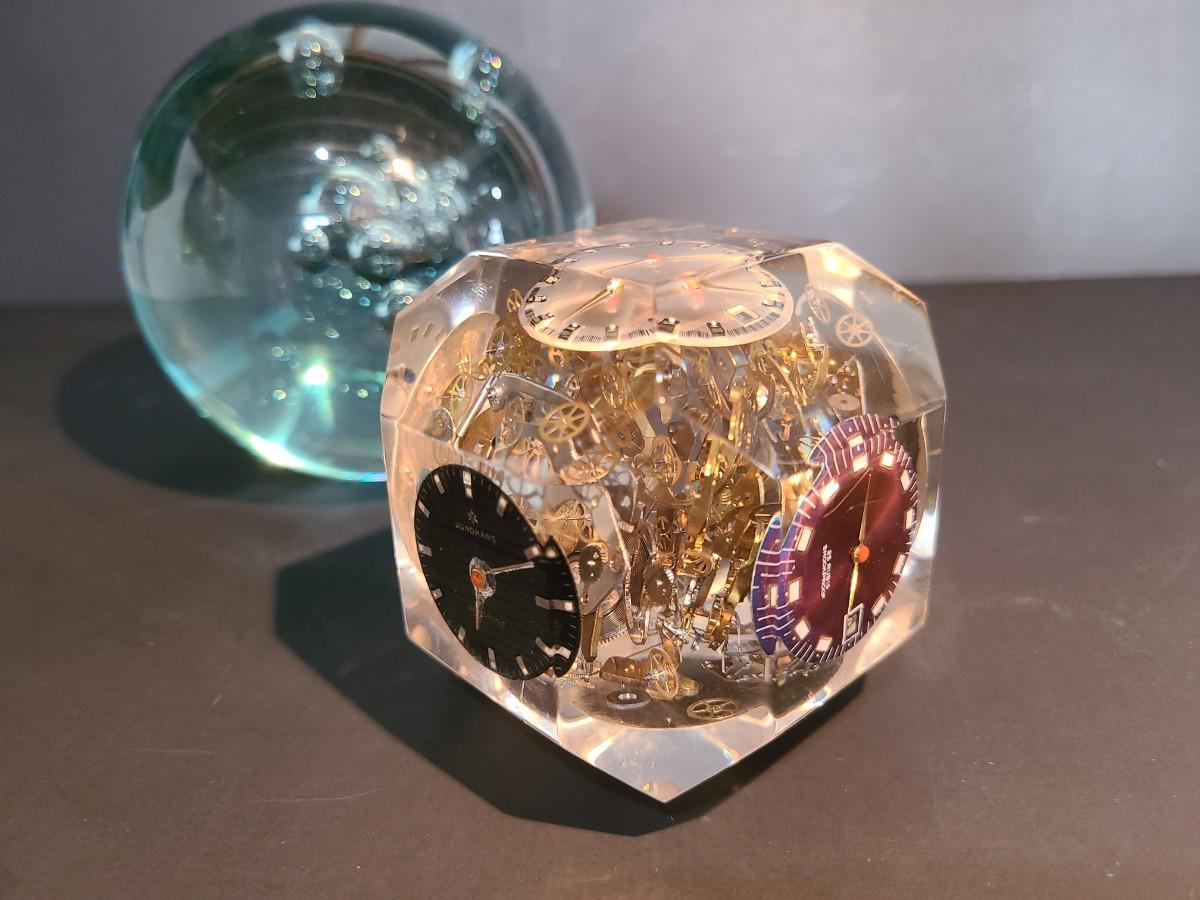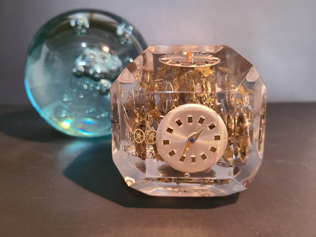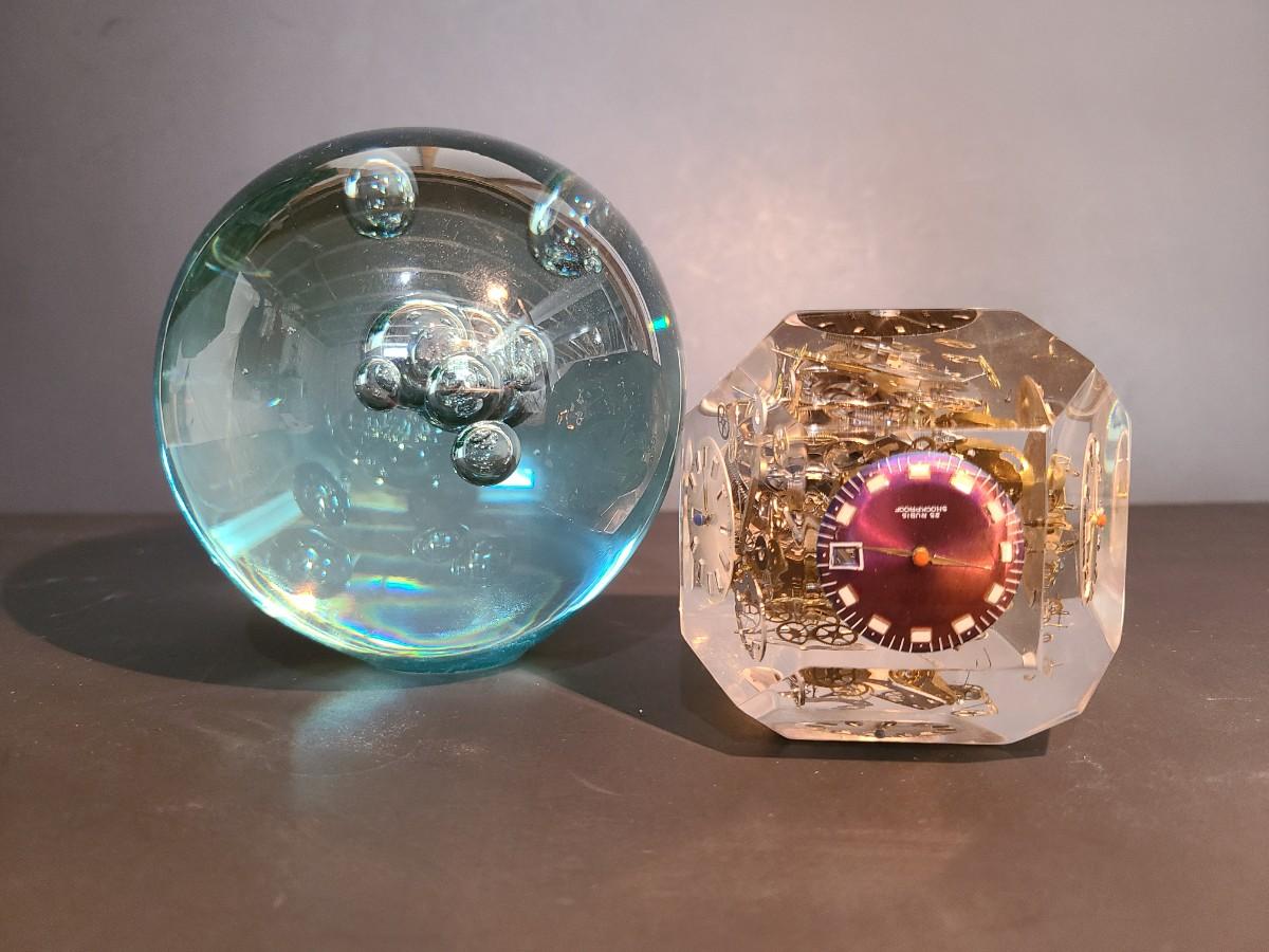 LOT 81: MCM Vintage Paperweights: Acrylic Exploding Watches & Blue Bubble