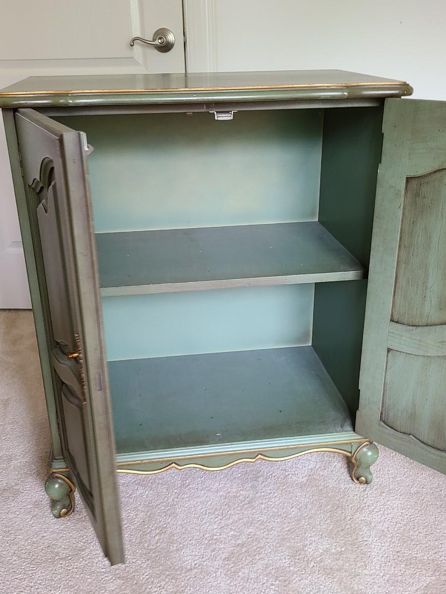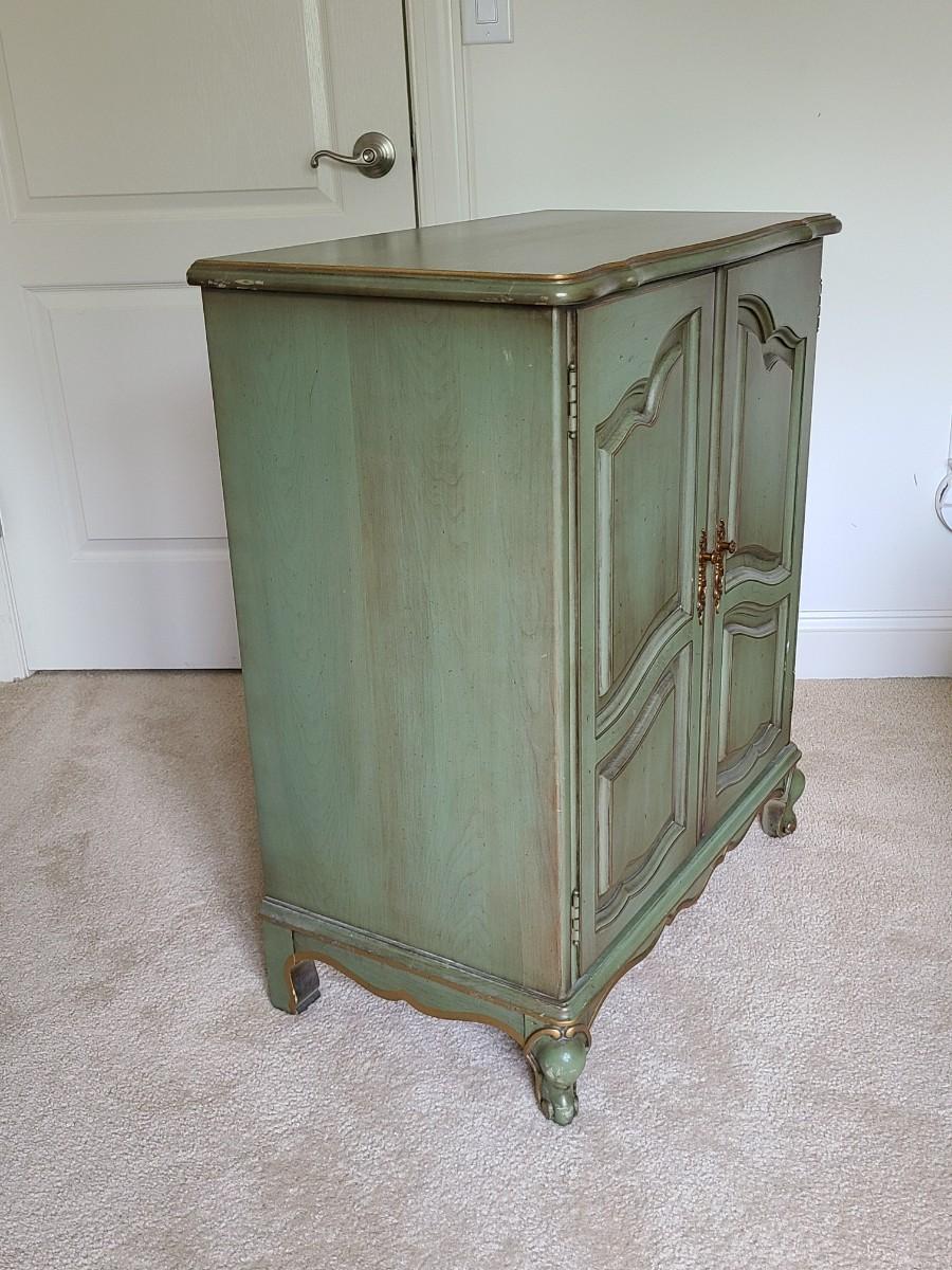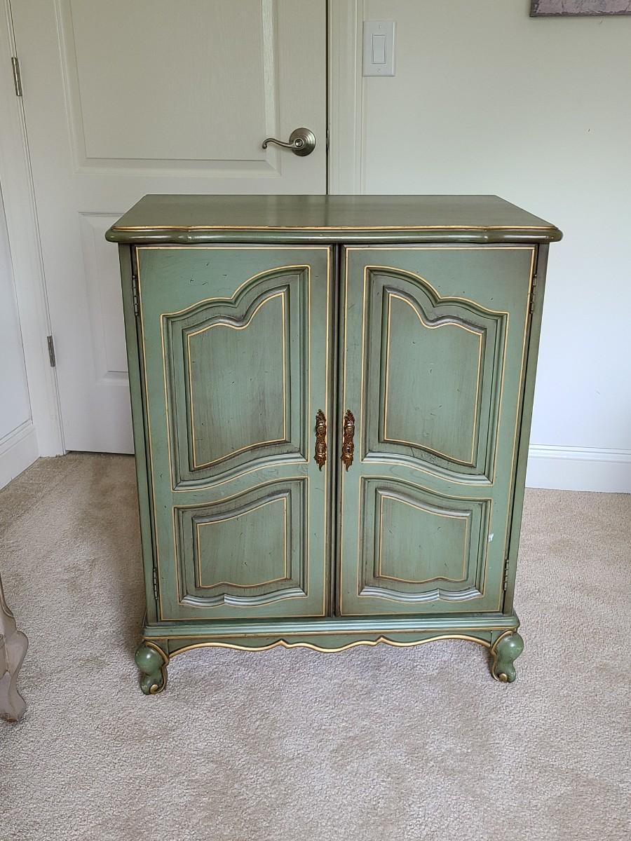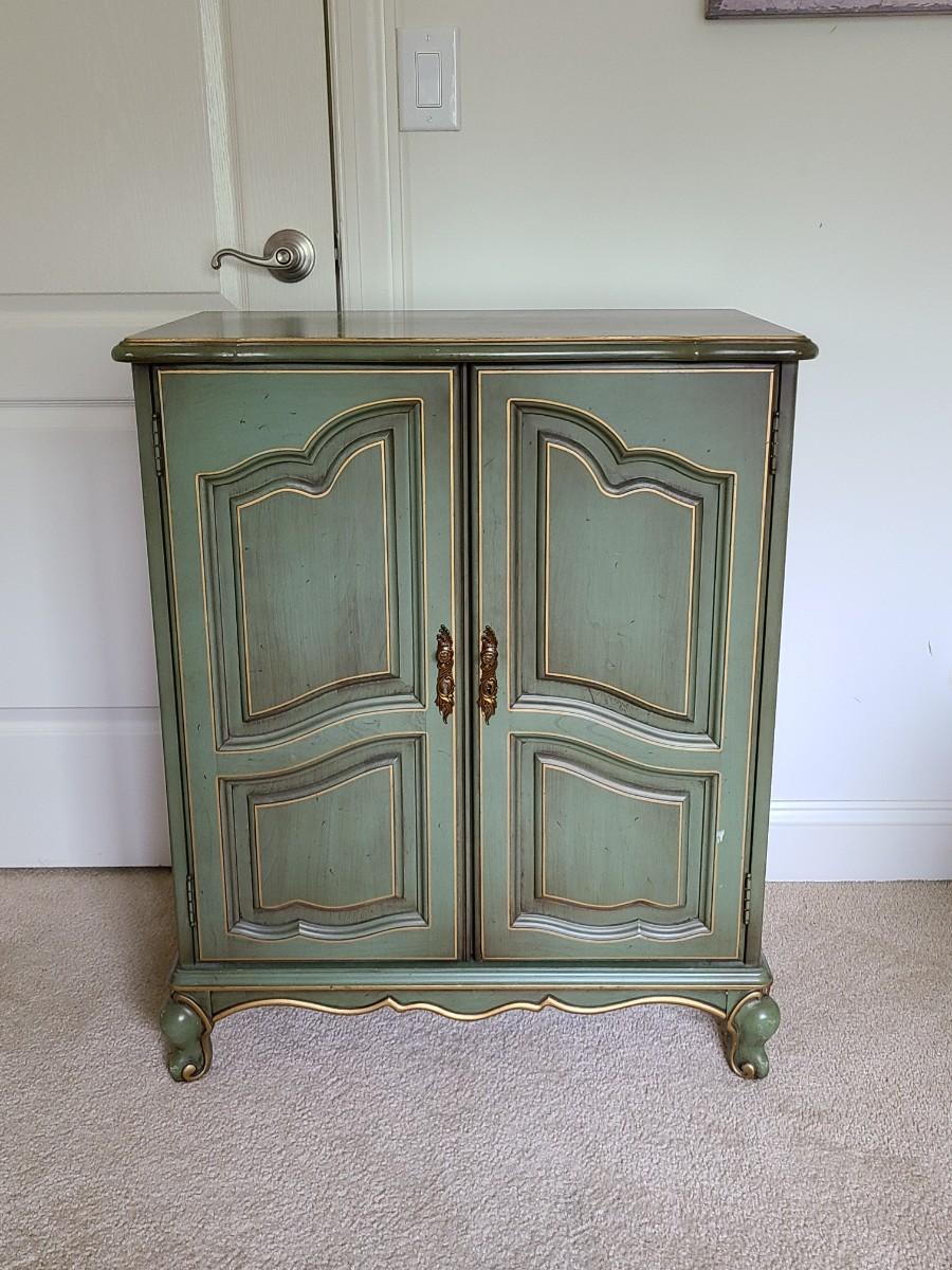 Great sage green vintage cabinet with gold accent trim. Can be used in any room in the home! Perfect as is, or upcycle. Please see all pictures as they are the best representation of the items. The pictures show condition, measurements if taken, and what is included in the lot. Due to the large amount that we photograph and the time frame, we are not always able to take measurements. All items unless noted, are pre-owned and have been used. If you purchased furniture, you must bring help. We do not allow one person to carry large furniture out on their own. Bring help, tools and a truck for the safety of our client’s homes, and your personal safety. Any damages that result to the property including walls, and floors due to moving of the furniture will be charged to the buyer. Company policy. Thank you.