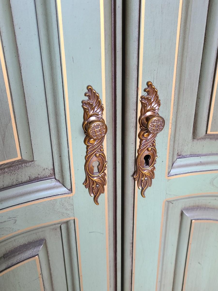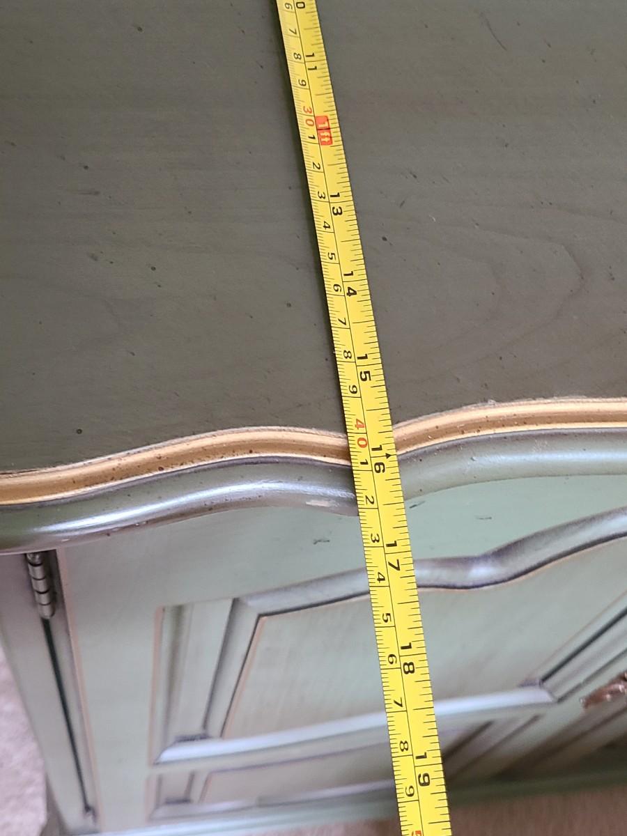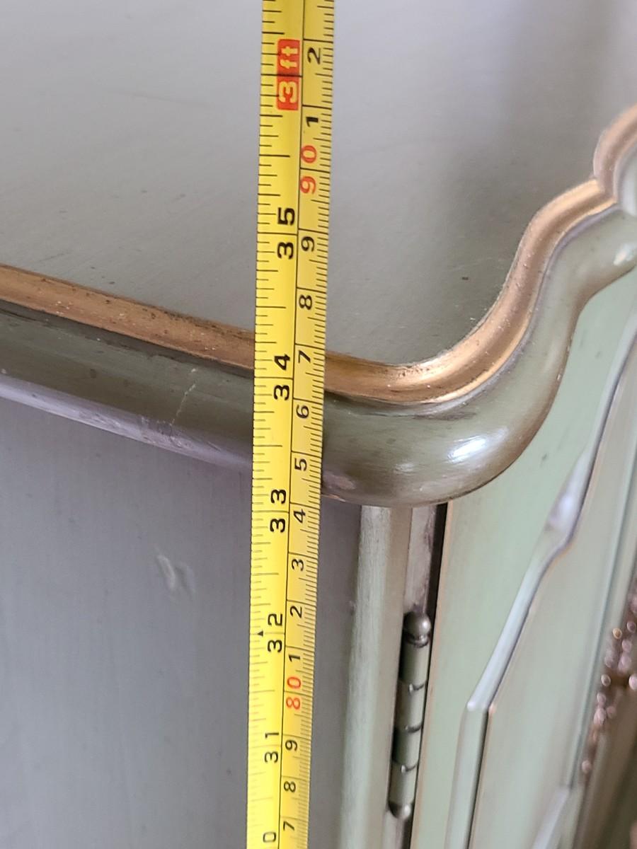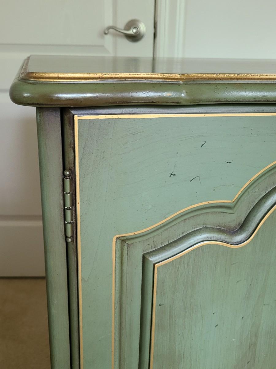 Great sage green vintage cabinet with gold accent trim. Can be used in any room in the home! Perfect as is, or upcycle. Please see all pictures as they are the best representation of the items. The pictures show condition, measurements if taken, and what is included in the lot. Due to the large amount that we photograph and the time frame, we are not always able to take measurements. All items unless noted, are pre-owned and have been used. If you purchased furniture, you must bring help. We do not allow one person to carry large furniture out on their own. Bring help, tools and a truck for the safety of our client’s homes, and your personal safety. Any damages that result to the property including walls, and floors due to moving of the furniture will be charged to the buyer. Company policy. Thank you.