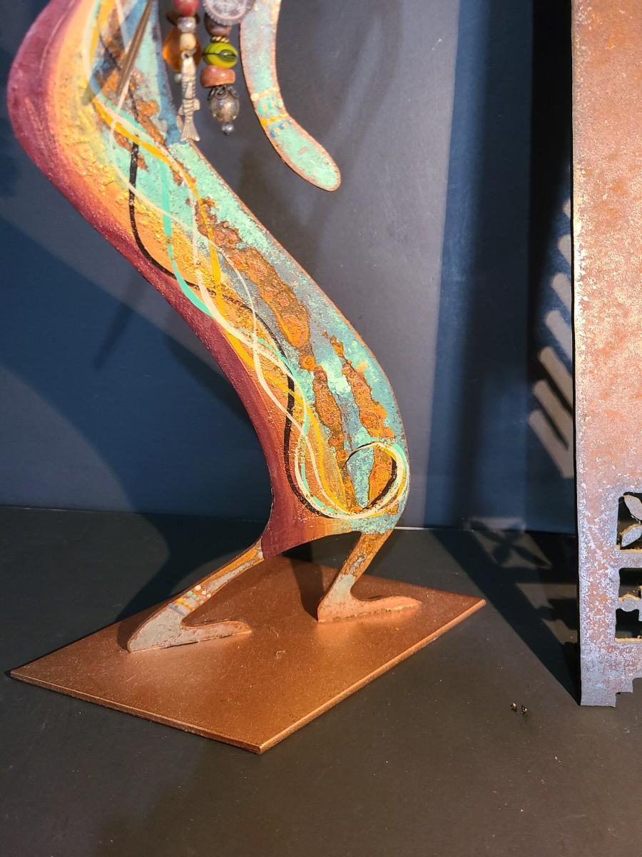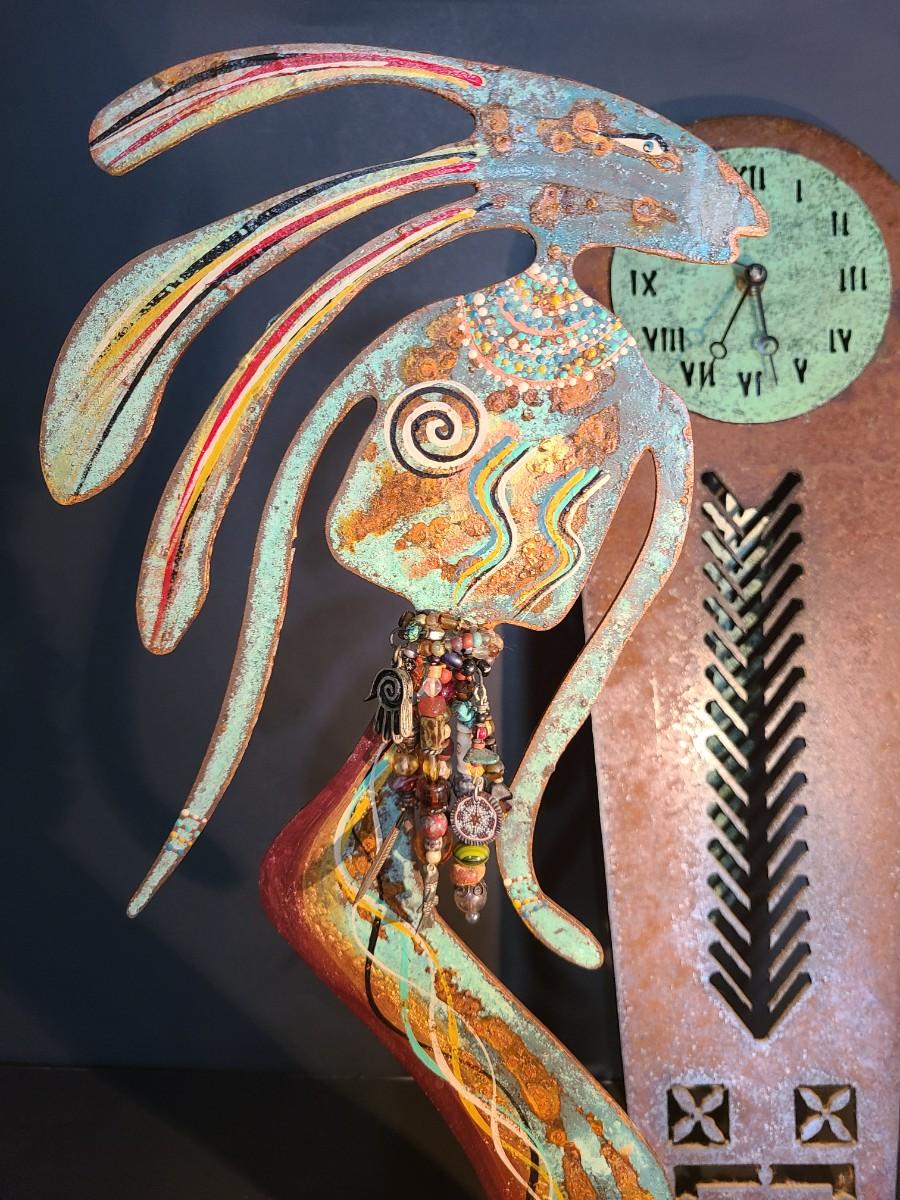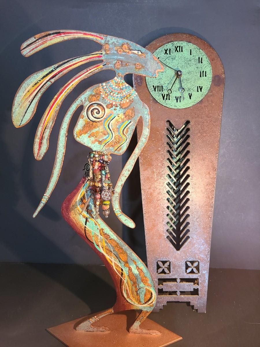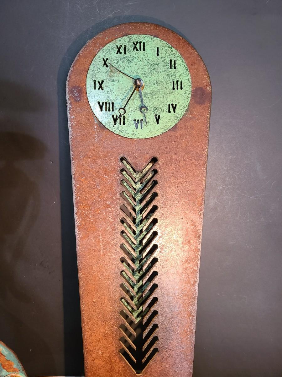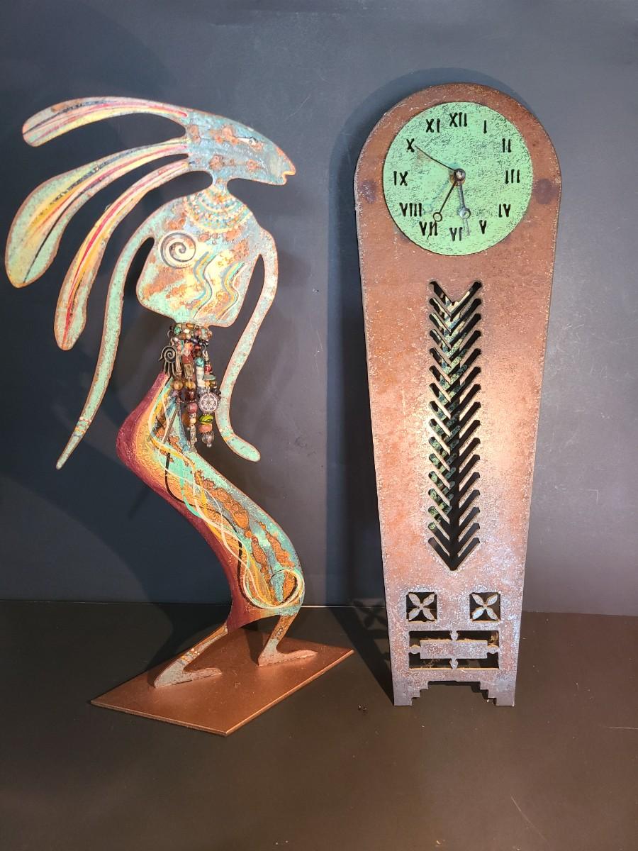 The clock.is metal and battery operated. The sculpture is metal, handpainted work of art by Robert Shields