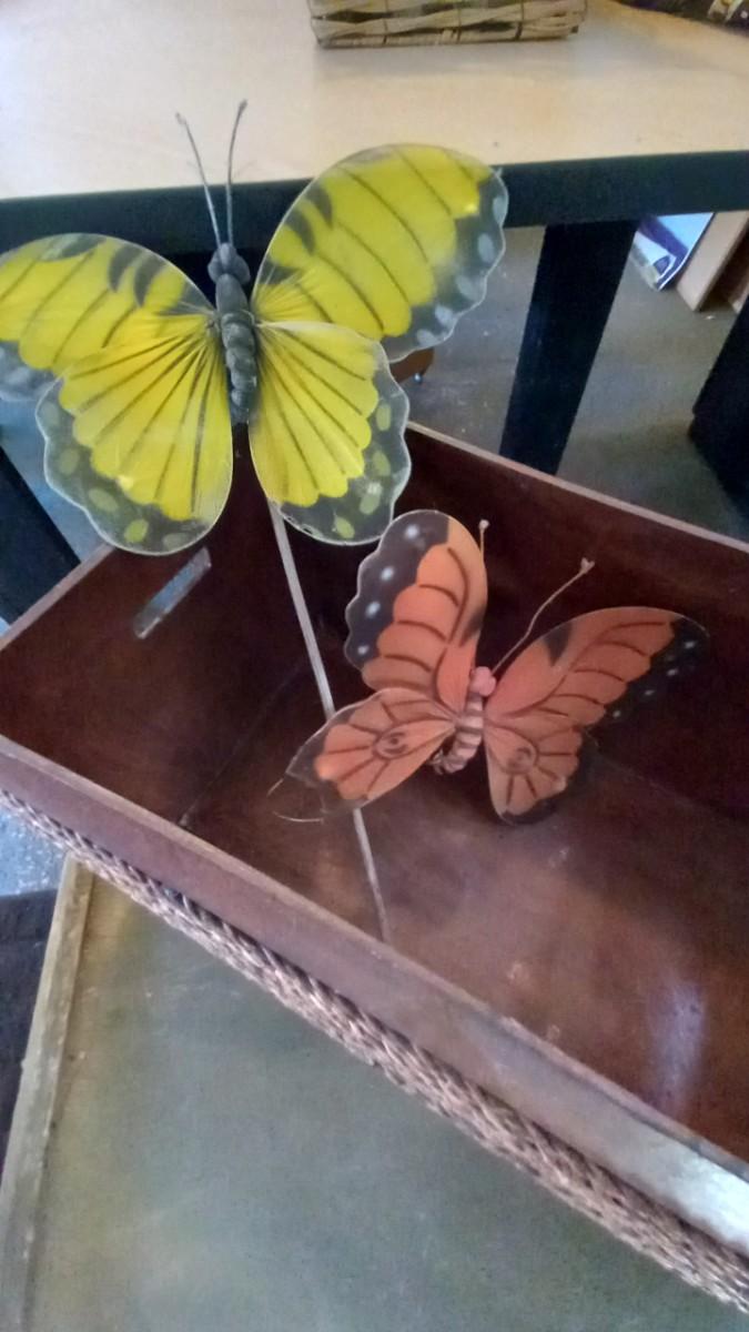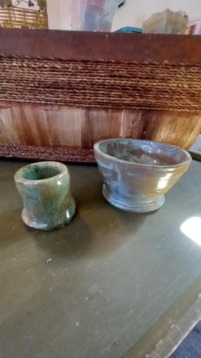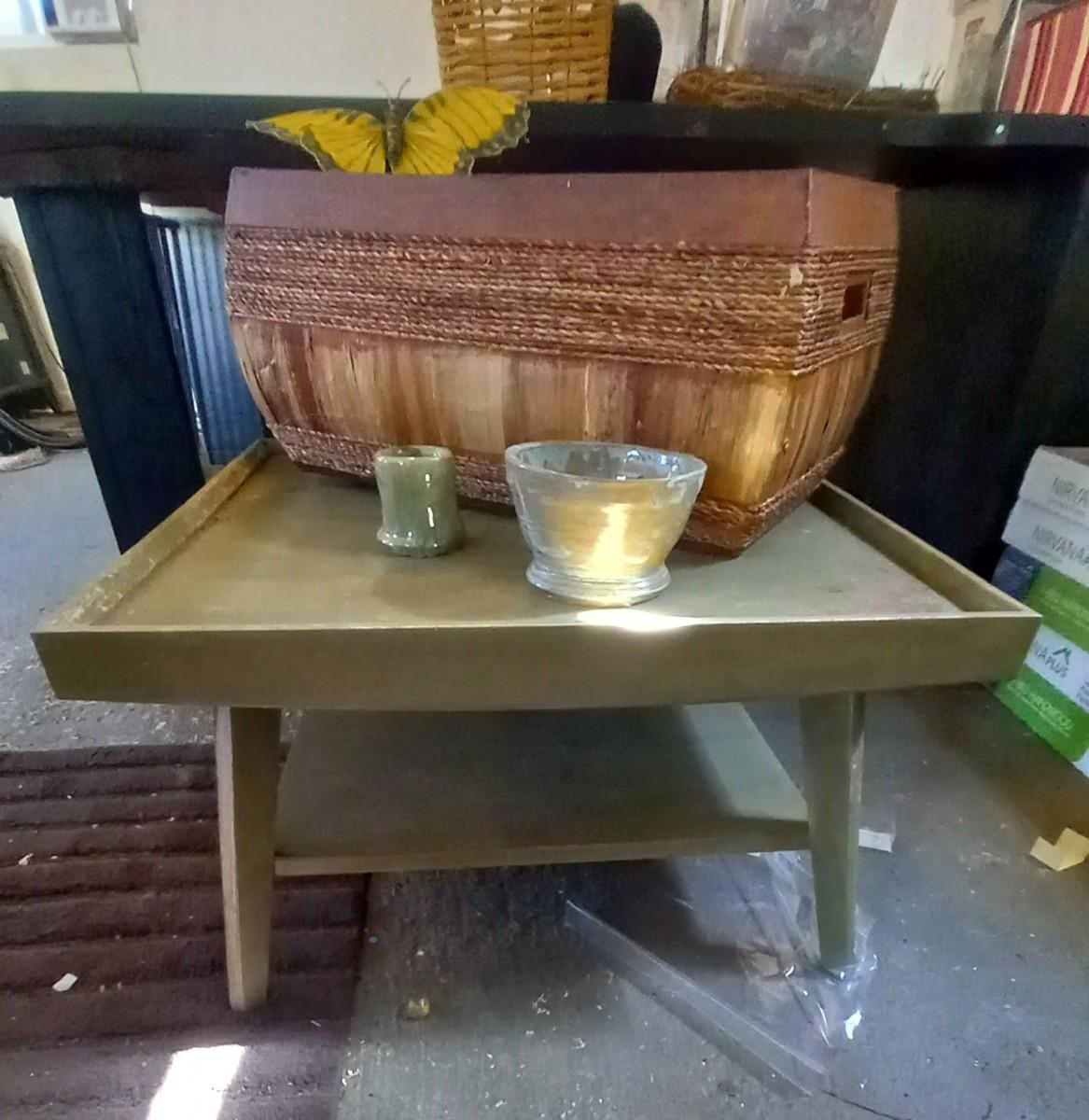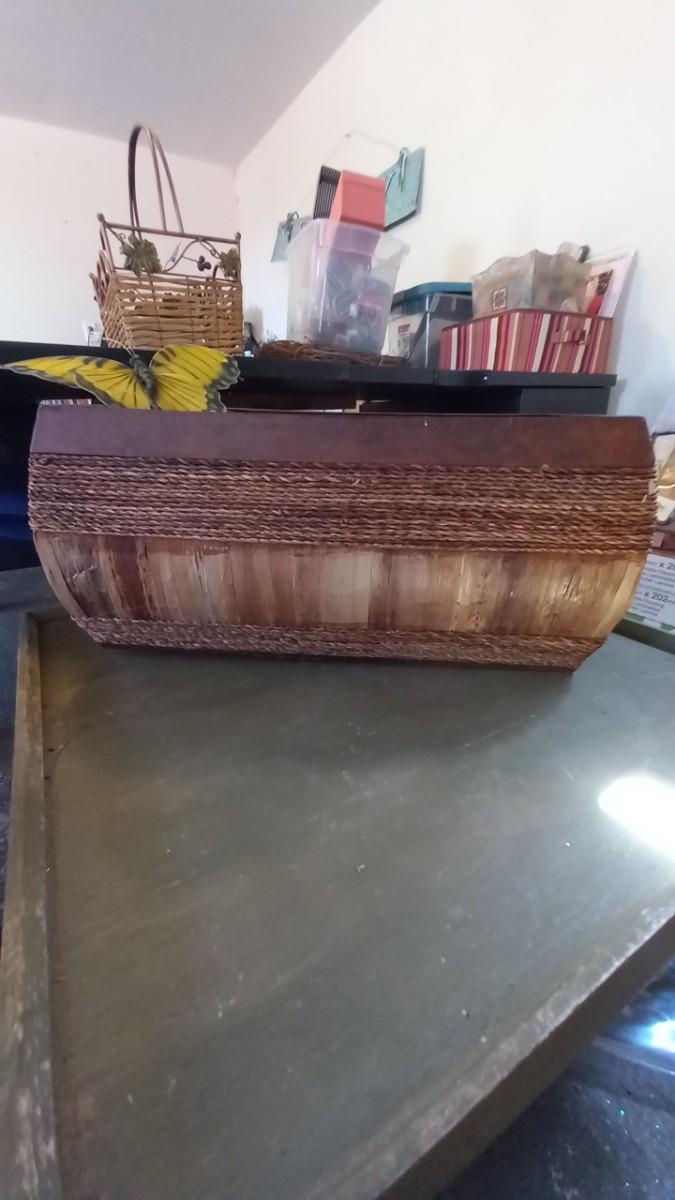 WICKER BASKET 22X10, SMALL WOODEN TABLE 28 sq. AND 2 CLAY PIECES.