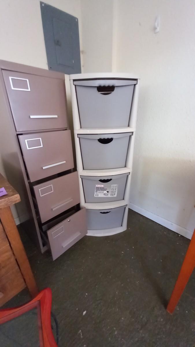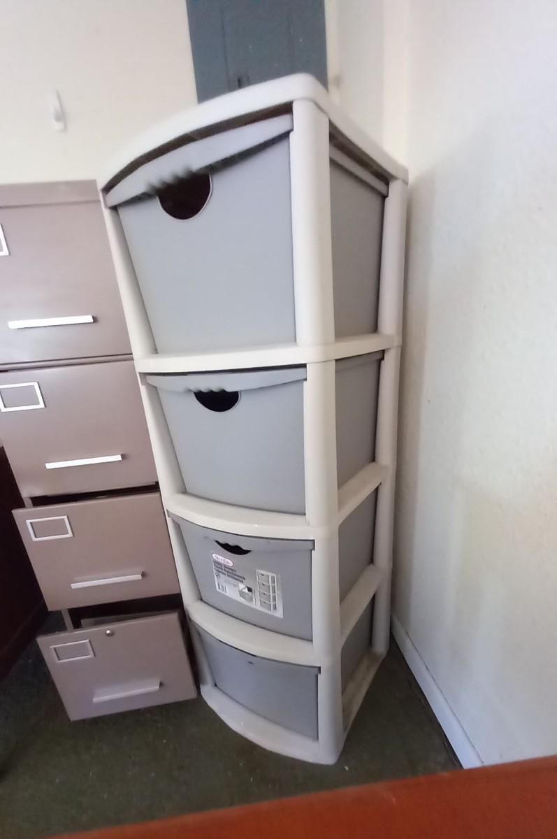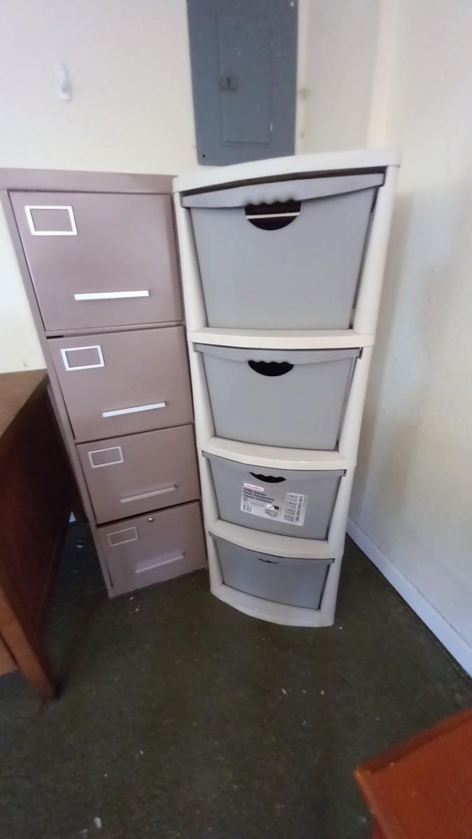 4 DRAWER METAL FILING CABINET 17X21X51 AND STERILITE 4 BIN STORAGE UNIT 16X18X52