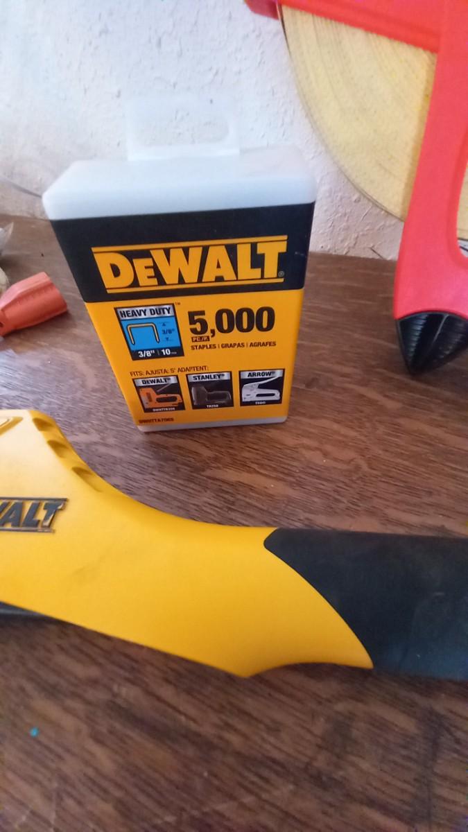 DEWALT NAIL STAPLER AND BOX OF STAPLES-MALLOT-HAMMER AND TAPE MEASURE