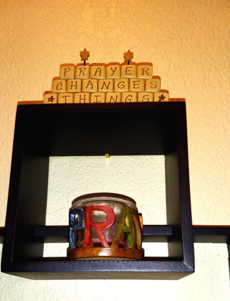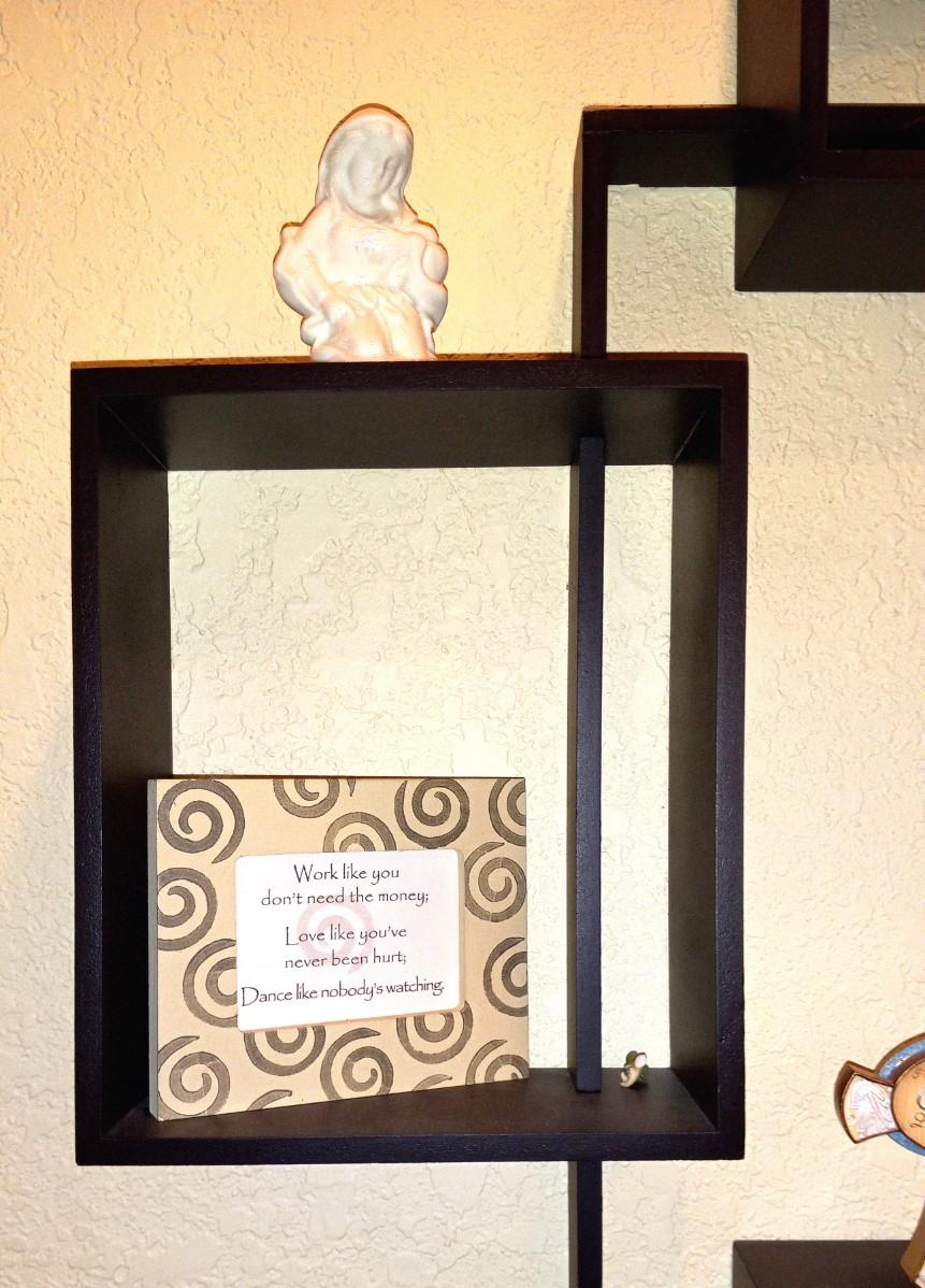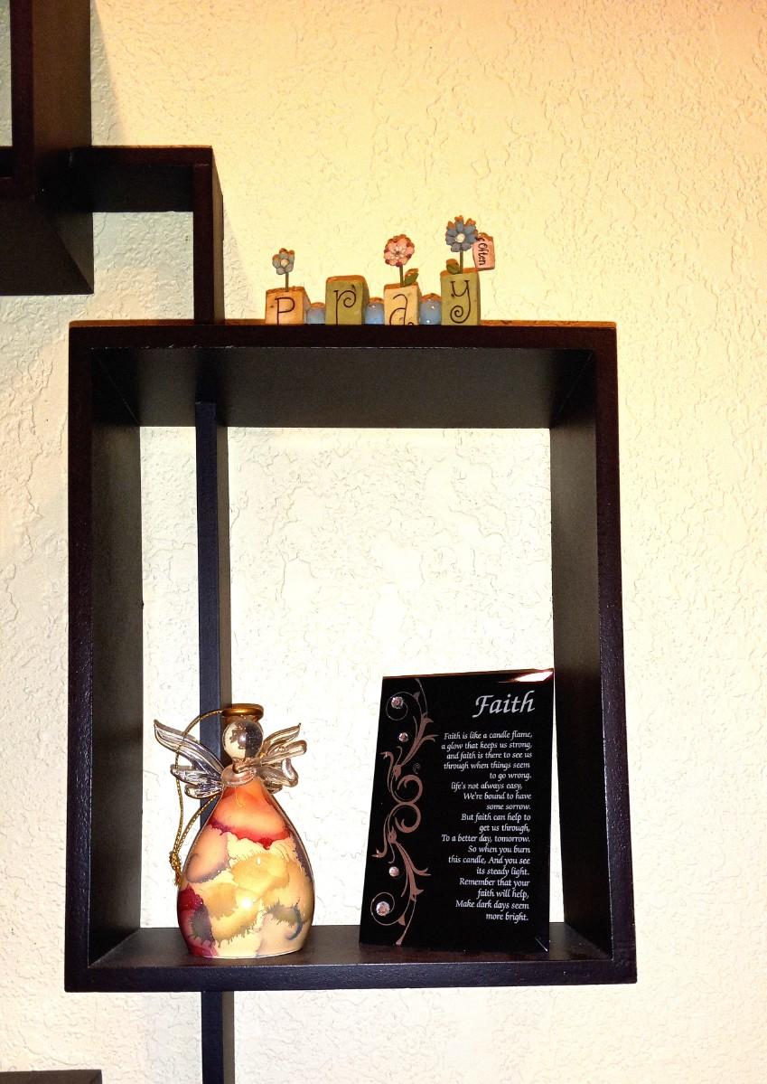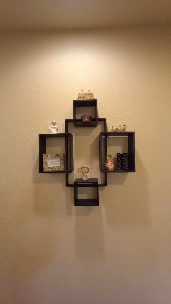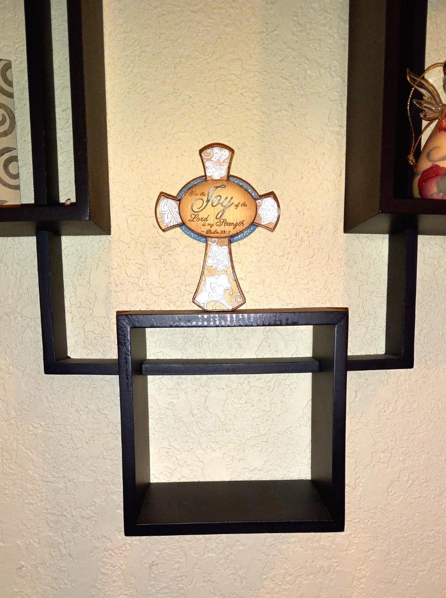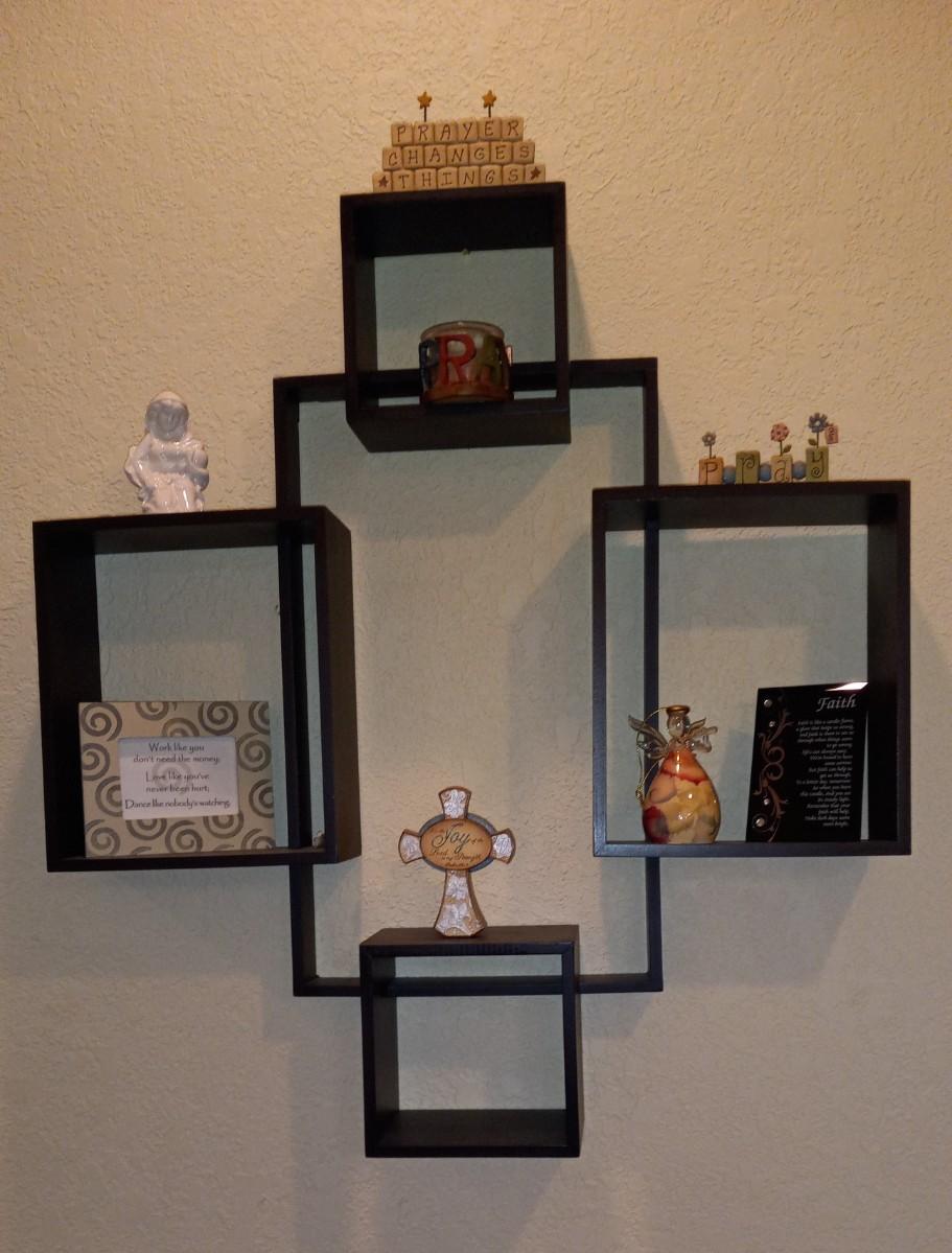 WOODEN HANGING DISPLAY SHELF MEASURES 25X27 AND SMALL RELIGIOUS FIGURINES