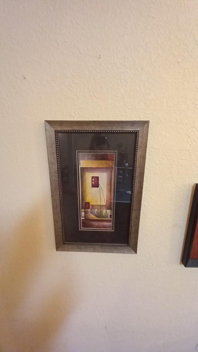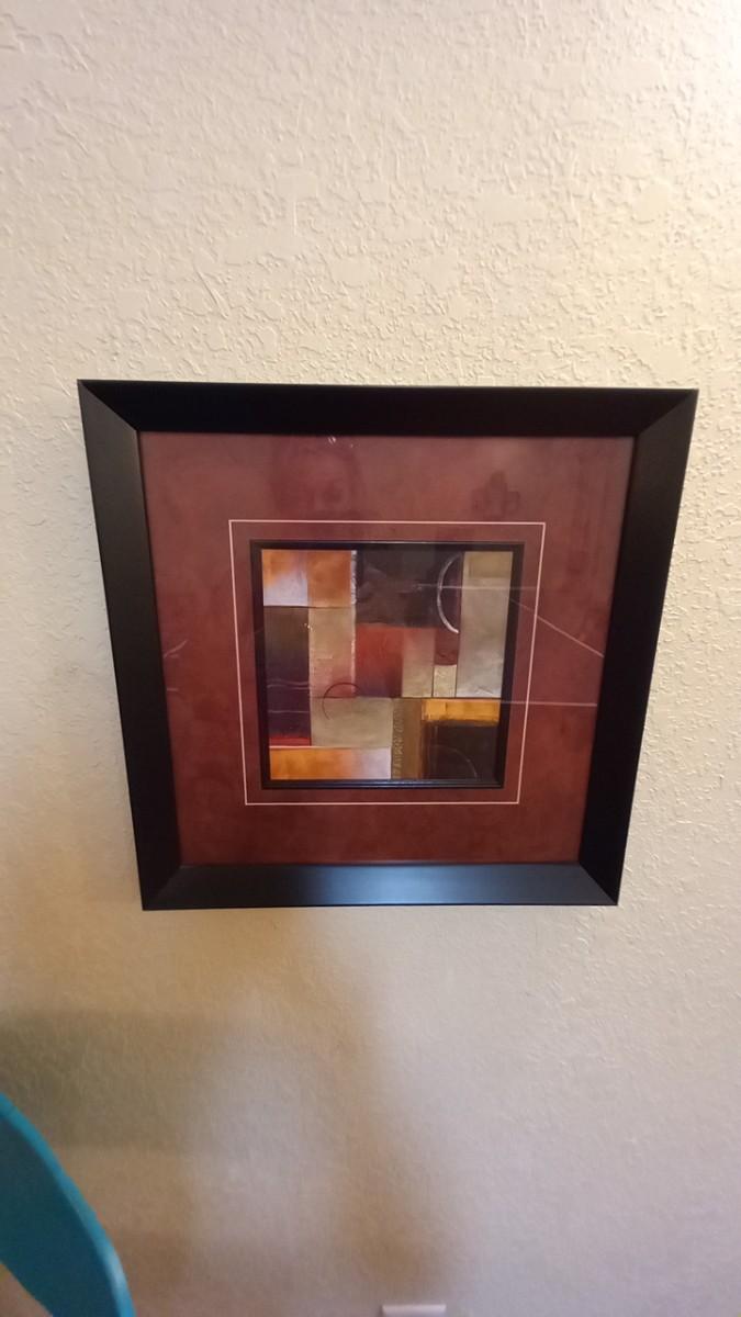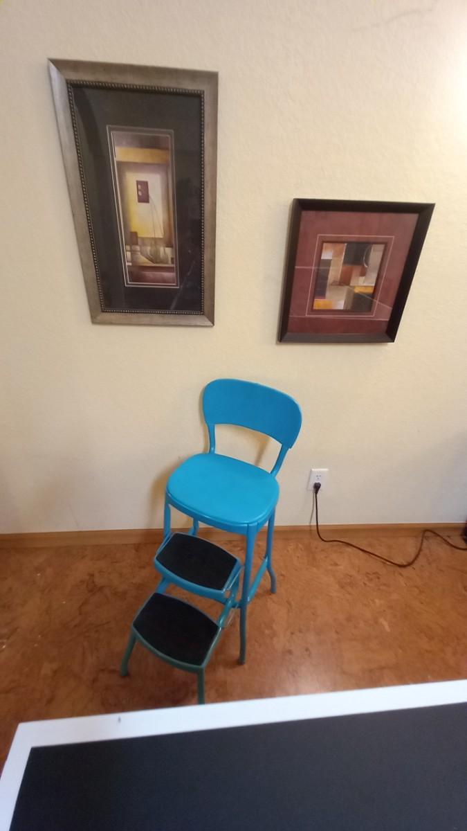 VINTAGE STEP STOOL SEAT WITH TWO FRAMED ABSTRACT PICTURES
