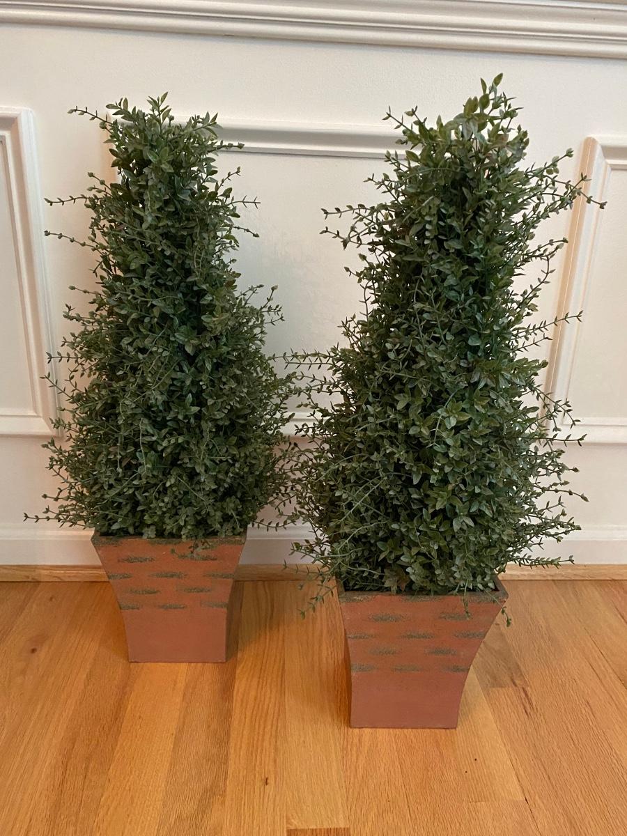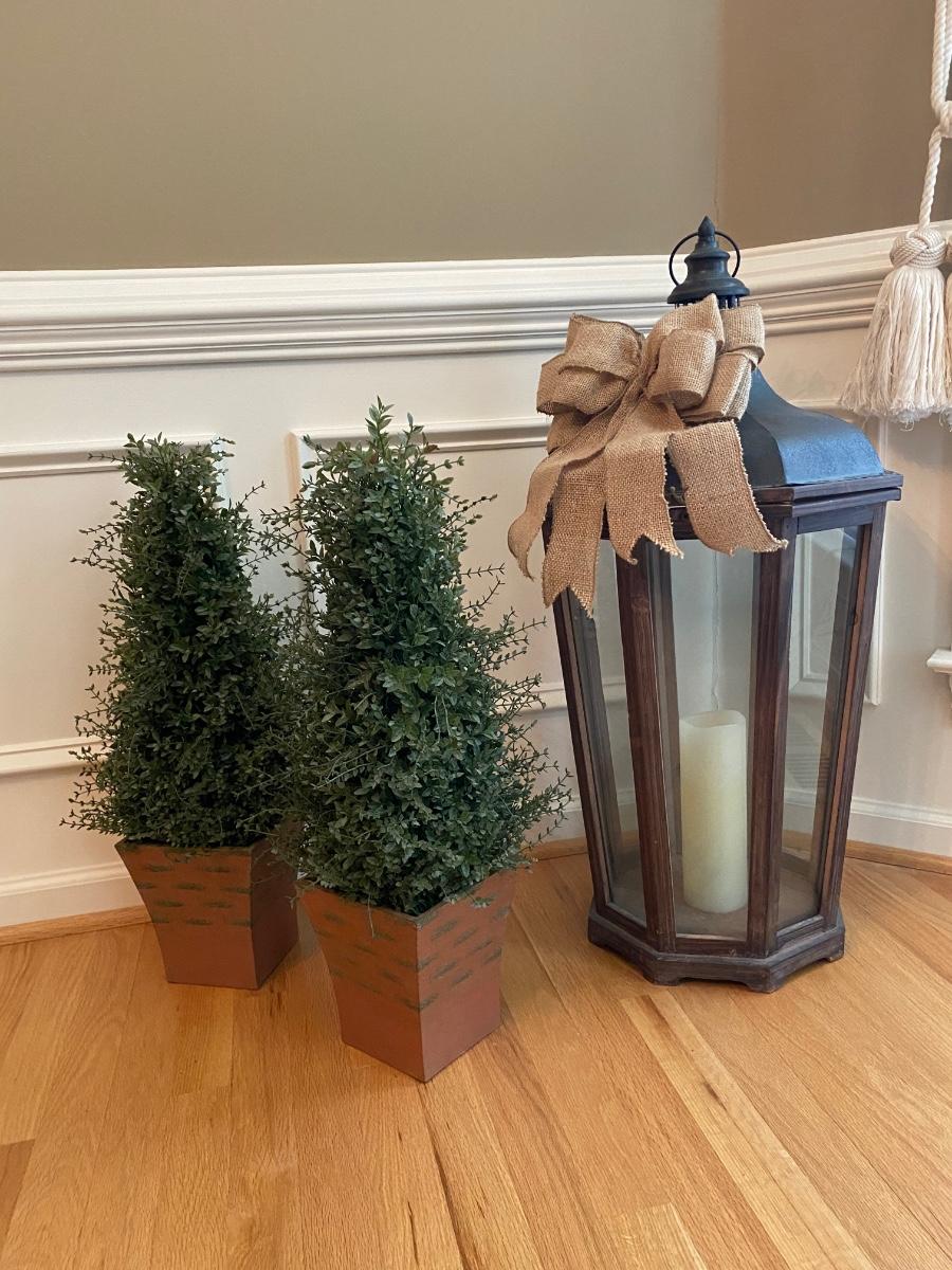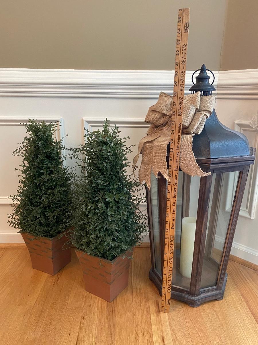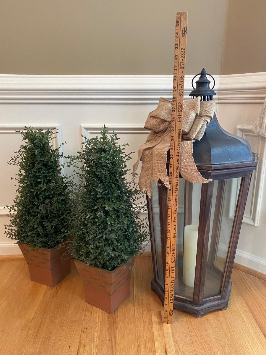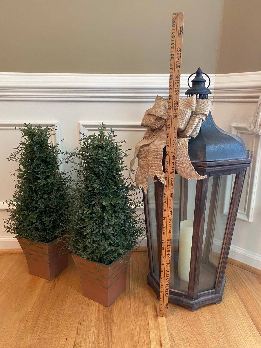 Large decorative lantern w/bow and battery operated candle. Two decorative trees. Please see all pictures as they are the best representation of the items. The pictures show condition, measurements if taken, and what is included in the lot. Due to the large amount that we photograph and the time frame, we are not always able to take measurements. All items unless noted, are pre-owned and have been used. If you purchased furniture, you must bring help. We do not allow one person to carry large furniture out on their own. Bring help, tools and a truck for the safety of our client’s homes, and your personal safety. Any damages that result to the property including walls, and floors due to moving of the furniture will be charged to the buyer. Company policy. Thank you.