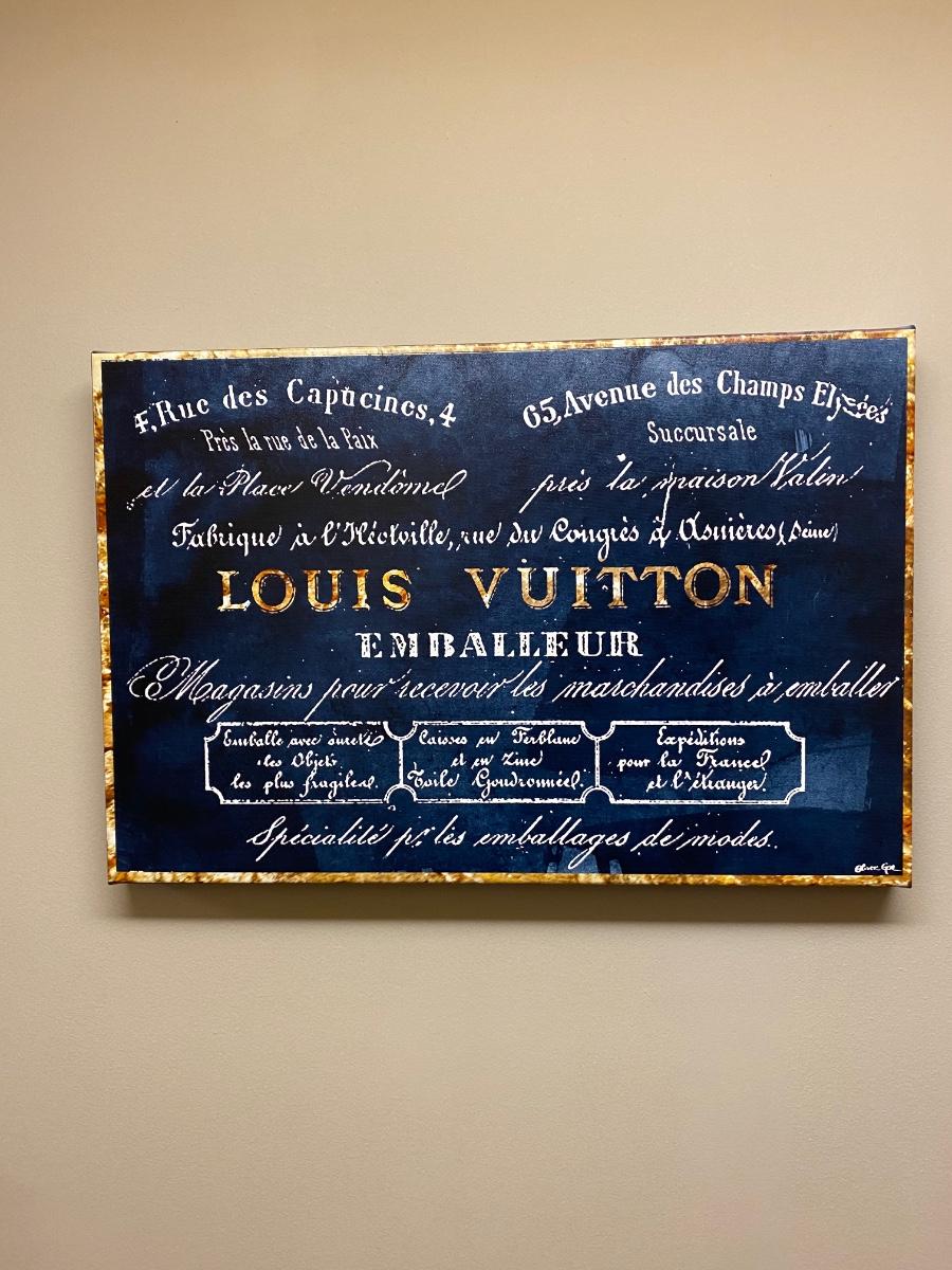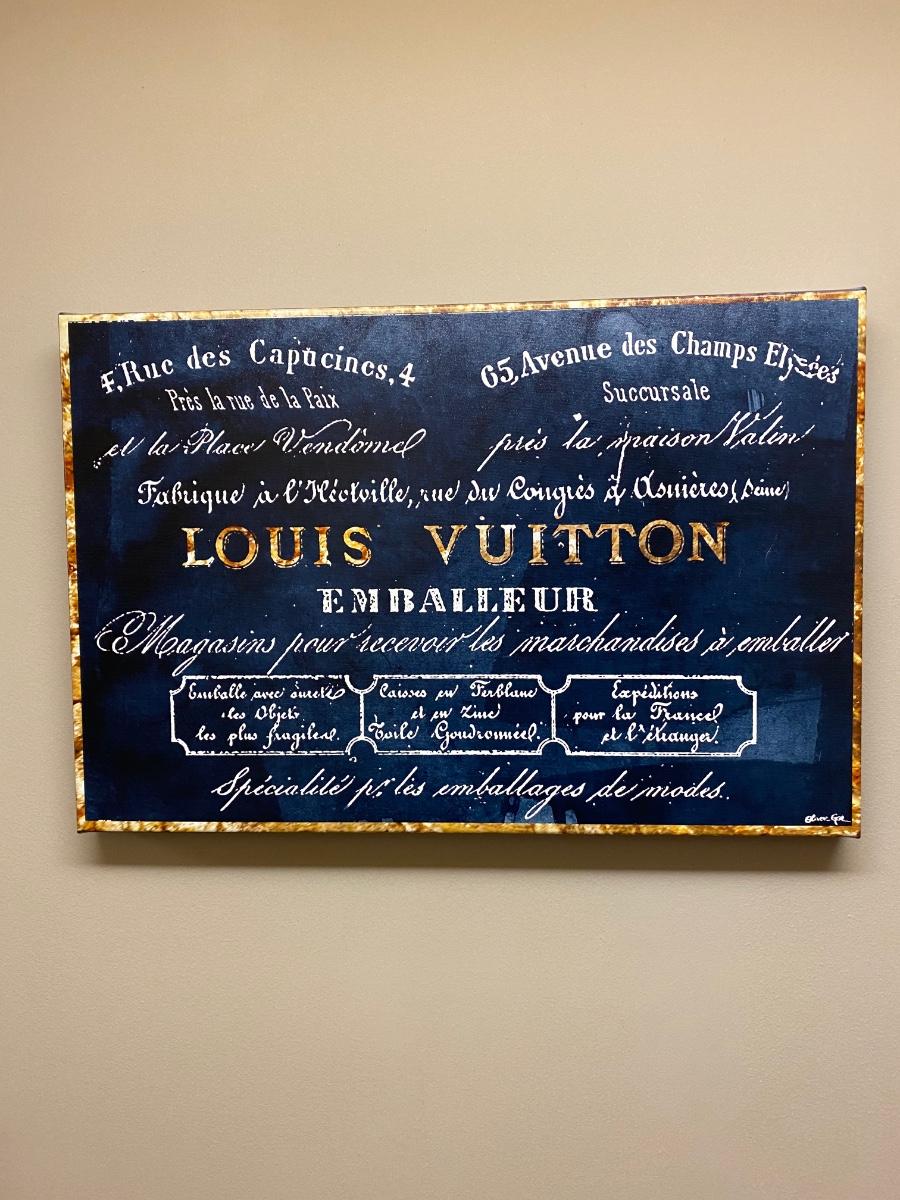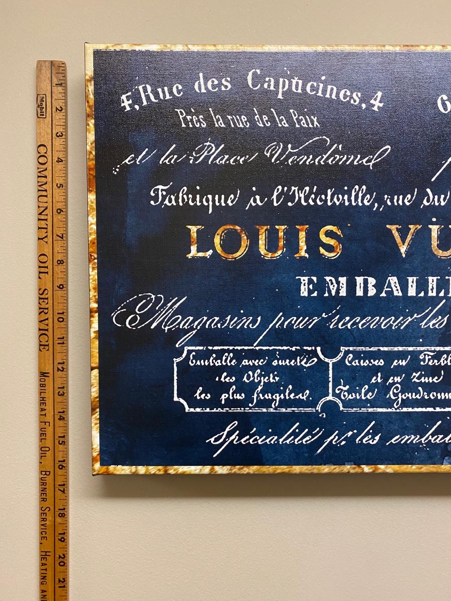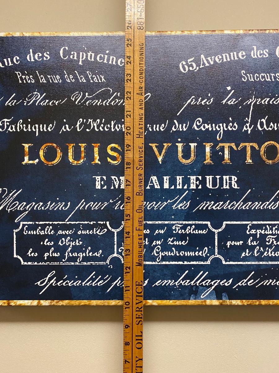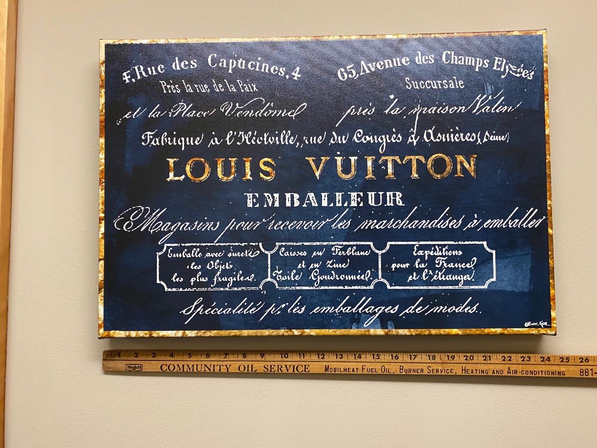 16x24 Canvas wall Print. Designer name Louis Vuitton in bold blue and gold tones. Official Oliver Gal artist certificate on back of print. Please see all pictures as they are the best representation of the items. The pictures show condition, measurements if taken, and what is included in the lot. Due to the large amount that we photograph and the time frame, we are not always able to take measurements. All items unless noted, are pre-owned and have been used. If you purchased furniture, you must bring help. We do not allow one person to carry large furniture out on their own. Bring help, tools and a truck for the safety of our client’s homes, and your personal safety. Any damages that result to the property including walls, and floors due to moving of the furniture will be charged to the buyer. Company policy. Thank you.