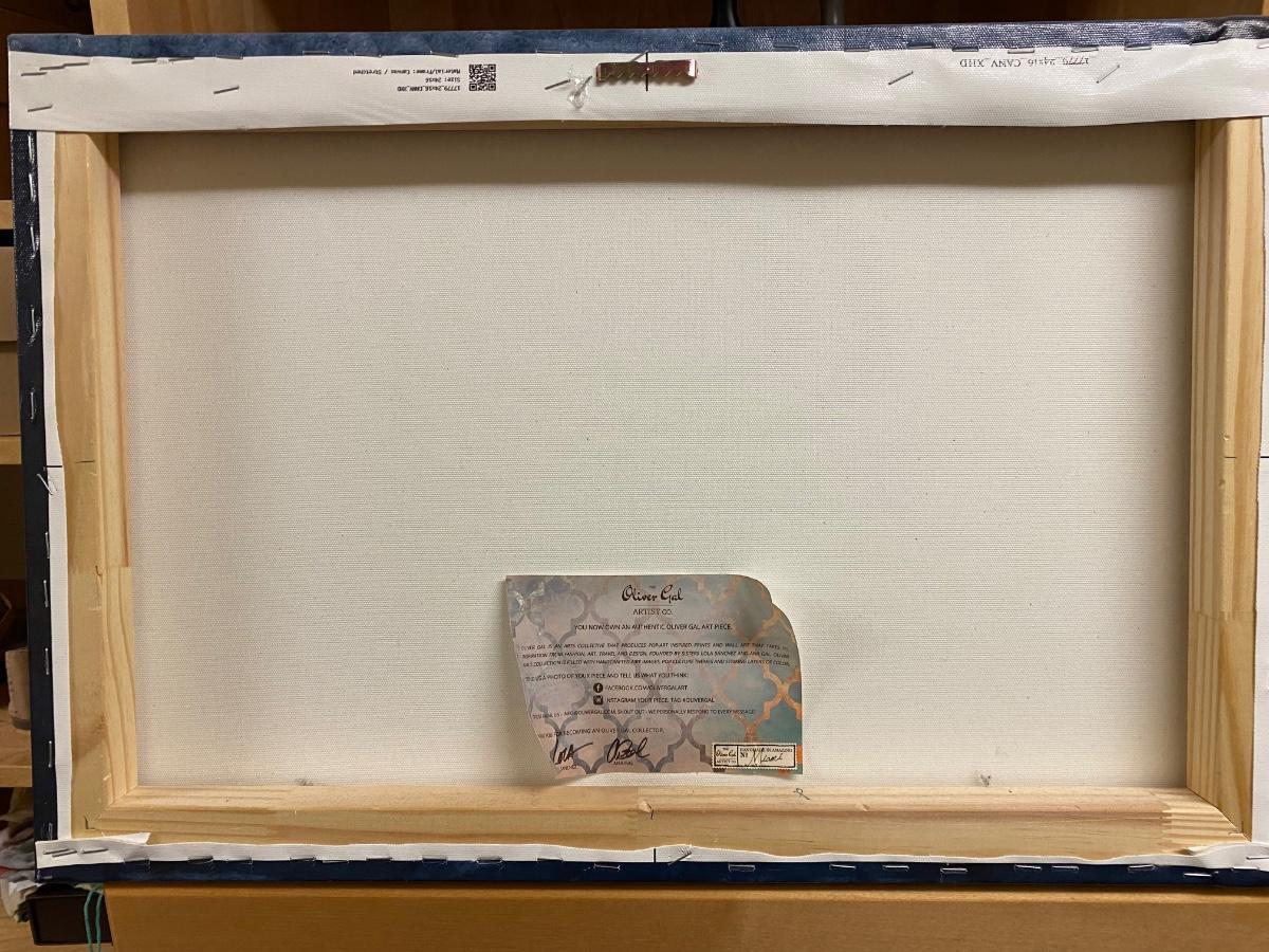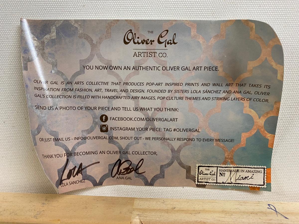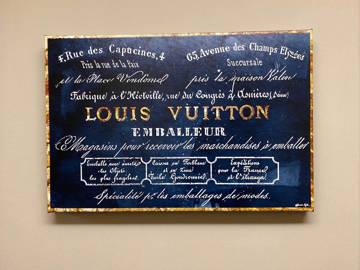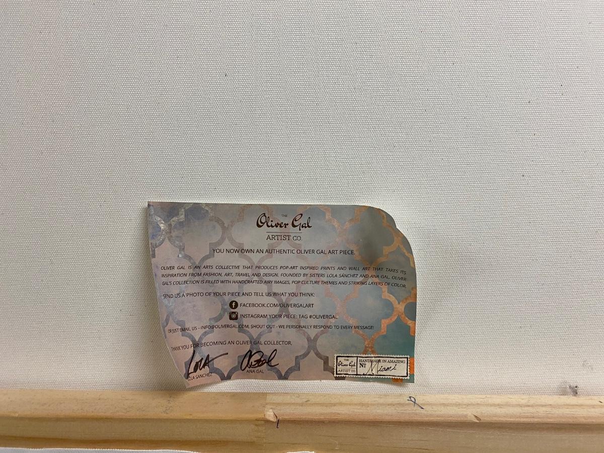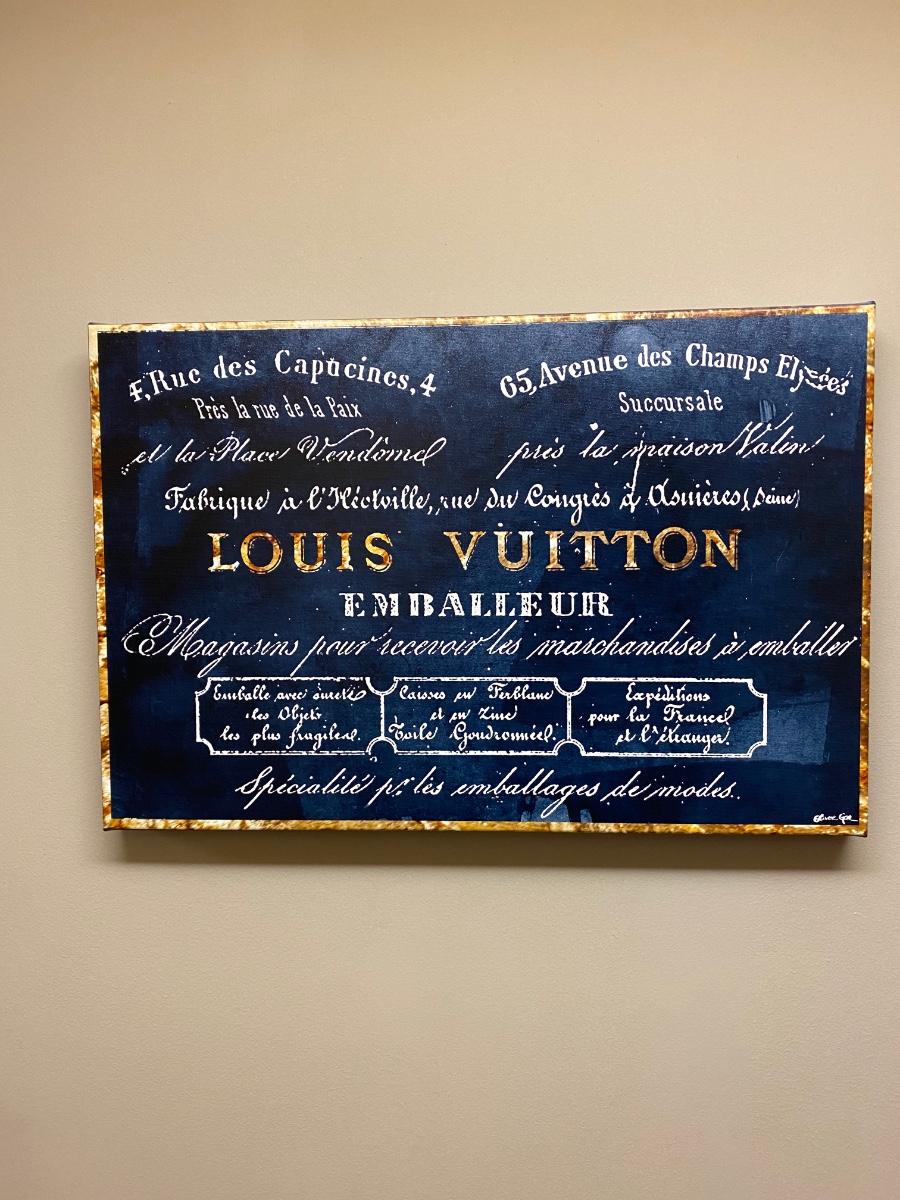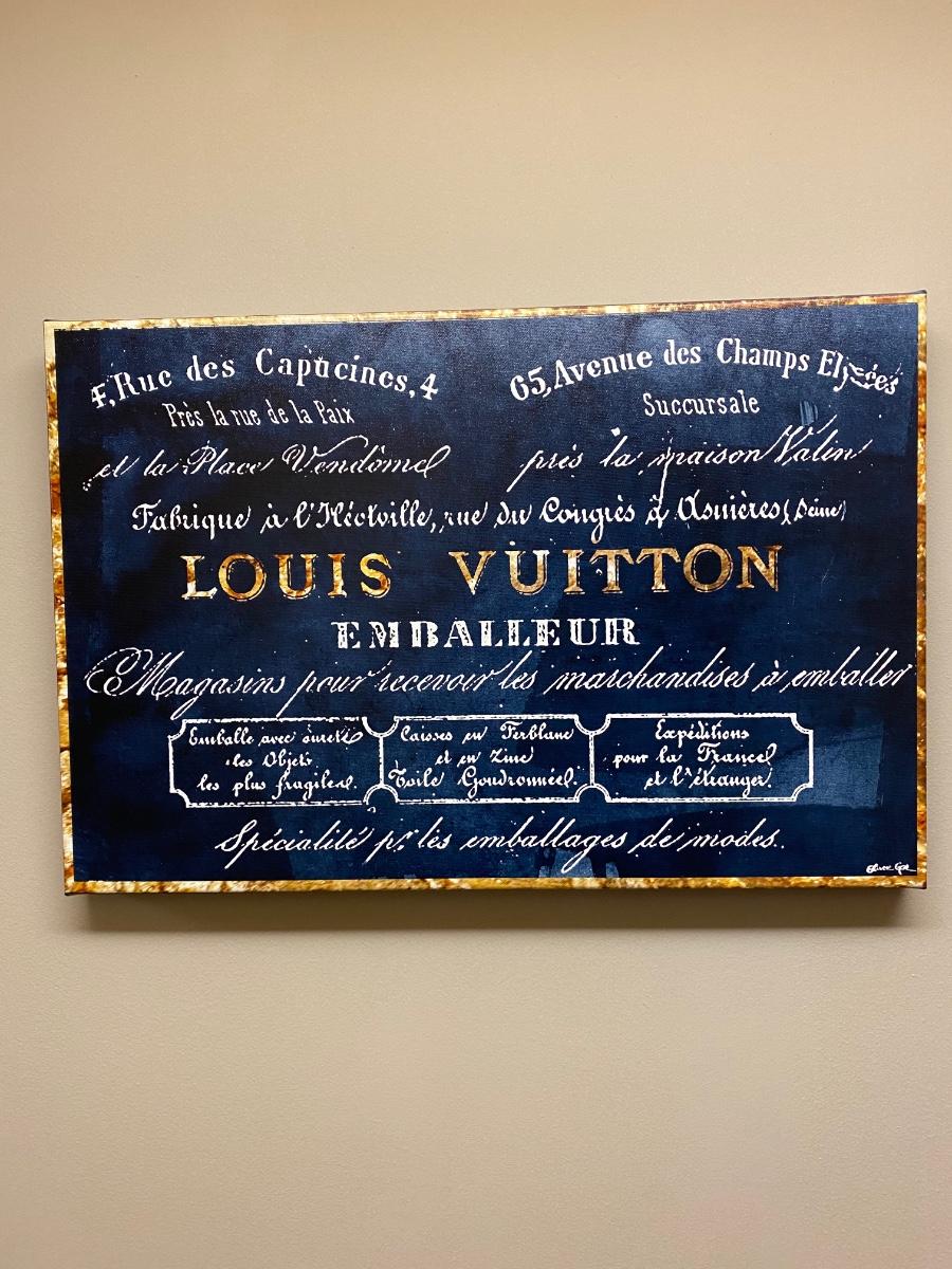 16x24 Canvas wall Print. Designer name Louis Vuitton in bold blue and gold tones. Official Oliver Gal artist certificate on back of print. Please see all pictures as they are the best representation of the items. The pictures show condition, measurements if taken, and what is included in the lot. Due to the large amount that we photograph and the time frame, we are not always able to take measurements. All items unless noted, are pre-owned and have been used. If you purchased furniture, you must bring help. We do not allow one person to carry large furniture out on their own. Bring help, tools and a truck for the safety of our client’s homes, and your personal safety. Any damages that result to the property including walls, and floors due to moving of the furniture will be charged to the buyer. Company policy. Thank you.