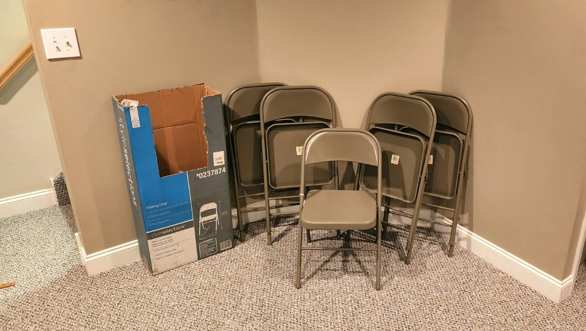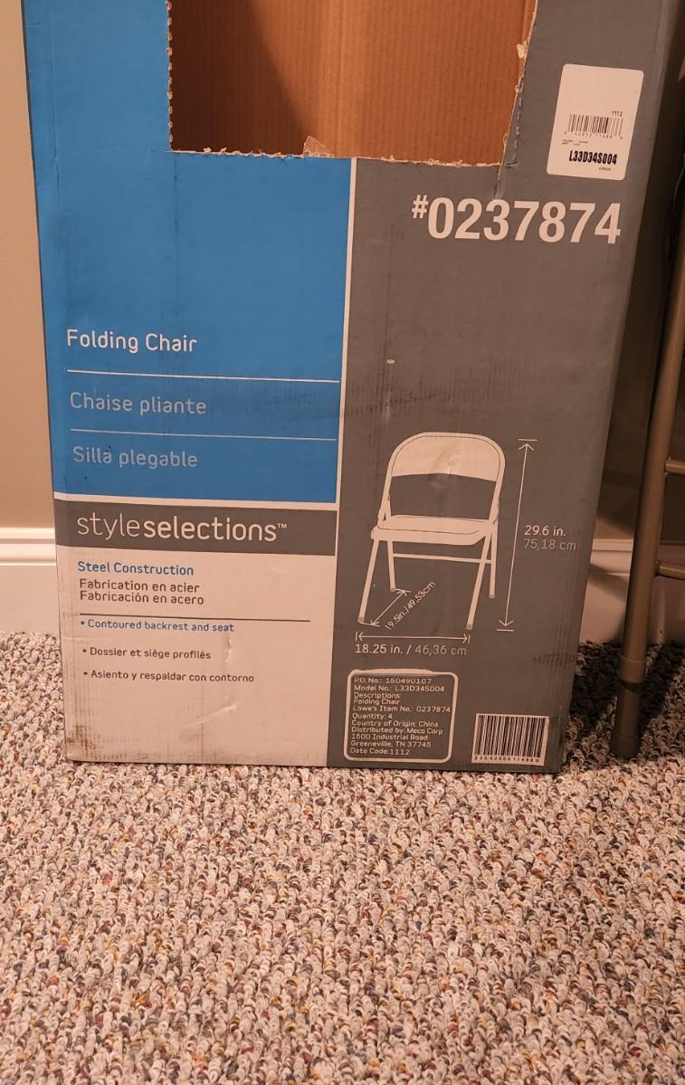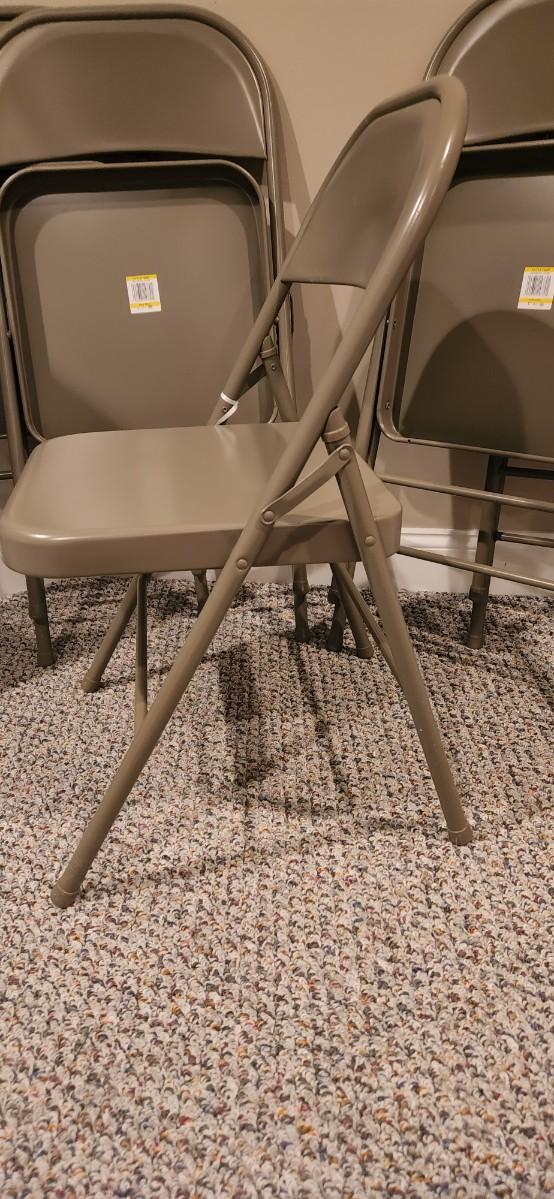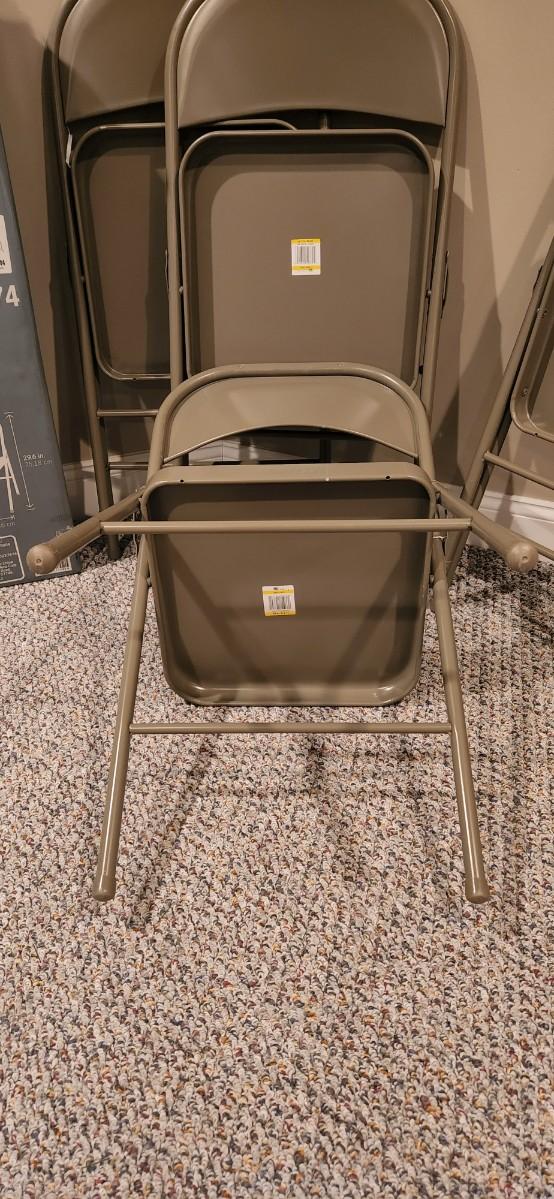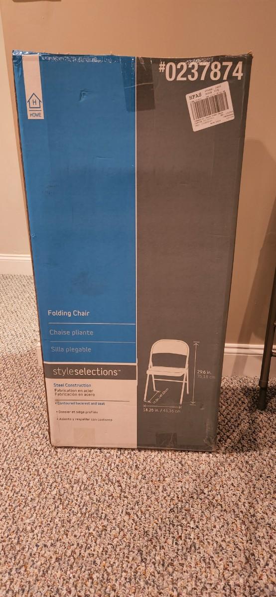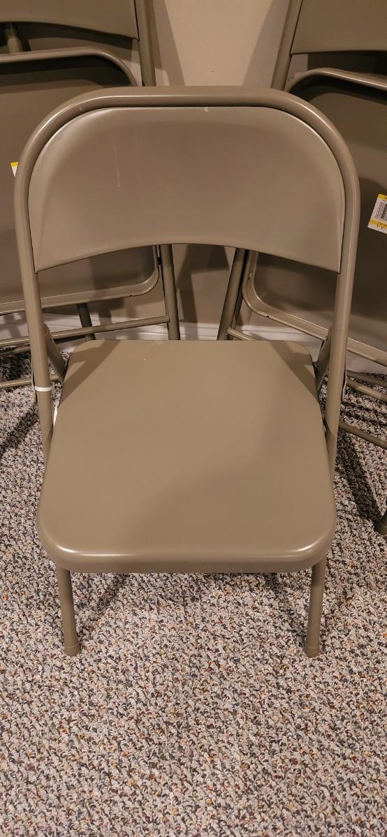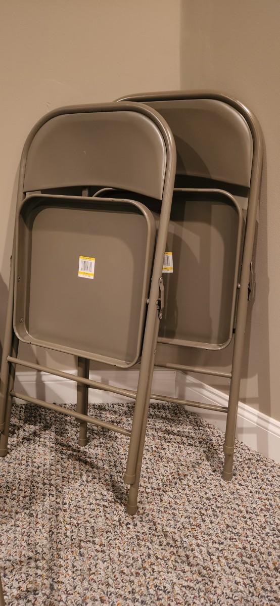 You are getting five like-new metal folding chairs. The chairs still come with the original box for easy storage. They measure 26.6"H x 18.25"W. Please see all pictures as they are the best representation of the items. The pictures show condition, measurements if taken, and what is included in the lot. Due to the large amount that we photograph and the time frame, we are not always able to take measurements. All items unless noted, are pre-owned and have been used. If you purchased furniture, you must bring help. We do not allow one person to carry large furniture out on their own. Bring help, tools and a truck for the safety of our client’s homes, and your personal safety. Any damages that result to the property including walls, and floors due to moving of the furniture will be charged to the buyer. Company policy. Thank you.