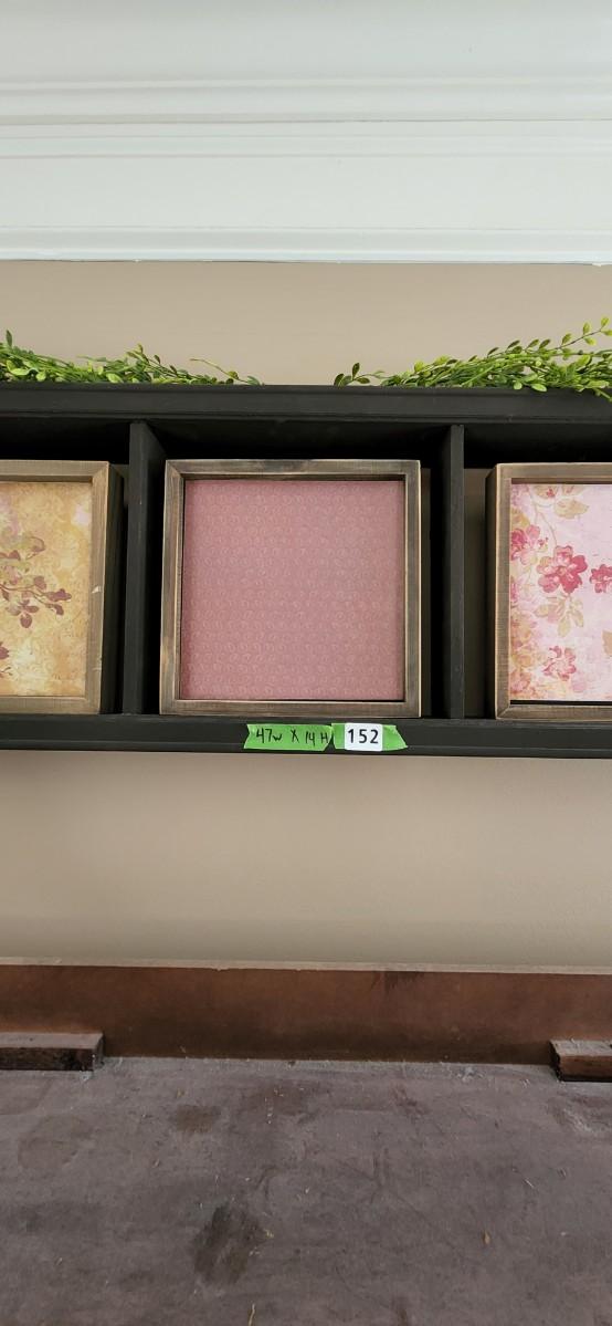 The three squares are separate pieces that have hooks on the backs so they can be independent of the three shelf frame. This is a great focal piece. Measures: 47W x 14H. Please see all pictures as they are the best representation of the items. The pictures show condition, measurements if taken, and what is included in the lot. Due to the large amount that we photograph and the time frame, we are not always able to take measurements. All items unless noted, are pre-owned and have been used. If you purchased furniture, you must bring help. We do not allow one person to carry large furniture out on their own. Bring help, tools and a truck for the safety of our client’s homes, and your personal safety. Any damages that result to the property including walls, and floors due to moving of the furniture will be charged to the buyer. Company policy. Thank you.